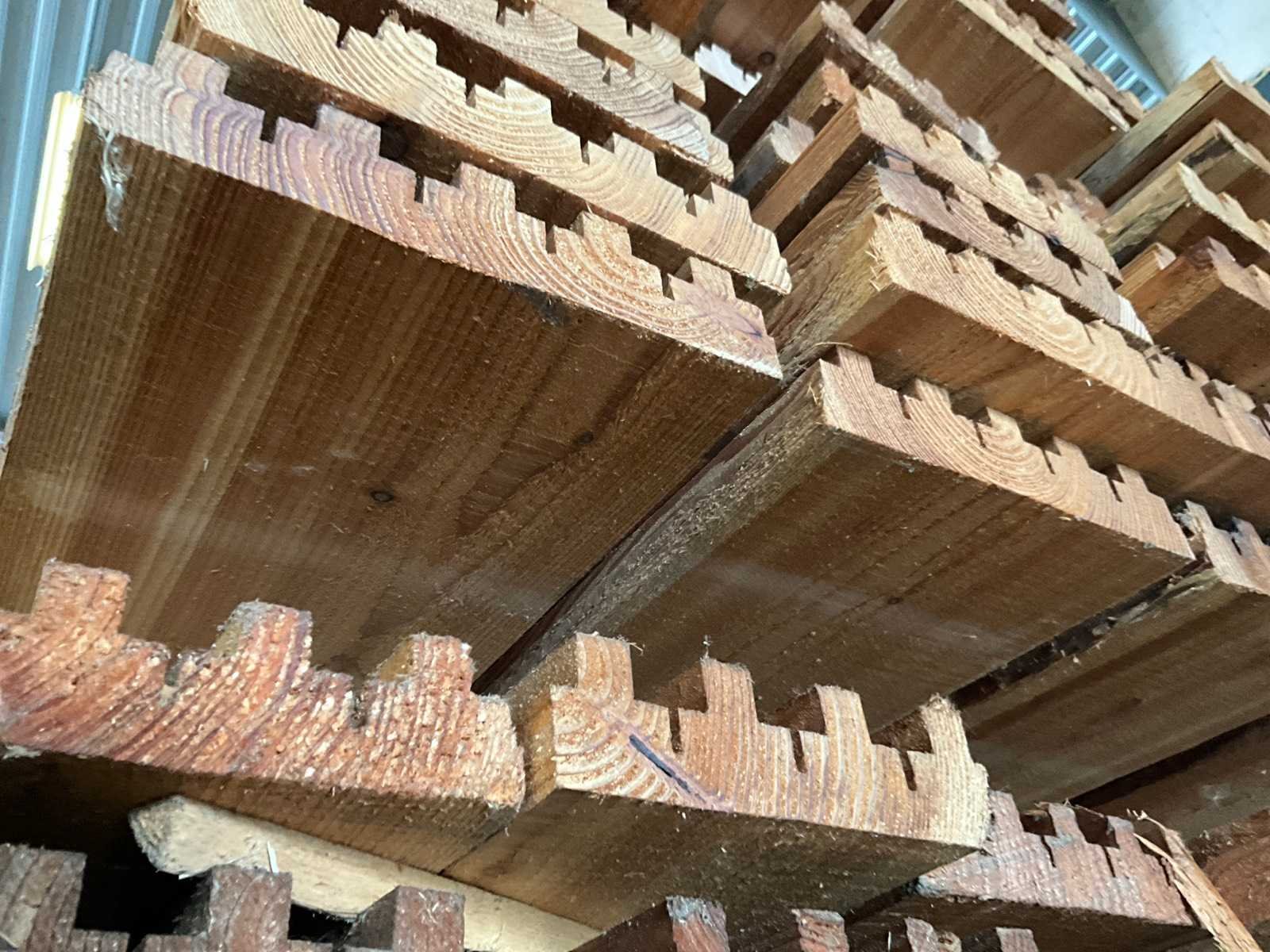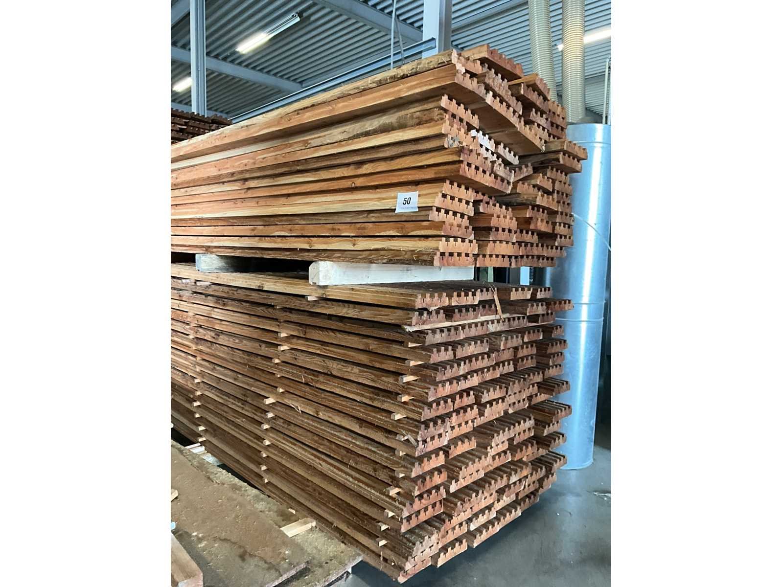 Ongeveer 145 planken, elk met een lengte van ongeveer 295 cm en in diverse breedtes waarvan voornamelijk van 13-23 cm. Dikte 5 cm en waarvan 1 zijde voorzien van uitsparingen. No Materiaal: 145