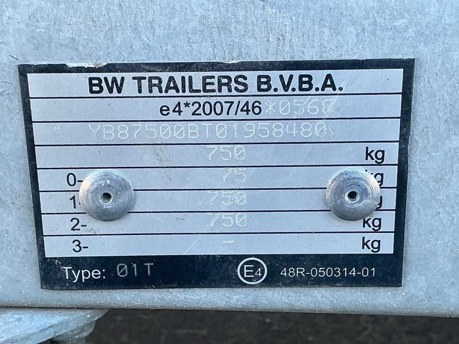 Zonder inhoud Nee Merk: BW-Trailers Type: 01T Model: 2-assige Chassisnummer: YB87500BT01958480 Aantal assen: 2 Laadbak afmeting l: 250cm Laadbak afmeting b: 150cm Laadvermogen: 750kg