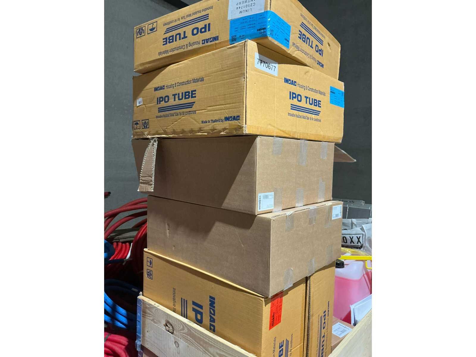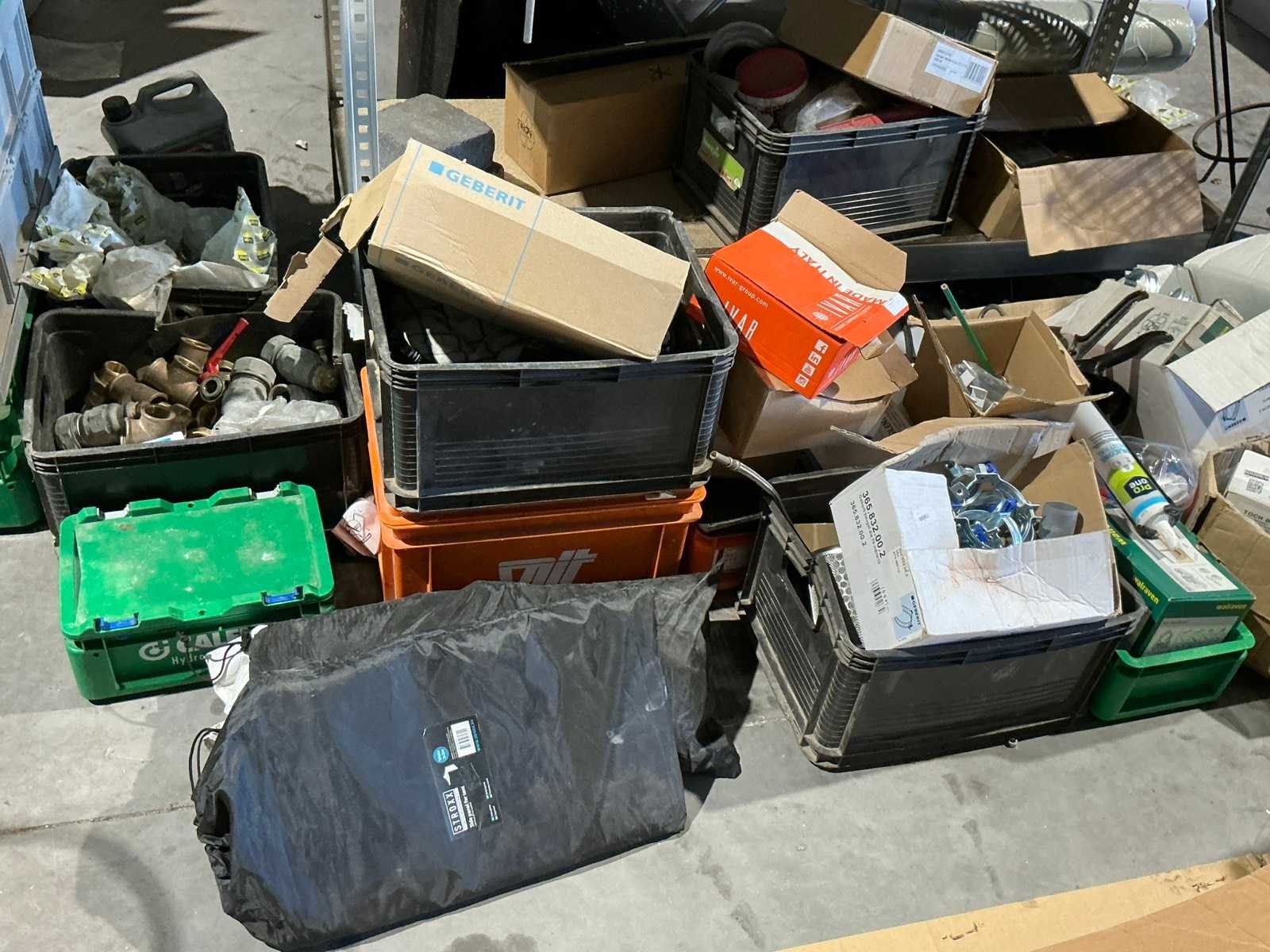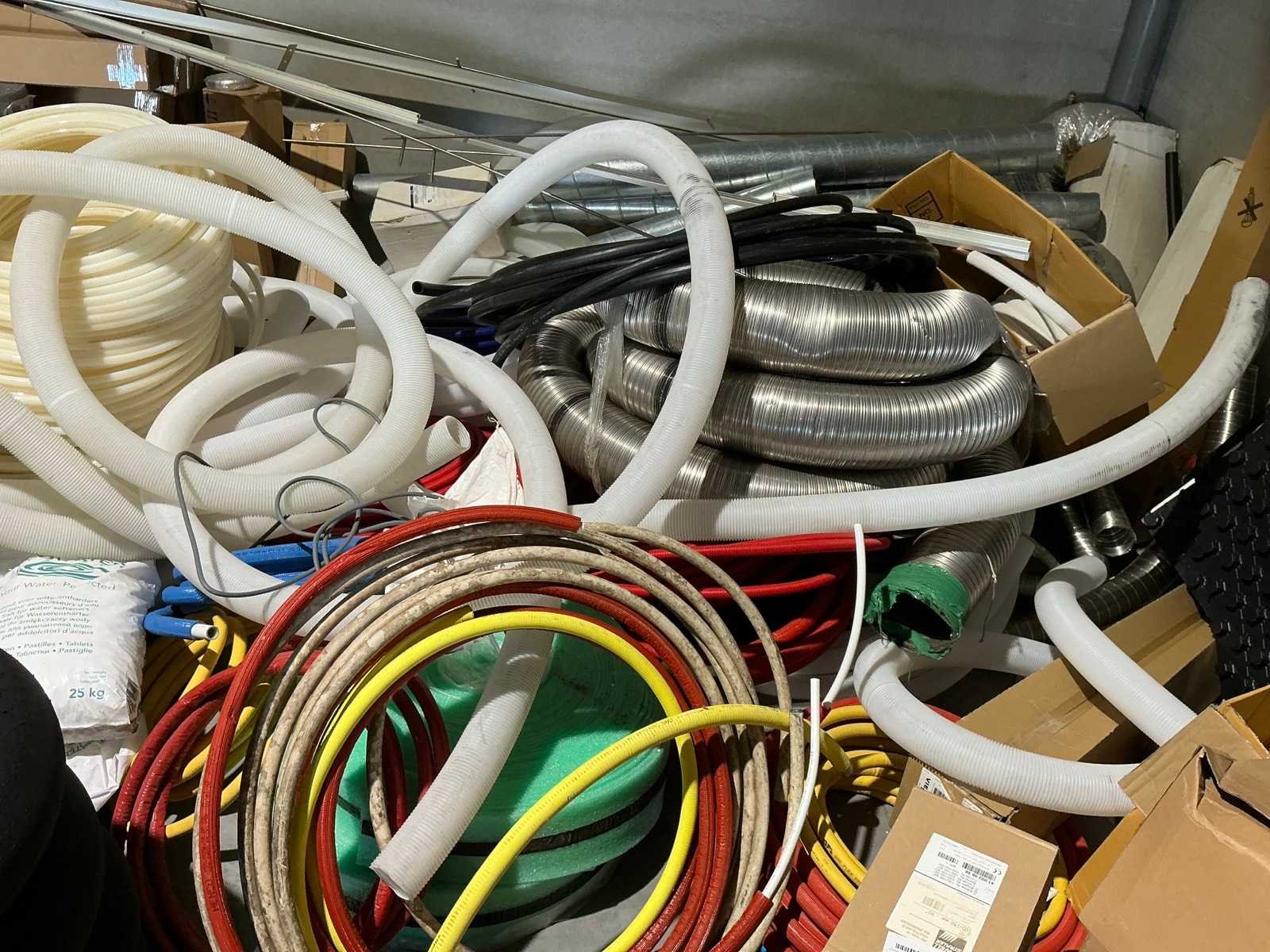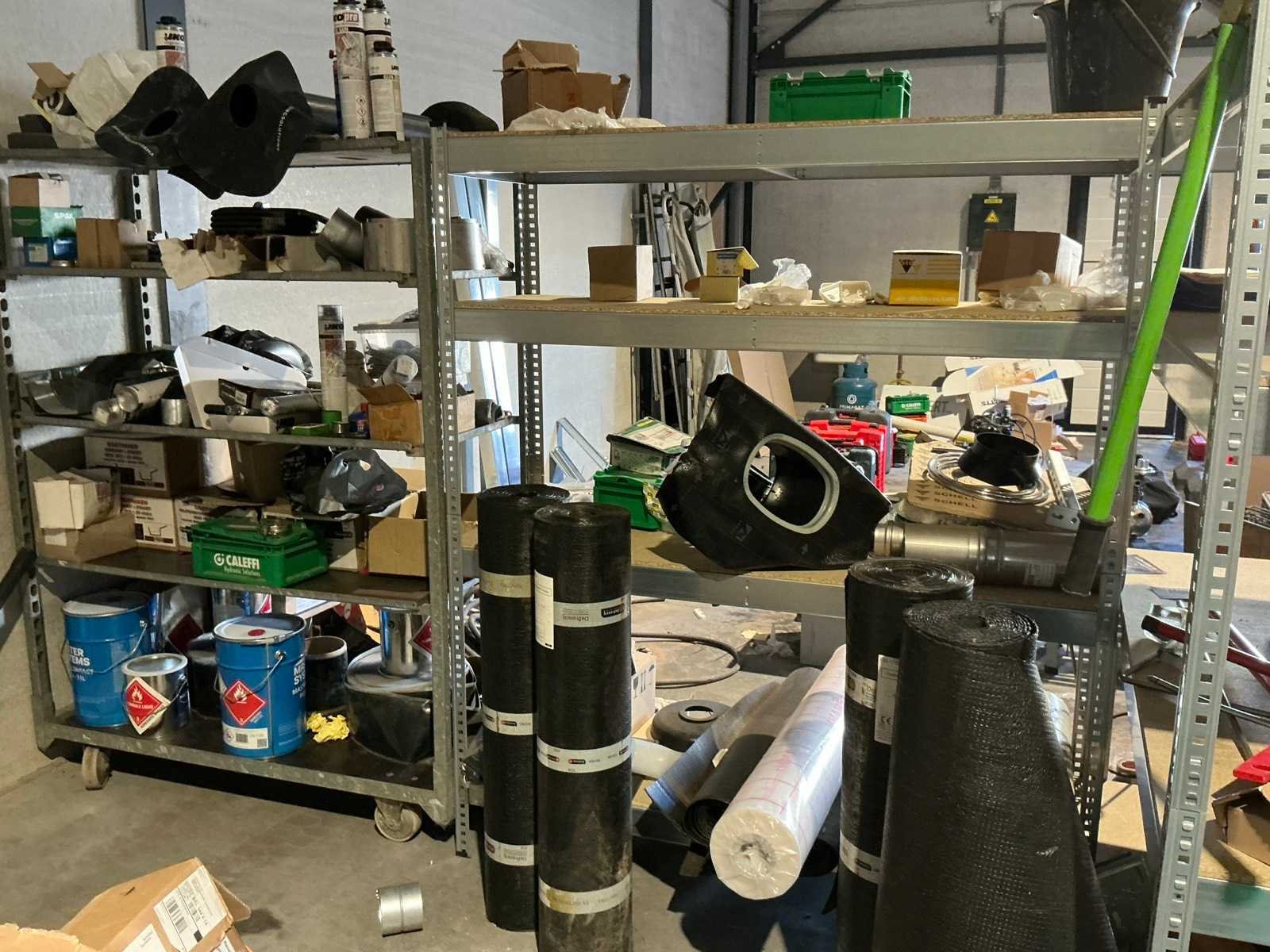 Waaronder bestaande uit: grote partij diverse flexibele buizen waaronder airco buis, rookafvoerbuizen en waterbuizen, Diverse pvc koppel- en aansluitstukken, 7 dozen Indac Ipo tube waaronder 3/8”x0.8mm - 50m in originele verpakking, Partij divers bevestigingsmateriaal waaronder pluggen, schroeven en ankers liggende in drie diverse kunststof opbergbakken, 7 rollen roofing Defranck waaronder 2 reeds aangesproken compleet met twee rollenfolie WIESSMANN, 1 kunststof nokpan Lengte ca 200cm, 7 OSB platen Tand en groef, Partij diverse isolatie waaronder 10 isolatiebanden VIESSMAN N 150 millimeter/8 mm, 10 dozen inhoudende 10 isolatieexpansie profielen VIESSMANN en 8 isolatiepanelen IKO Enertherm compleet met enige kunststof vloerverwarmingsplaten, 3 metalen magazijnrekken Ca 150 x 50 x 189cm, Demonteerbaar, Inhoudende partij diverse aannemers-/installateurbenodigdheden waaronder kranen en onderdelen, kunststof aansluitstukken, bevestigingsmaterialen waaronder schroeven, Goothaken, klemmen en dakafwerkingsstroken, Compleet met enige diverse reeds aangesproken potten daklijm en 1 houten bijzettafel, Uitgezonderd genummerde kavels en eigendomsvoorbehoud, Afgifte volgens aanwijzing Nee