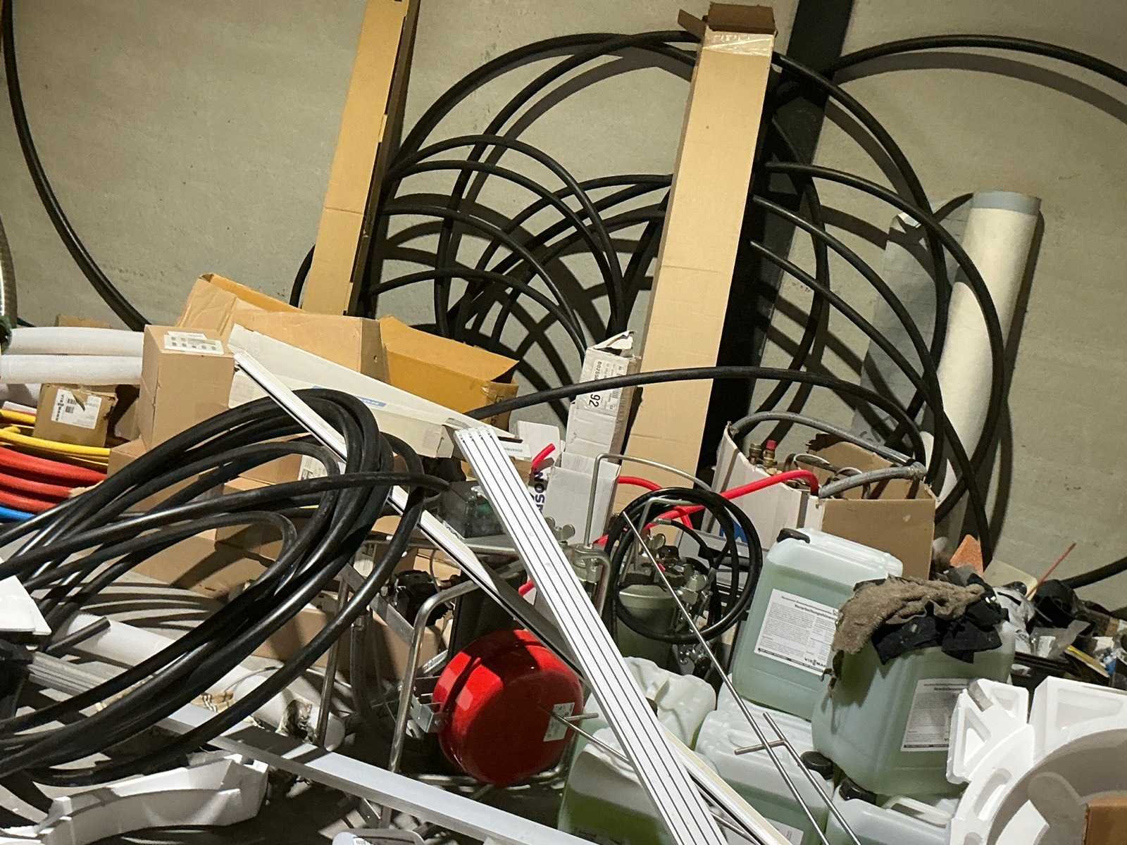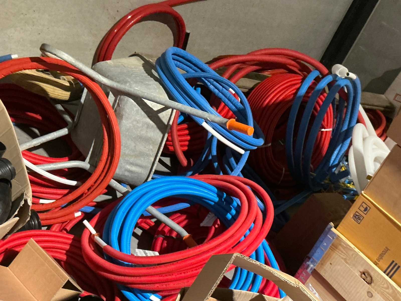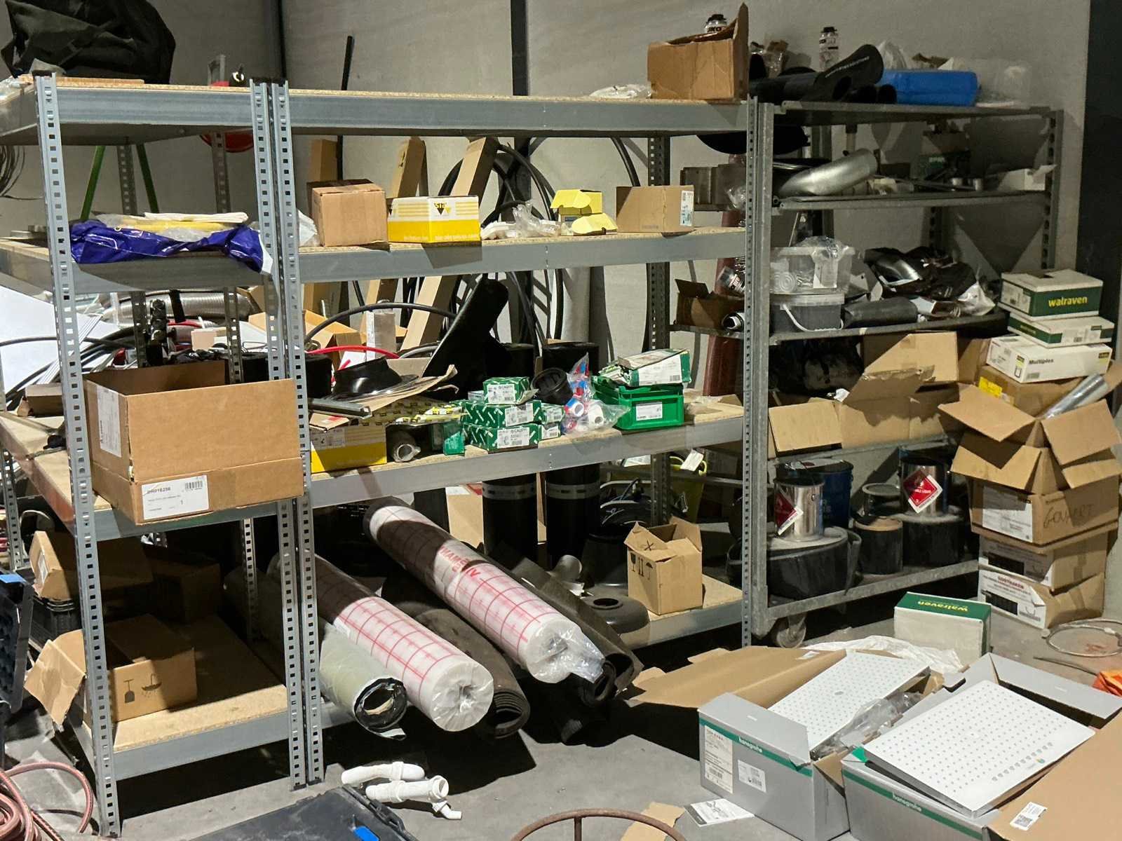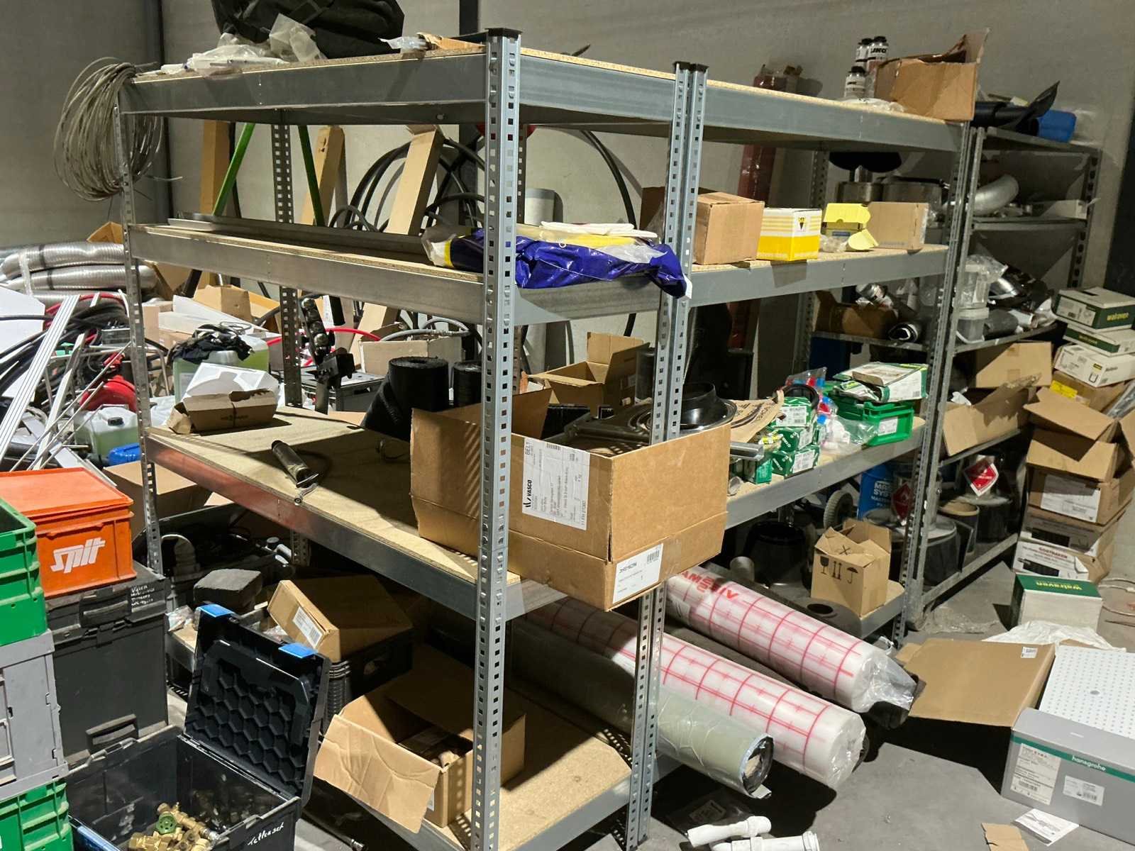 Waaronder bestaande uit: grote partij diverse flexibele buizen waaronder airco buis, rookafvoerbuizen en waterbuizen, Diverse pvc koppel- en aansluitstukken, 7 dozen Indac Ipo tube waaronder 3/8”x0.8mm - 50m in originele verpakking, Partij divers bevestigingsmateriaal waaronder pluggen, schroeven en ankers liggende in drie diverse kunststof opbergbakken, 7 rollen roofing Defranck waaronder 2 reeds aangesproken compleet met twee rollenfolie WIESSMANN, 1 kunststof nokpan Lengte ca 200cm, 7 OSB platen Tand en groef, Partij diverse isolatie waaronder 10 isolatiebanden VIESSMAN N 150 millimeter/8 mm, 10 dozen inhoudende 10 isolatieexpansie profielen VIESSMANN en 8 isolatiepanelen IKO Enertherm compleet met enige kunststof vloerverwarmingsplaten, 3 metalen magazijnrekken Ca 150 x 50 x 189cm, Demonteerbaar, Inhoudende partij diverse aannemers-/installateurbenodigdheden waaronder kranen en onderdelen, kunststof aansluitstukken, bevestigingsmaterialen waaronder schroeven, Goothaken, klemmen en dakafwerkingsstroken, Compleet met enige diverse reeds aangesproken potten daklijm en 1 houten bijzettafel, Uitgezonderd genummerde kavels en eigendomsvoorbehoud, Afgifte volgens aanwijzing Nee