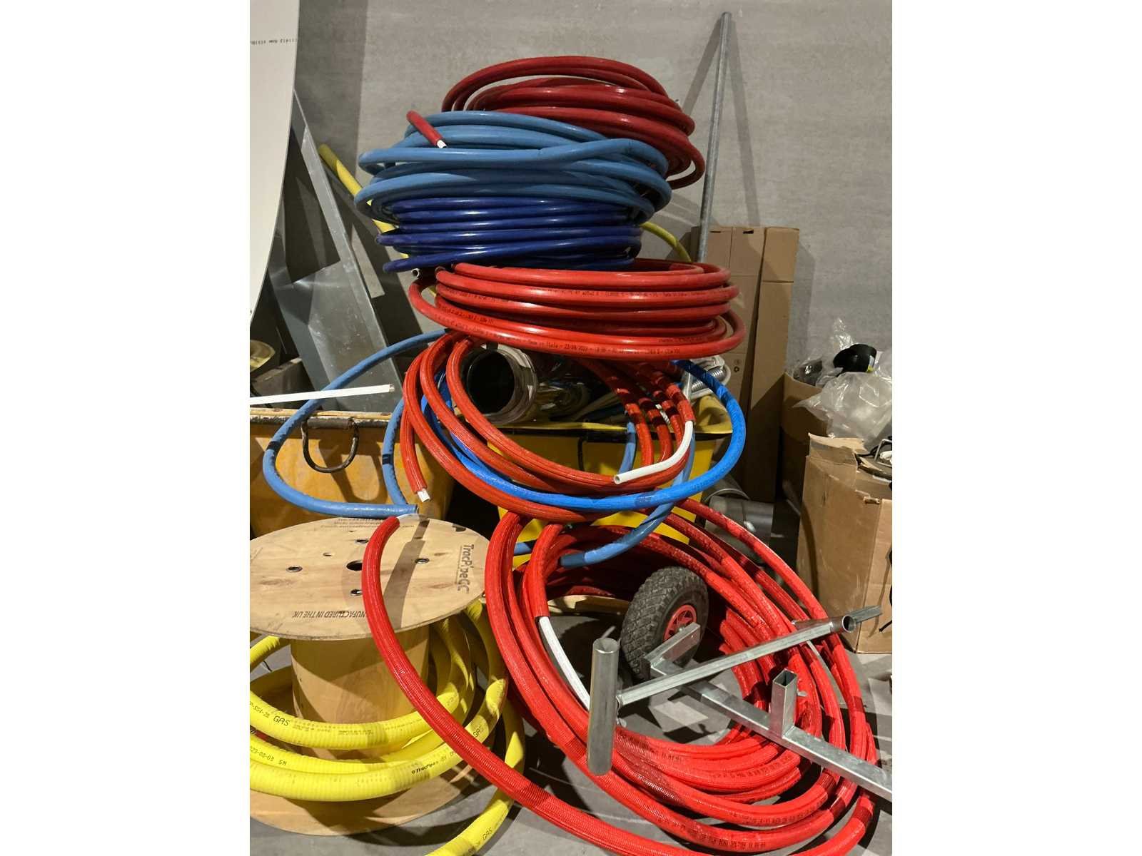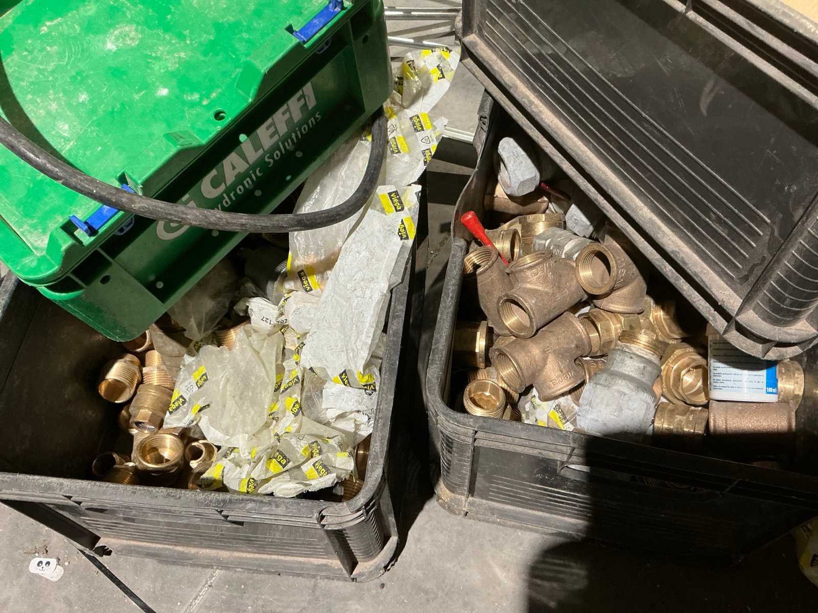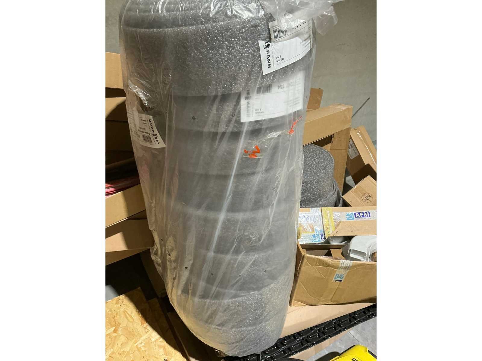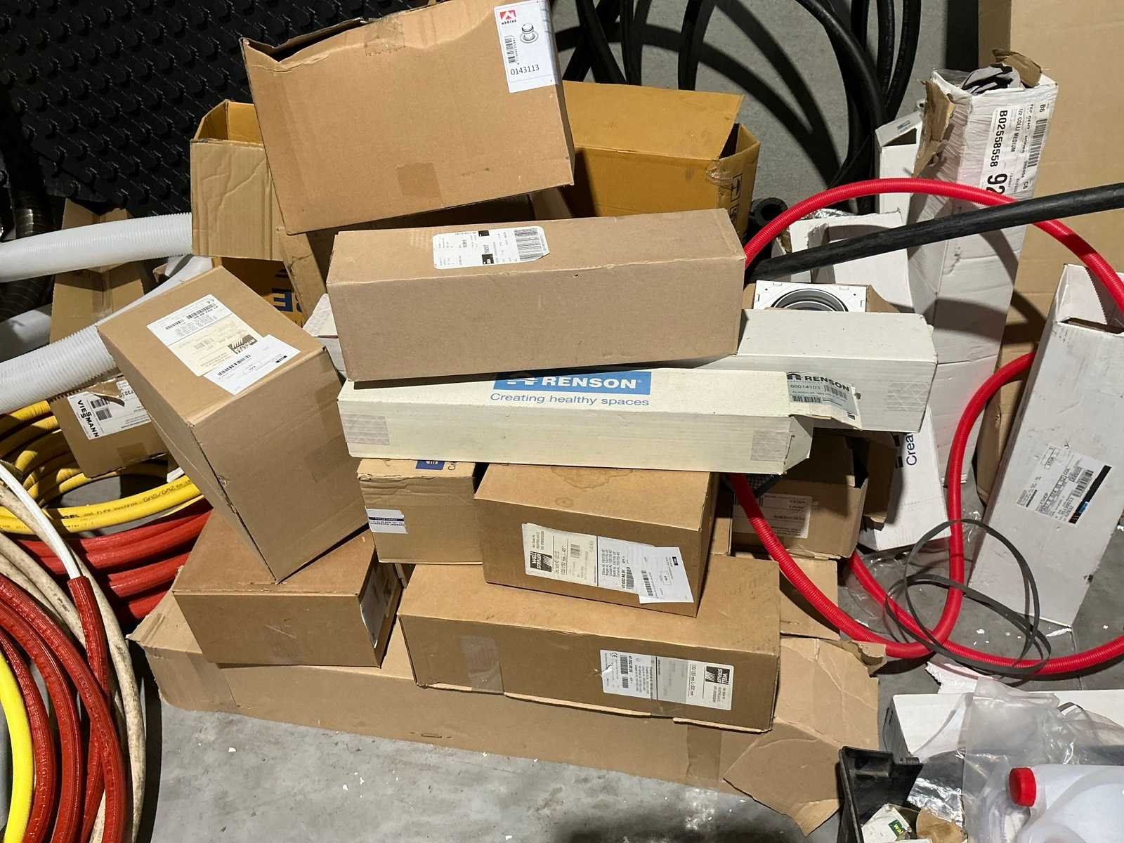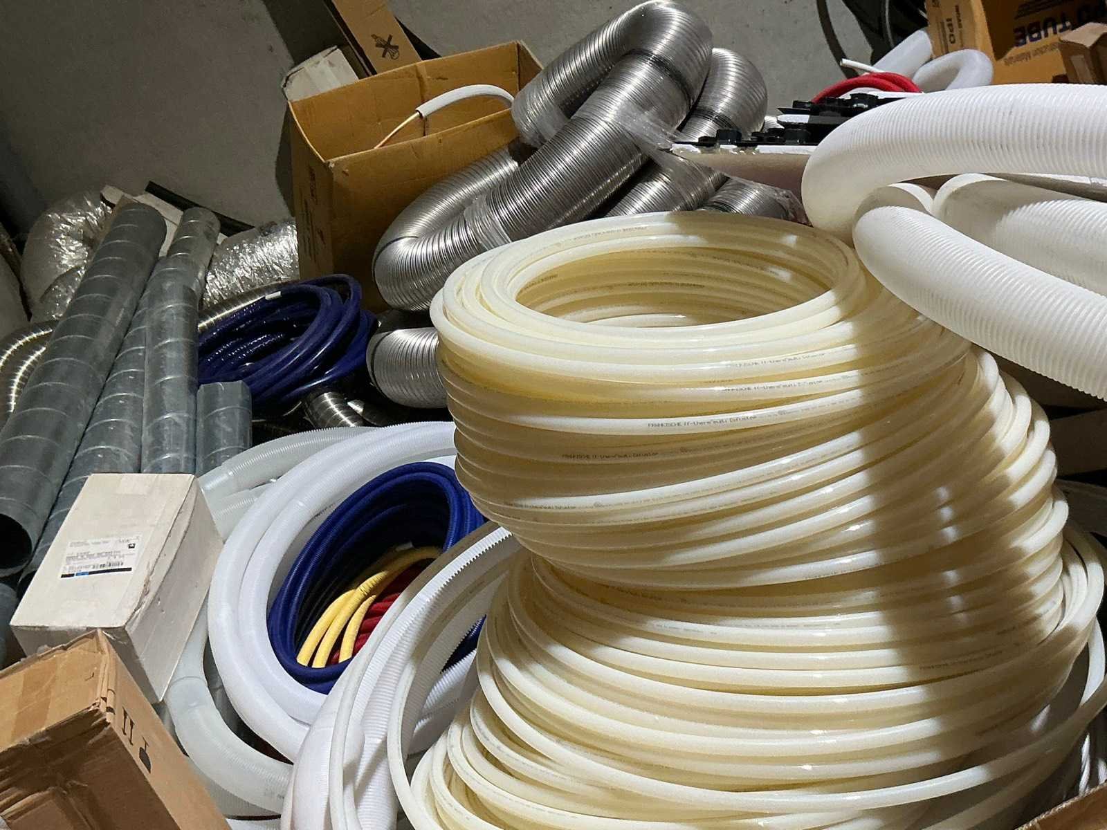 Waaronder bestaande uit: grote partij diverse flexibele buizen waaronder airco buis, rookafvoerbuizen en waterbuizen, Diverse pvc koppel- en aansluitstukken, 7 dozen Indac Ipo tube waaronder 3/8”x0.8mm - 50m in originele verpakking, Partij divers bevestigingsmateriaal waaronder pluggen, schroeven en ankers liggende in drie diverse kunststof opbergbakken, 7 rollen roofing Defranck waaronder 2 reeds aangesproken compleet met twee rollenfolie WIESSMANN, 1 kunststof nokpan Lengte ca 200cm, 7 OSB platen Tand en groef, Partij diverse isolatie waaronder 10 isolatiebanden VIESSMAN N 150 millimeter/8 mm, 10 dozen inhoudende 10 isolatieexpansie profielen VIESSMANN en 8 isolatiepanelen IKO Enertherm compleet met enige kunststof vloerverwarmingsplaten, 3 metalen magazijnrekken Ca 150 x 50 x 189cm, Demonteerbaar, Inhoudende partij diverse aannemers-/installateurbenodigdheden waaronder kranen en onderdelen, kunststof aansluitstukken, bevestigingsmaterialen waaronder schroeven, Goothaken, klemmen en dakafwerkingsstroken, Compleet met enige diverse reeds aangesproken potten daklijm en 1 houten bijzettafel, Uitgezonderd genummerde kavels en eigendomsvoorbehoud, Afgifte volgens aanwijzing Nee