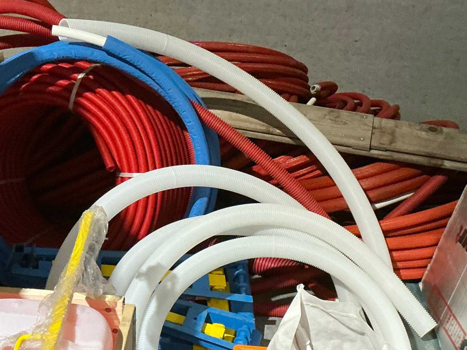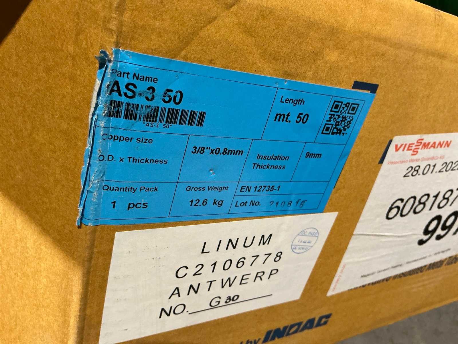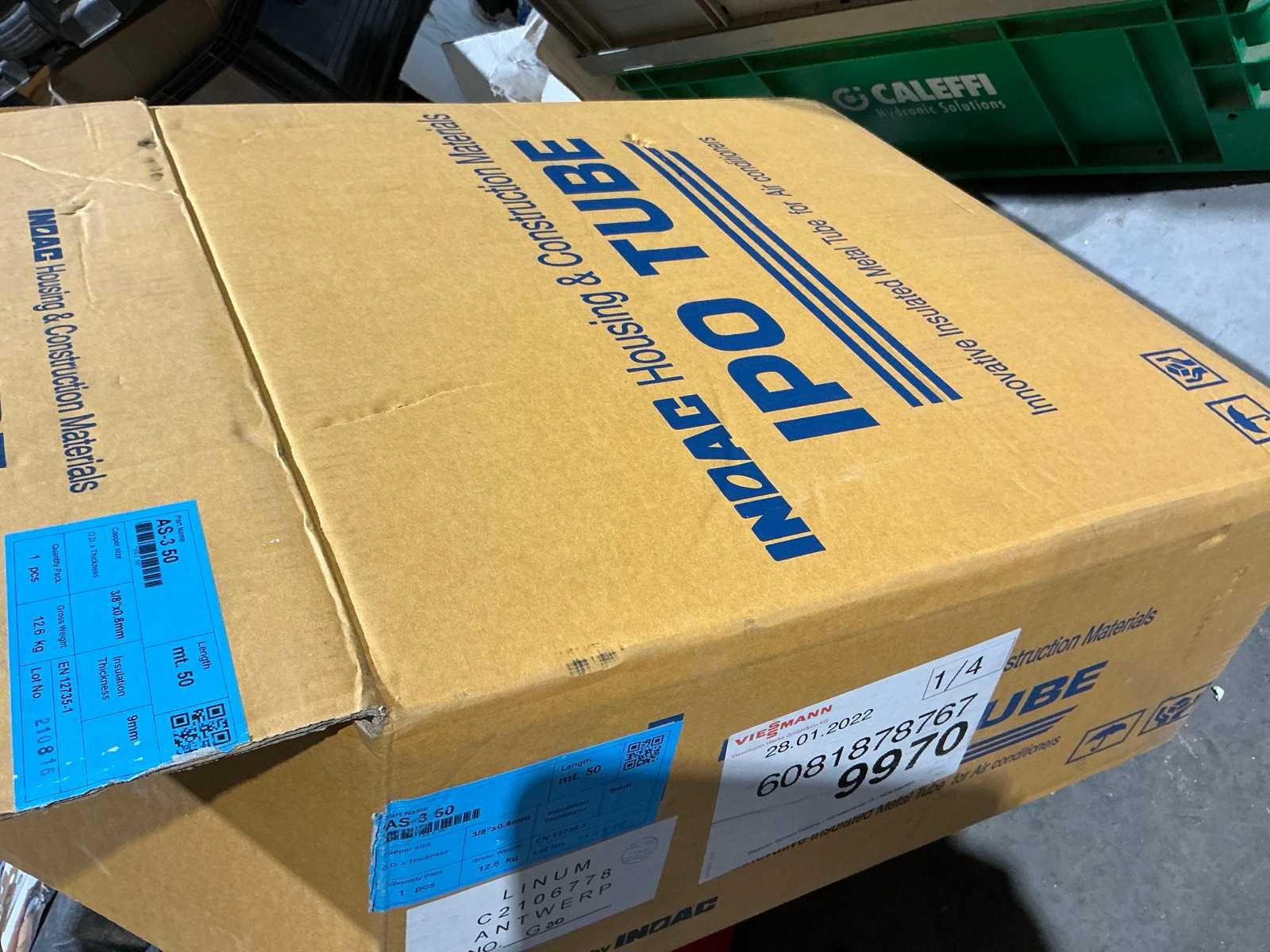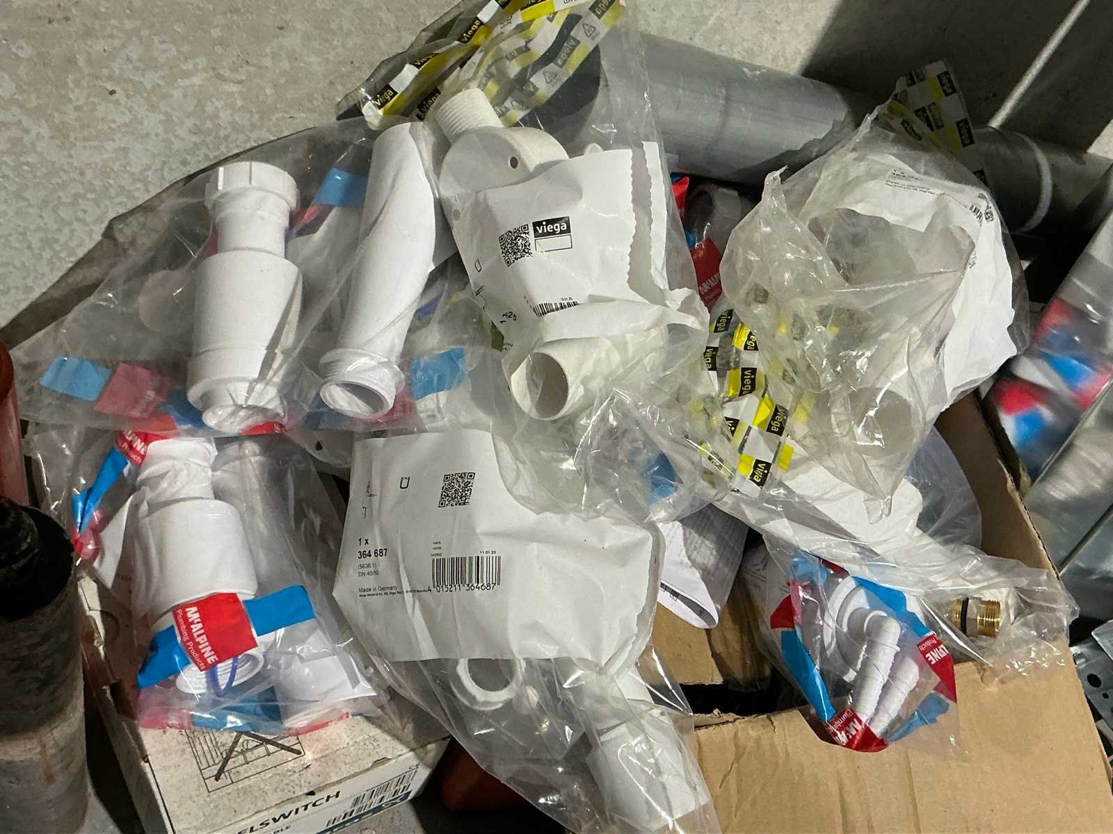 Waaronder bestaande uit: grote partij diverse flexibele buizen waaronder airco buis, rookafvoerbuizen en waterbuizen, Diverse pvc koppel- en aansluitstukken, 7 dozen Indac Ipo tube waaronder 3/8”x0.8mm - 50m in originele verpakking, Partij divers bevestigingsmateriaal waaronder pluggen, schroeven en ankers liggende in drie diverse kunststof opbergbakken, 7 rollen roofing Defranck waaronder 2 reeds aangesproken compleet met twee rollenfolie WIESSMANN, 1 kunststof nokpan Lengte ca 200cm, 7 OSB platen Tand en groef, Partij diverse isolatie waaronder 10 isolatiebanden VIESSMAN N 150 millimeter/8 mm, 10 dozen inhoudende 10 isolatieexpansie profielen VIESSMANN en 8 isolatiepanelen IKO Enertherm compleet met enige kunststof vloerverwarmingsplaten, 3 metalen magazijnrekken Ca 150 x 50 x 189cm, Demonteerbaar, Inhoudende partij diverse aannemers-/installateurbenodigdheden waaronder kranen en onderdelen, kunststof aansluitstukken, bevestigingsmaterialen waaronder schroeven, Goothaken, klemmen en dakafwerkingsstroken, Compleet met enige diverse reeds aangesproken potten daklijm en 1 houten bijzettafel, Uitgezonderd genummerde kavels en eigendomsvoorbehoud, Afgifte volgens aanwijzing Nee