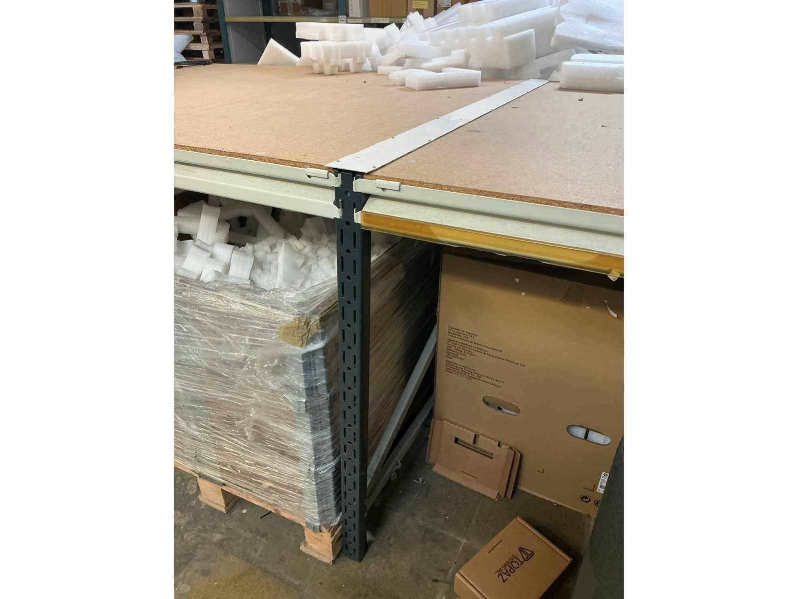 Voorzien van spaanplaat werkblad, zonder inhoud Nee Lengte: 410cm Breedte: 130cm Hoogte: 100cm Materiaal: Metaal