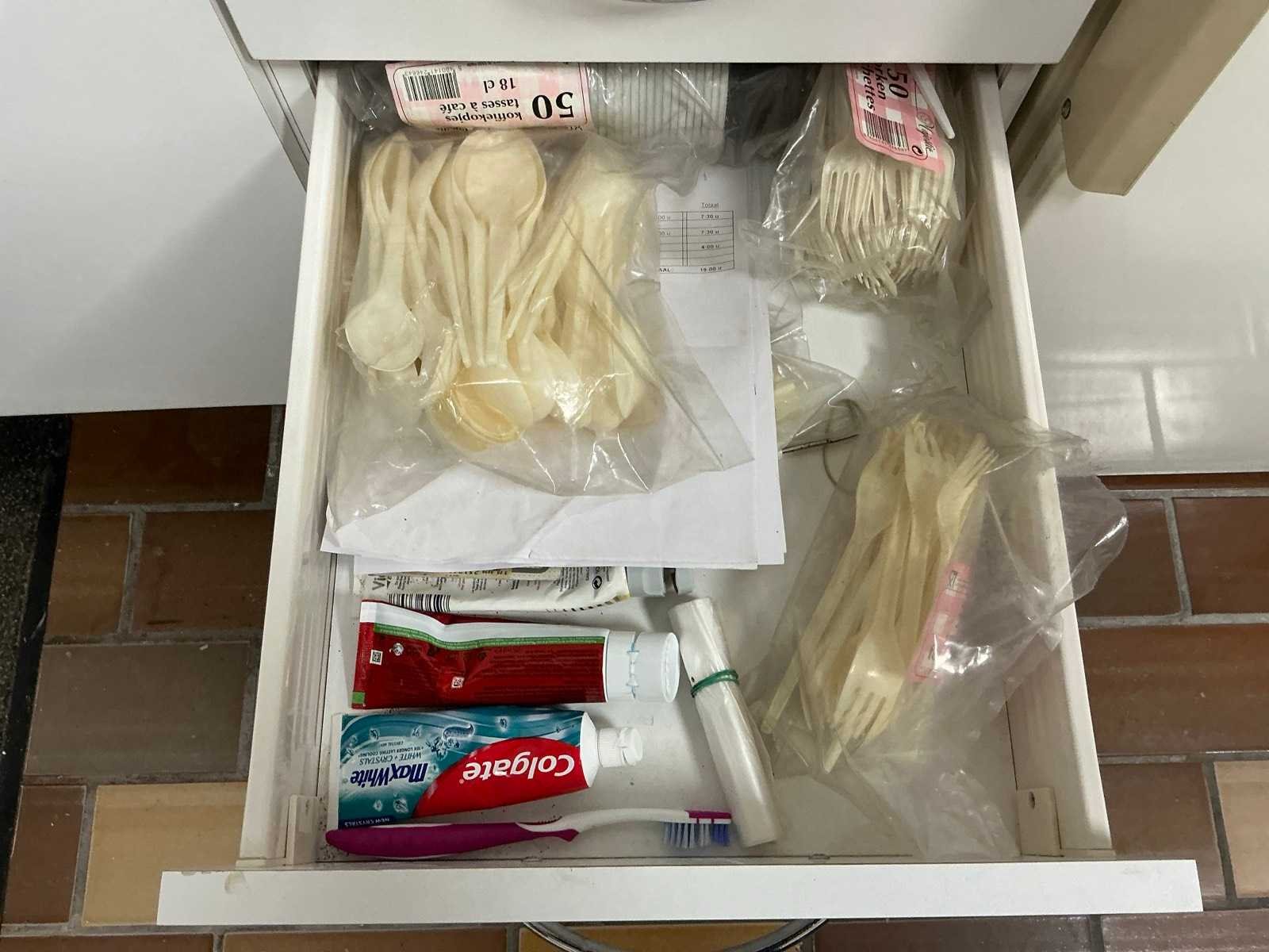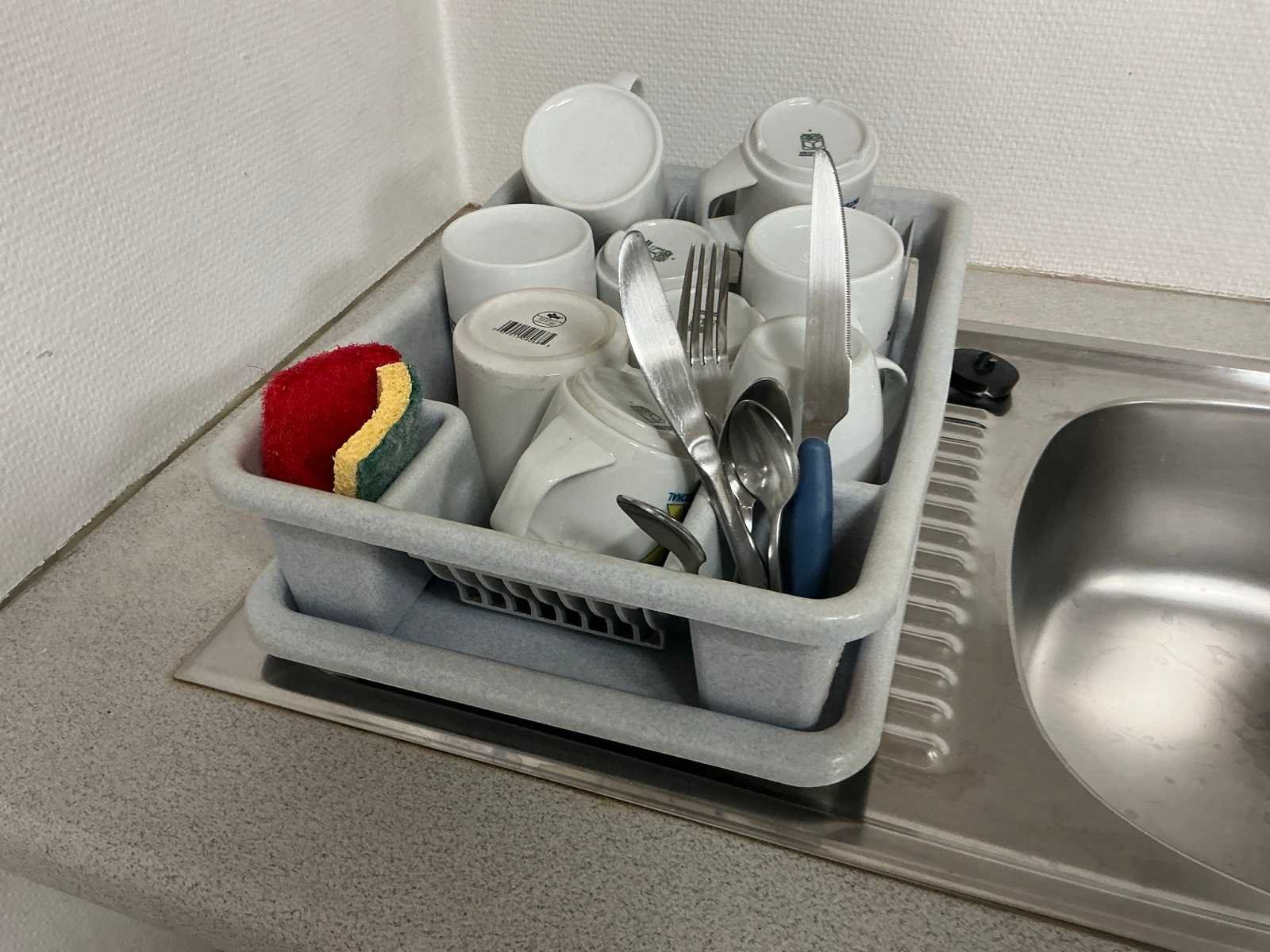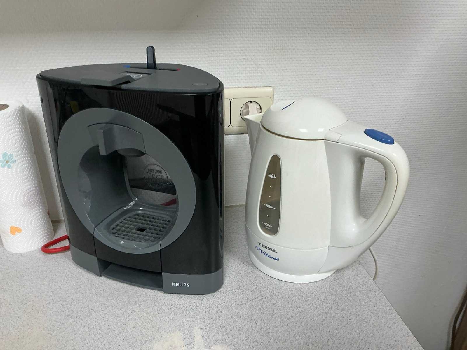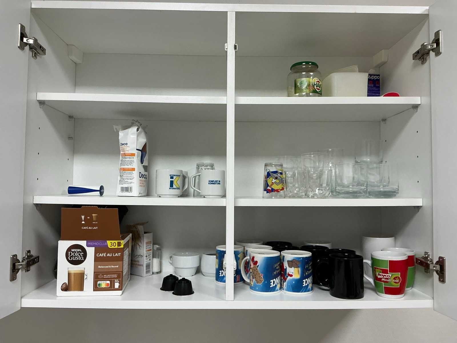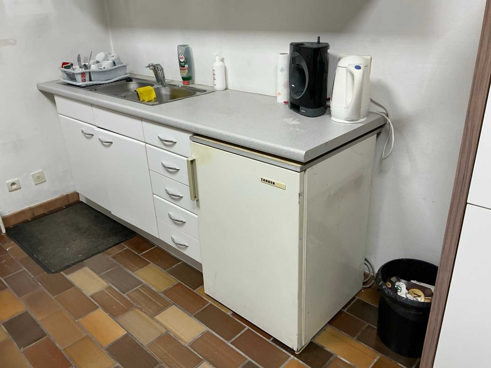 Bestaande uit koffiemachine Krups, waterkoker Tefal, wandkast voorzien van 4 deuren, afmeting: 140x55x155cm, partij divers servies en divers bestek, koelkast Zanker, tafelmodel, vuilnisemmer Brabantia, vakkenkast voorzien van 11 vakken en metalen dossierkast, laag model, met inhoud en whiteboard, uitgezonderd keuken (vast aan gebouw) Nee
