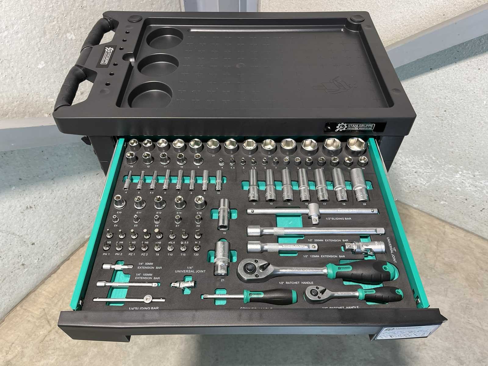 <li><strong>Merk:</strong> Stahlgruppe</li> <li><strong>Type:</strong> SG9</li> <li><strong>Aantal laden:</strong> 7 laden</li> <li><strong>Aantal gevulde laden:</strong> 5 gevulde laden</li> <li><strong>Kast:</strong> dubbelwandige kast met automatisch vergrendelende laden</li> <li><strong>Gereedschap:</strong> Chrome Vanadium gereedschap</li> <li><strong>Inhoud:</strong> <ul> <li>2 dopsleutel sets (1/4” & 1/2”)</li> <li>ring- steeksleutelset (6-32 mm)</li> <li>ringratel-steeksleutelset (8-19 mm)</li> <li>Inbussleutels (1,5-10 mm)</li> <li>schroevendraaiers (21 stuks)</li> <li>Torxsleutels (T8-T70)</li> <li>beitels en pendrijvers (9 stuks)</li> <li>diverse hamers (2 stuks)</li> <li>diverse tangen (9 stuks)</li> <li>schuifmaat (0-150 mm * 0,05 mm)</li> <li>enzovoort…</li> </ul> </li> <li><strong>Staat:</strong> ongebruikt, in de originele verpakking</li> Nee Merk: Stahlgruppe Type: SG9