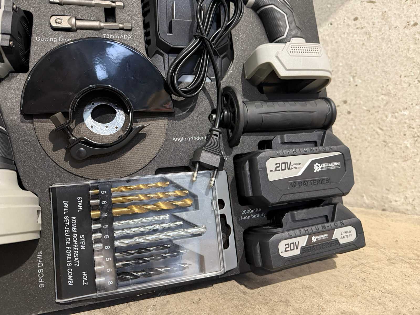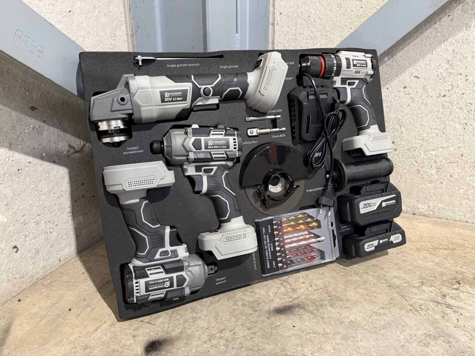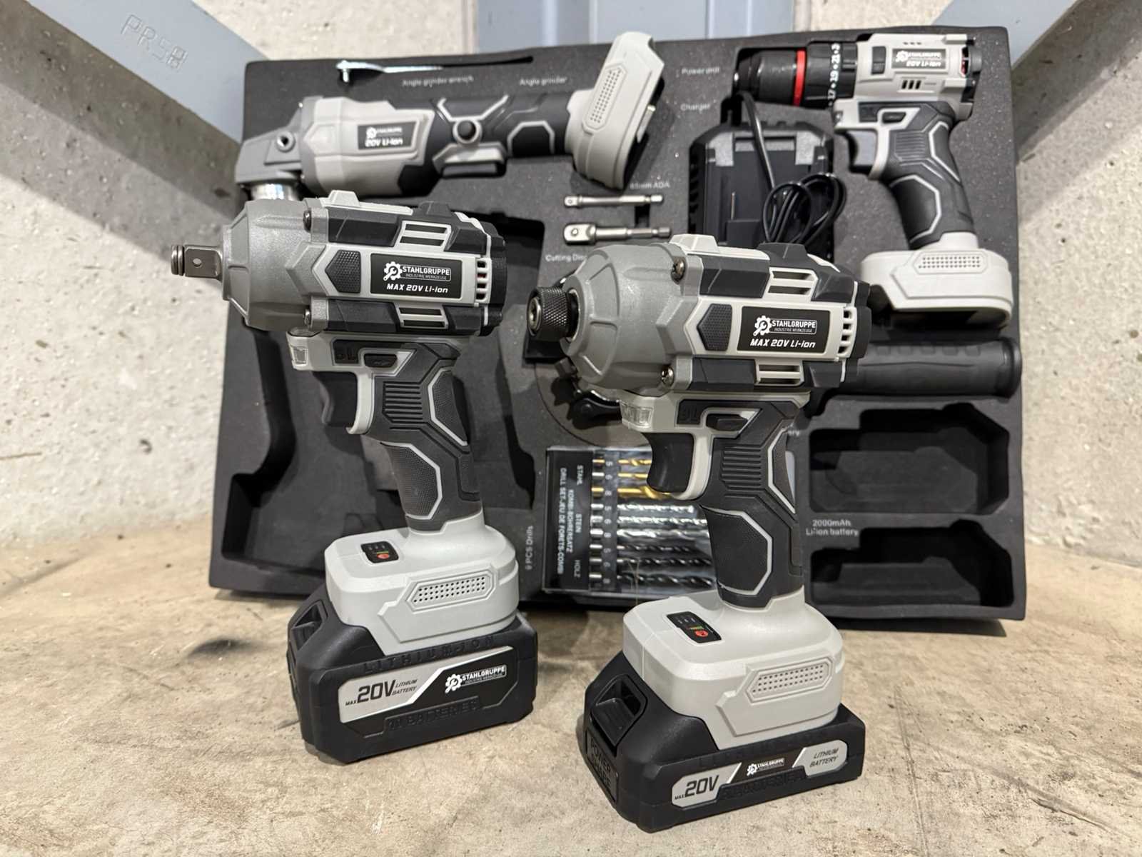 <li><b>4-delige set accu gereedschappen</b></li> <li><b>uitvoering:</b> ‘brushless’ machines</li> <li><b>Bestaande uit:</b> <ul> <li>Accu boormachine</li> <li>Accu schroefmachine</li> <li>Accu slagmoersleutel</li> <li>Accu haakse slijper</li> </ul> </li> <li><b>Inclusief:</b> Accu’s: <ul> <li>1 x lithium-ion accu 20 volt, 2000 mAh</li> <li>1 x lithium-ion accu 20 volt, 4000 mAh</li> </ul> </li> <li><b>Inclusief:</b> acculader</li> <li><b>Inclusief:</b> 9-delige borenset</li> <li><b>Inclusief:</b> 5 slijpschijven</li> <li><b>Inclusief:</b> toebehoren</li> <li><b>Goed om te weten:</b> foam inlay voor de laden van een gereedschapswagen</li> <li><b>Afmeting:</b> 52,5 x 38,5 cm</li> <li><b>Staat:</b> Ongebruikt, in de originele verpakking</li> Nee Merk: Stahlgruppe
