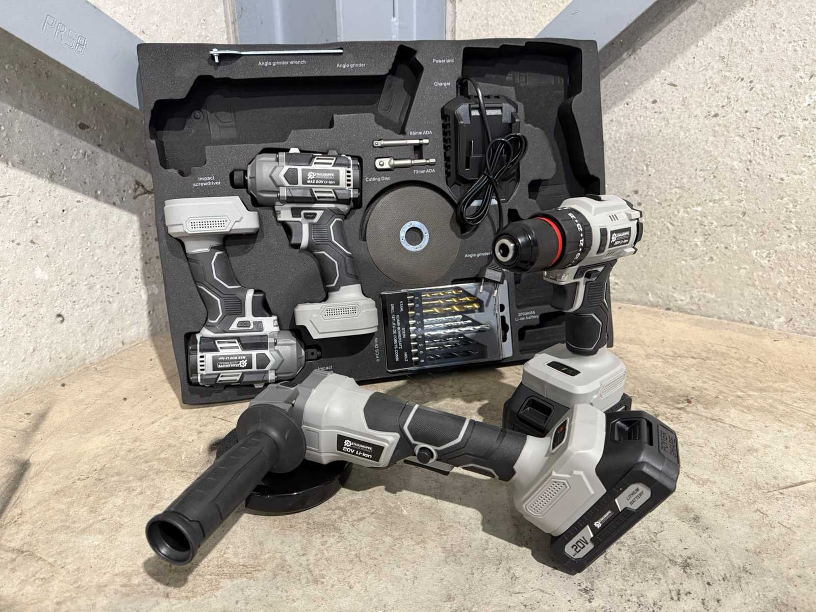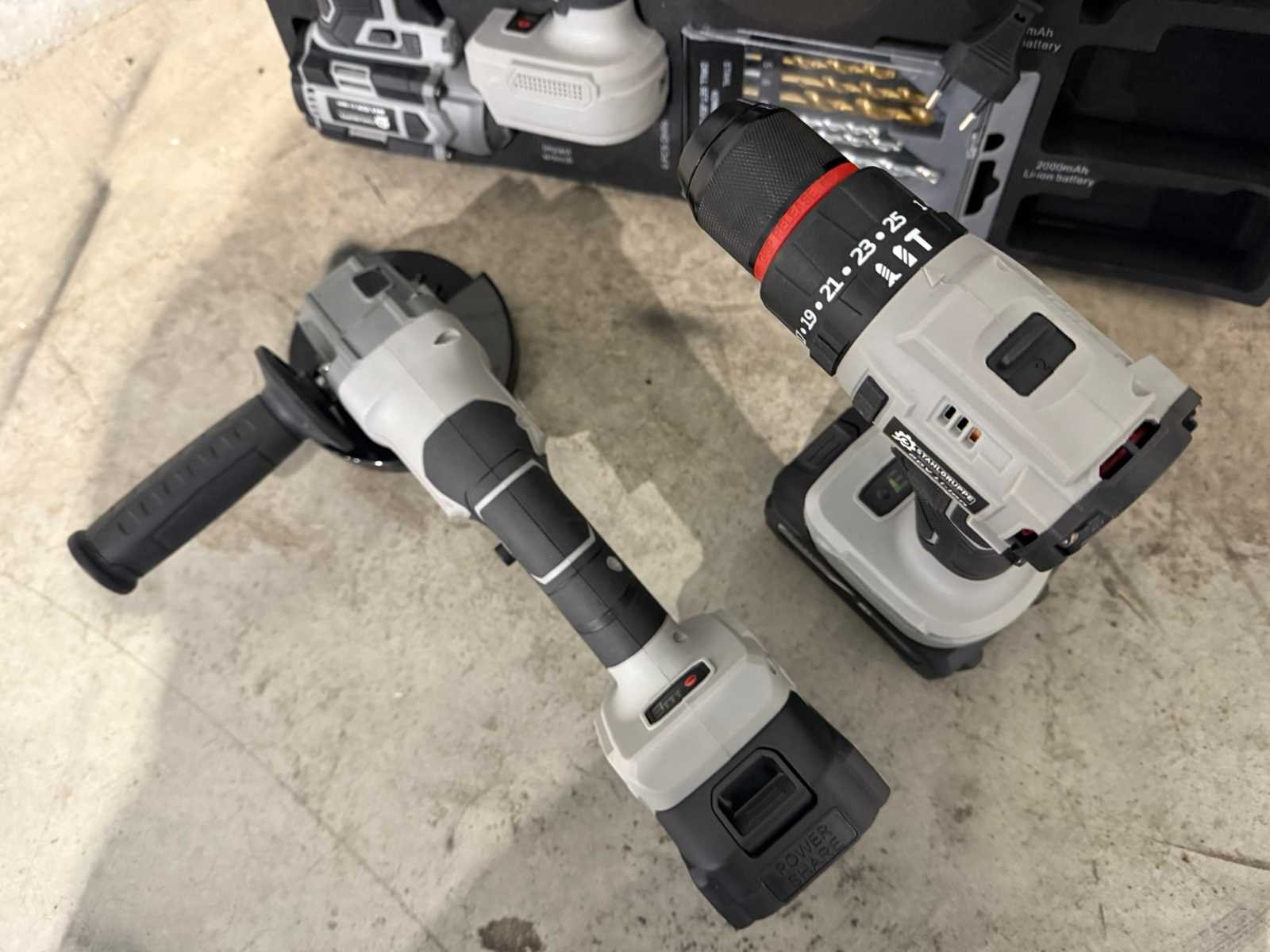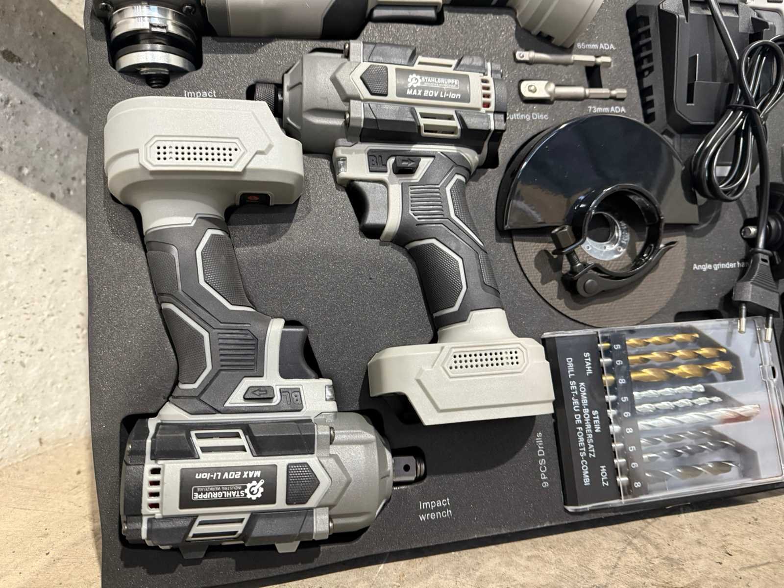 <li><b>4-delige set accu gereedschappen</b></li> <li><b>uitvoering:</b> ‘brushless’ machines</li> <li><b>Bestaande uit:</b> <ul> <li>Accu boormachine</li> <li>Accu schroefmachine</li> <li>Accu slagmoersleutel</li> <li>Accu haakse slijper</li> </ul> </li> <li><b>Inclusief:</b> Accu’s: <ul> <li>1 x lithium-ion accu 20 volt, 2000 mAh</li> <li>1 x lithium-ion accu 20 volt, 4000 mAh</li> </ul> </li> <li><b>Inclusief:</b> acculader</li> <li><b>Inclusief:</b> 9-delige borenset</li> <li><b>Inclusief:</b> 5 slijpschijven</li> <li><b>Inclusief:</b> toebehoren</li> <li><b>Goed om te weten:</b> foam inlay voor de laden van een gereedschapswagen</li> <li><b>Afmeting:</b> 52,5 x 38,5 cm</li> <li><b>Staat:</b> Ongebruikt, in de originele verpakking</li> Nee Merk: Stahlgruppe
