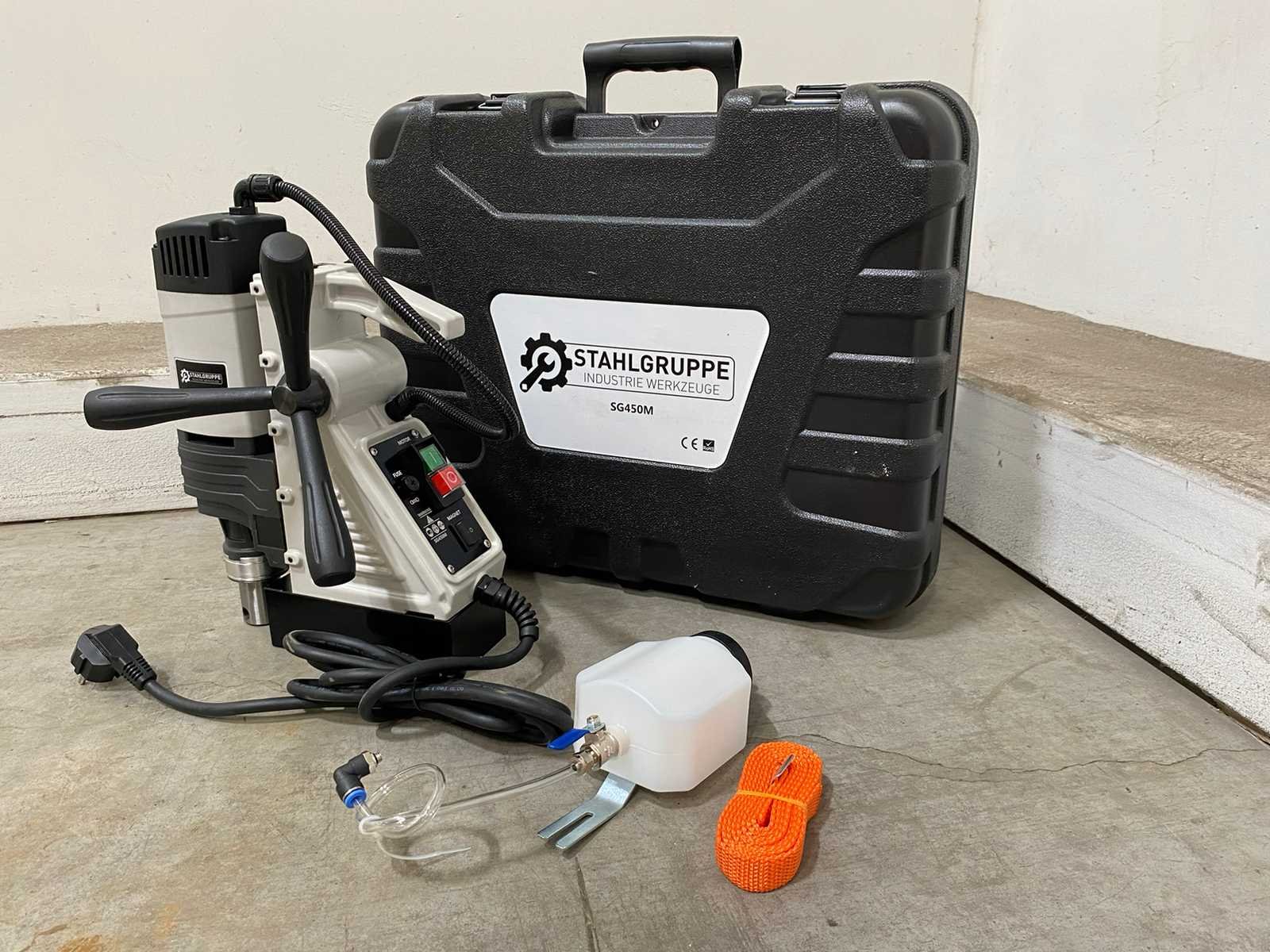 <ul> <li><b>magneetboormachine</b></li> <li><b>Merk:</b> Stahlgruppe</li> <li><b>Type:</b> SG450M</li> <li><b>max. boordiameter:</b> 35 mm boordiameter</li> <li><b>vermogen:</b> 1600 watt</li> <li><b>aansluiting:</b> 230 volt</li> <li><b>magneetsterkte:</b> 16000 newton</li> <li><b>toerental:</b> 810 toeren</li> <li><b>boordiepte:</b> 145 mm boordiepte</li> <li><b>inclusief:</b> oliereservoir voor koelen en smeren</li> <li><b>beveiliging:</b> riem voor valbeveiliging</li> <li><b>staat:</b> ongebruikt, in de originele verpakking</li> </ul> Nee Merk: Stahlgruppe Type: SG450M