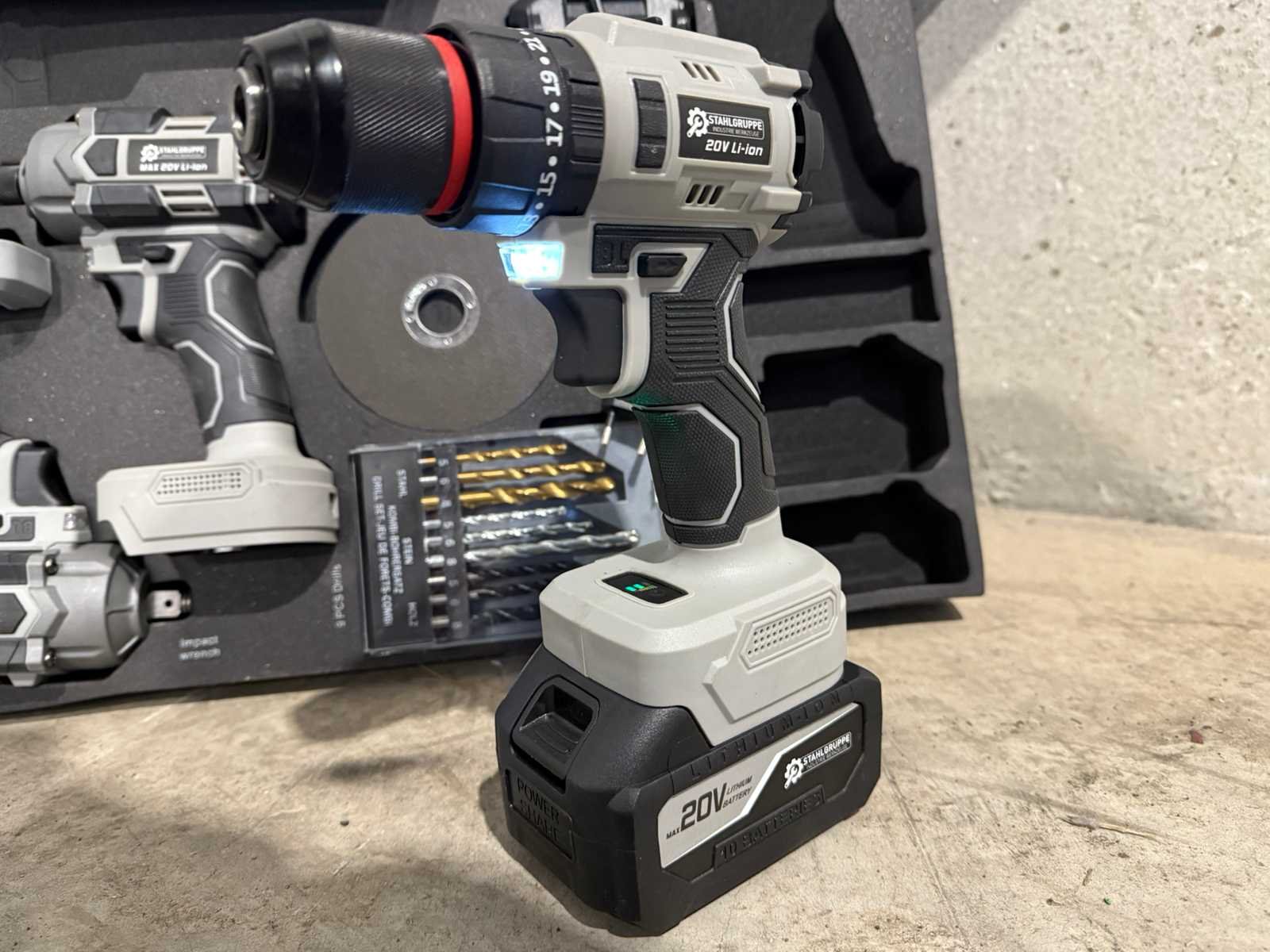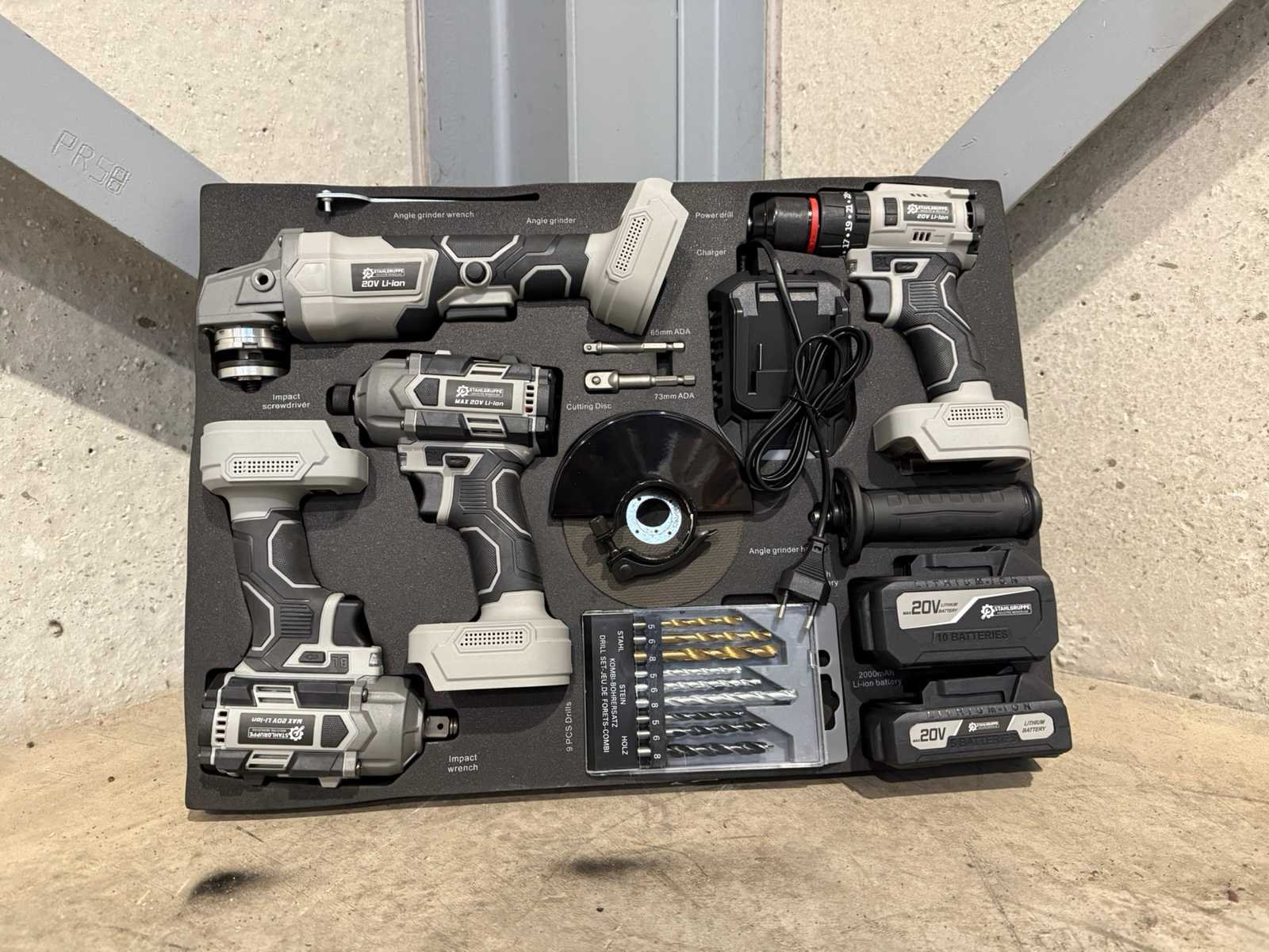 <li><b>4-delige set accu gereedschappen</b></li> <li><b>uitvoering:</b> ‘brushless’ machines</li> <li><b>Bestaande uit:</b> <ul> <li>Accu boormachine</li> <li>Accu schroefmachine</li> <li>Accu slagmoersleutel</li> <li>Accu haakse slijper</li> </ul> </li> <li><b>Inclusief:</b> Accu’s: <ul> <li>1 x lithium-ion accu 20 volt, 2000 mAh</li> <li>1 x lithium-ion accu 20 volt, 4000 mAh</li> </ul> </li> <li><b>Inclusief:</b> acculader</li> <li><b>Inclusief:</b> 9-delige borenset</li> <li><b>Inclusief:</b> 5 slijpschijven</li> <li><b>Inclusief:</b> toebehoren</li> <li><b>Goed om te weten:</b> foam inlay voor de laden van een gereedschapswagen</li> <li><b>Afmeting:</b> 52,5 x 38,5 cm</li> <li><b>Staat:</b> Ongebruikt, in de originele verpakking</li> Nee Merk: Stahlgruppe