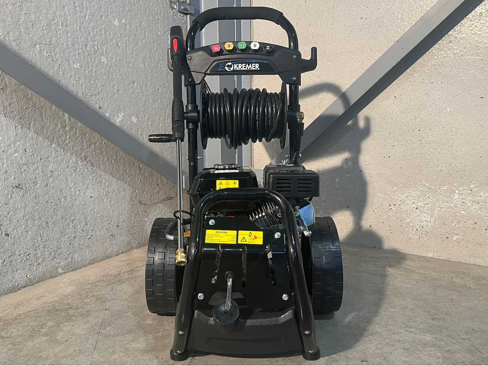 <li><b>Benzine hogedrukreiniger</b></li> <li><b>Merk:</b> Kremer</li> <li><b>Werkdruk:</b> 170 bar</li> <li><b>Hogedrukslang:</b> 10 meter hogedrukslang</li> <li><b>Capaciteit:</b> 540 liter per uur</li> <li><b>Motor:</b> 4-takt benzinemotor</li> <li><b>Starten:</b> Trekstarter</li> <li><b>Vermogen:</b> 4.8 kW</li> <li><b>Toerental:</b> 3400 toeren per minuut</li> <li><b>Mondstukken:</b> 5 mondstukken</li> <li><b>Voorzien van:</b> Tank voor schoonmaakmiddel</li> <li><b>Inclusief:</b> Aanzuigslang met waterfilter</li> <li><b>Eigenschappen:</b> Grote wielen, zeeptank, slanghaspel… </li> <li><b>Staat:</b> Ongebruikt in de originele verpakking</li> Nee Merk: Kremer Type: KR200H