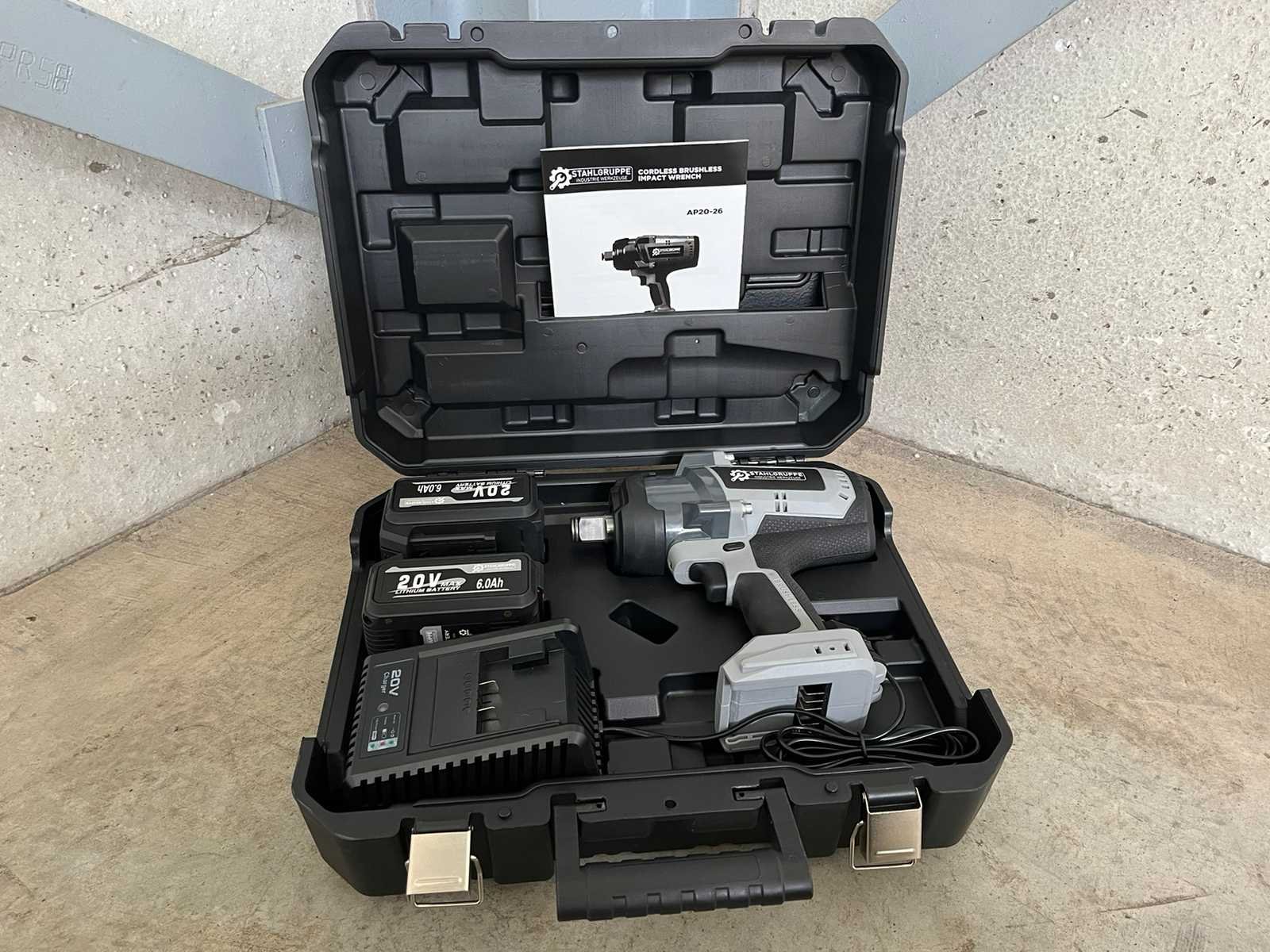 <li><b>Accu slagmoersleutel</b></li> <li><b>Koppel:</b> 1600 Nm</li> <li><b>Voltage:</b> 20 volt</li> <li><b>Accu:</b> 6.0 Ah accu</li> <li><b>dopmaat:</b>geschikt voor 3/4” doppen</li> <li><b>Toeren per minuut:</b> 1600 RPM</li> <li><b>slagen per minuut:</b> 2300 BPM</li> <li><b>Aantal accu’s:</b> 2 accu’s</li> <li><b>Acculader:</b> Acculader inbegrepen</li> <li><b>Staat:</b> Ongebruikt, in de originele verpakking</li> Nee Merk: Stahlgruppe