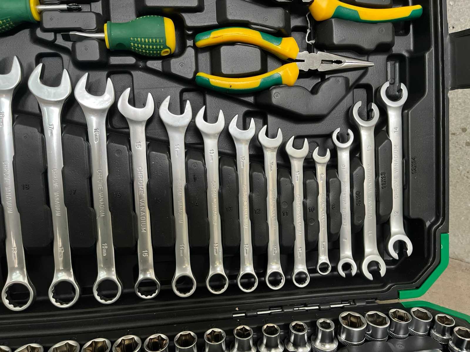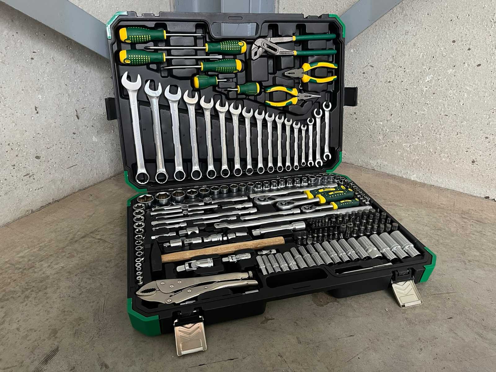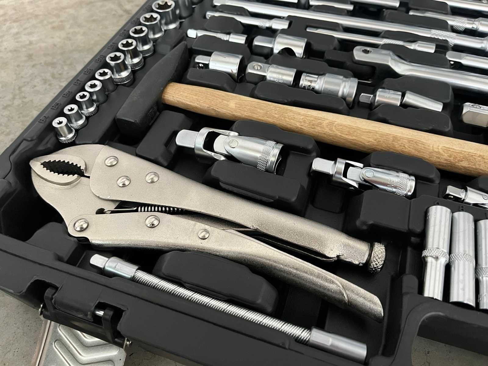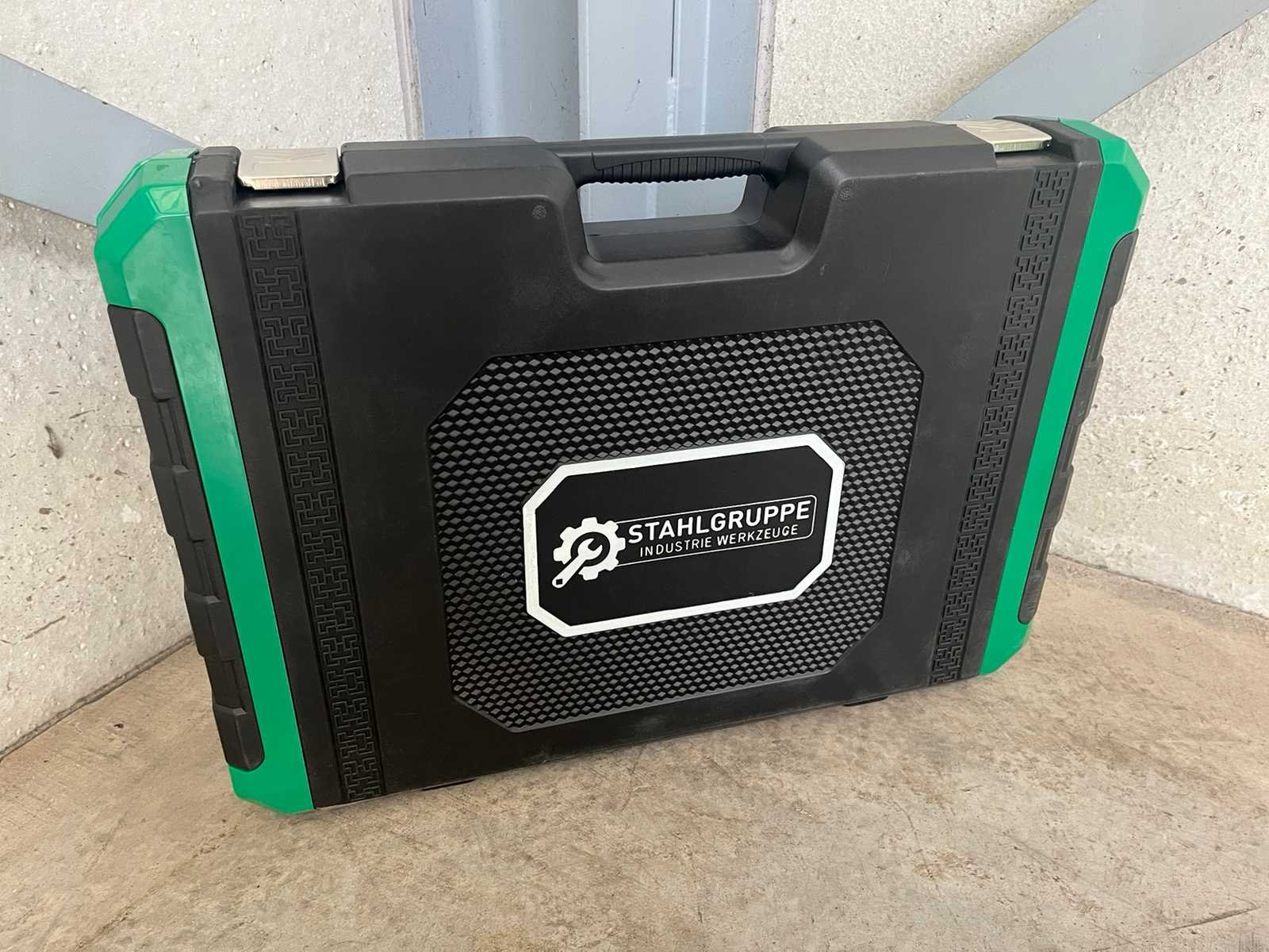 <ul> <li><strong>gereedschapsset:</strong> 180-delig</li> <li><strong>doppen:</strong> 1/4", 3/8", 1/2" (standaard, diep, E-profiel, bougie)</li> <li><strong>ratels:</strong> 1/4", 3/8", 1/2" met quick-release</li> <li><strong>ringsleutels:</strong> 8–22 mm</li> <li><strong>bits:</strong> Torx, PH, PZ, SL, Hex (kort & lang)</li> <li><strong>tangen:</strong> combinatietang, telefoontang, waterpomptang</li> <li><strong>toebehoren:</strong> verlengstukken, scharnieren, schroevendraaiers, hamer</li> <li><strong>koffer:</strong> slagvaste ABS opbergkoffer</li> <li><strong>staat:</strong> ongebruikt, in originele verpakking</li> </ul> Nee Merk: Stahlgruppe