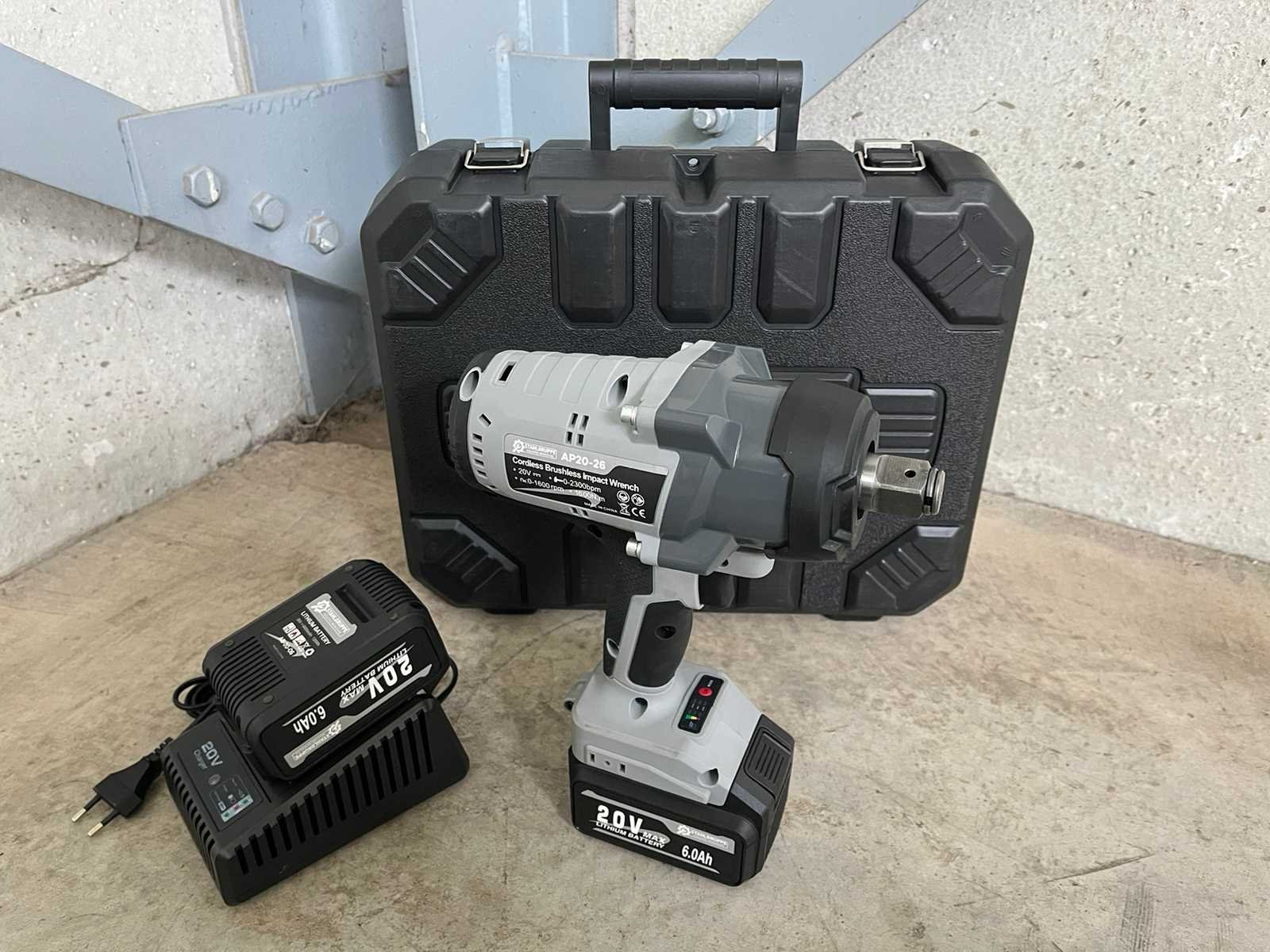 <li><b>Accu slagmoersleutel</b></li> <li><b>Koppel:</b> 1600 Nm</li> <li><b>Voltage:</b> 20 volt</li> <li><b>Accu:</b> 6.0 Ah accu</li> <li><b>dopmaat:</b>geschikt voor 3/4” doppen</li> <li><b>Toeren per minuut:</b> 1600 RPM</li> <li><b>slagen per minuut:</b> 2300 BPM</li> <li><b>Aantal accu’s:</b> 2 accu’s</li> <li><b>Acculader:</b> Acculader inbegrepen</li> <li><b>Staat:</b> Ongebruikt, in de originele verpakking</li> Nee Merk: Stahlgruppe