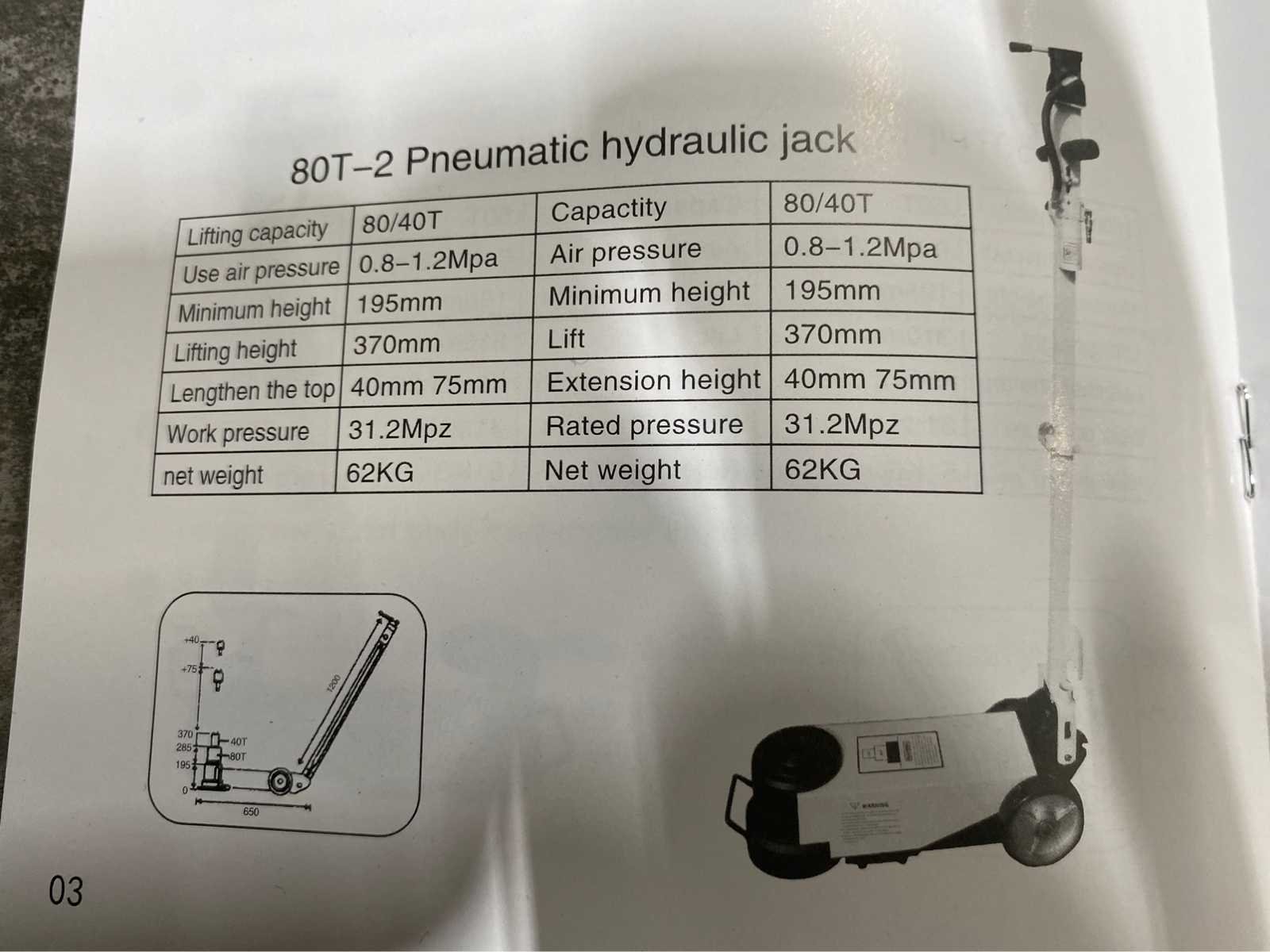 <ul> <li><b>80 ton hydropneumatische krik</b></li> <li><b>Merk:</b> Stahlgruppe</li> <li><b>Capaciteit:</b> 80 ton</li> <li><b>Cilinder:</b> drievoudige cilinder</li> <li><b>Minimum hoogte:</b> minimum 195 mm</li> <li><b>Maximum hoogte:</b> maximum 450 mm</li> <li><b>Handgreep:</b> handgreep van 130 cm</li> <li><b>Eigen gewicht:</b> 60 kilogram</li> <li><b>Staat:</b> ongebruikt, in de originele verpakking</li> </ul> Nee Merk: Stahlgruppe