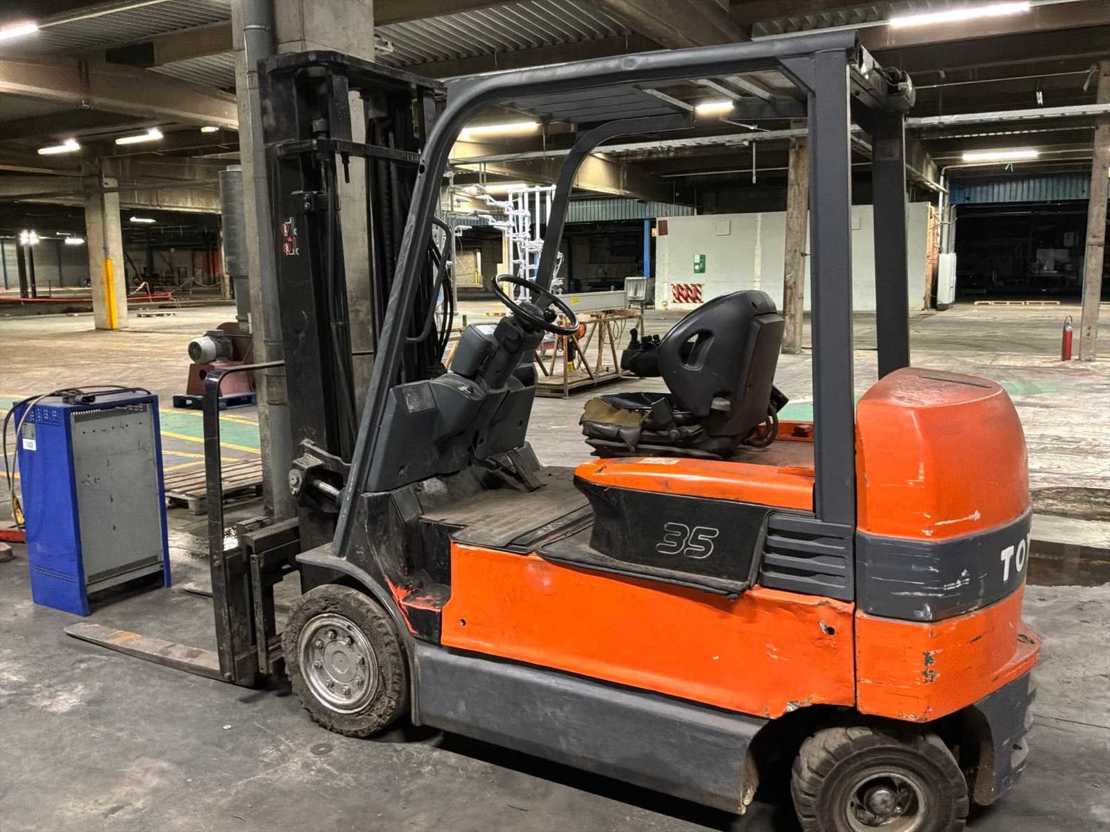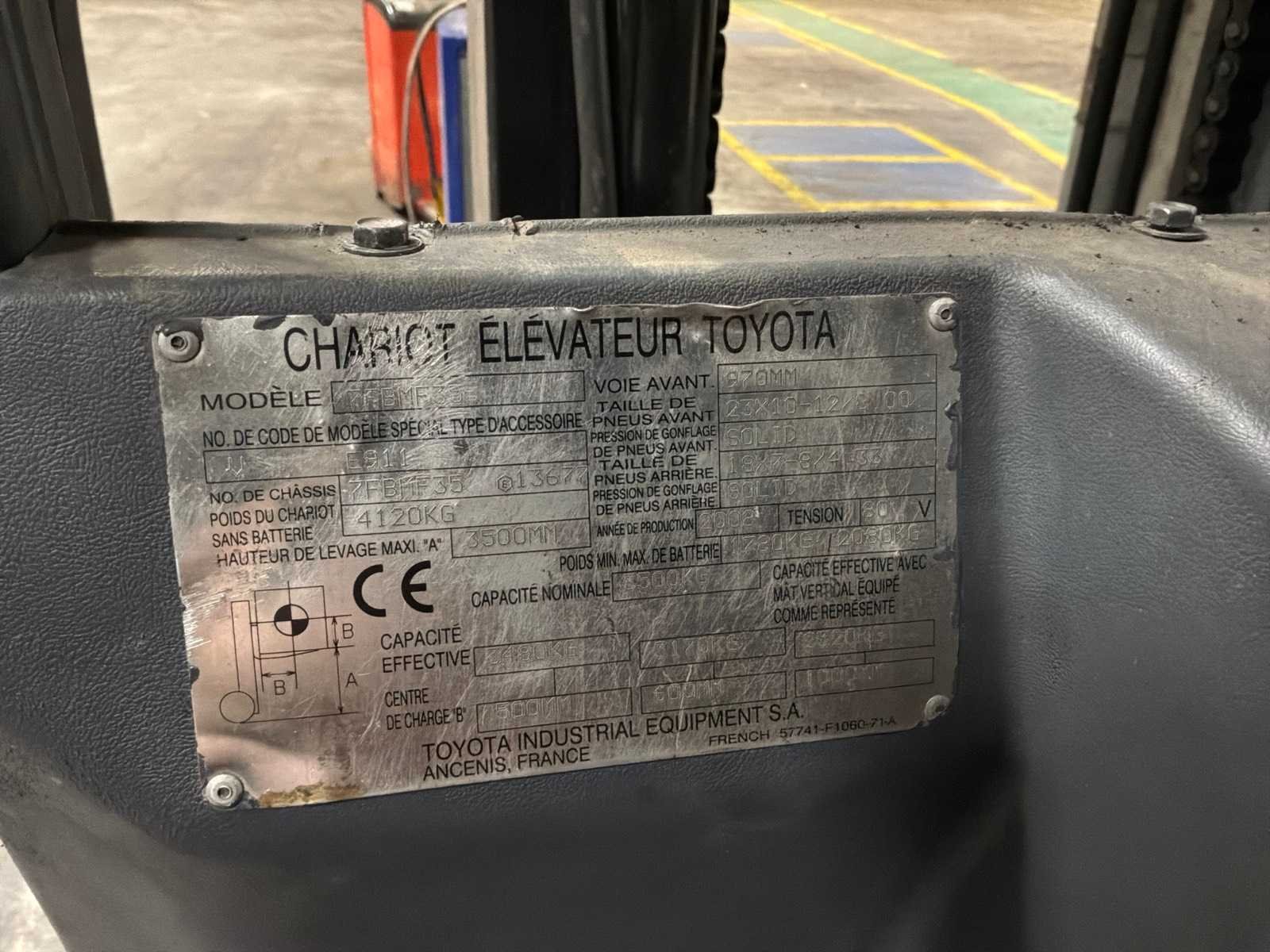 Gewicht zonder batterij: 4120 kg \ Gewicht batterij min. max.: 1780 / 2080 kg Nee Merk: Toyota Type: 7FBMF35 Bouwjaar: 2008 Serienummer: 13677 Brandstof: Elektrisch Soort band: Volrubber banden Aantal wielen: 4 Accu lader: true Free-lift: true Side-shift: true Duplex mast: true Hefvermogen: 3480kg Lepellengte: 1150mm Max. hefhoogte: 3500mm Minimale doorrijhoogte: 2400mm Totale afmeting L: 3900mm Totale afmeting Breedte: 1200mm Totale afmeting Hoogte: 2370mm