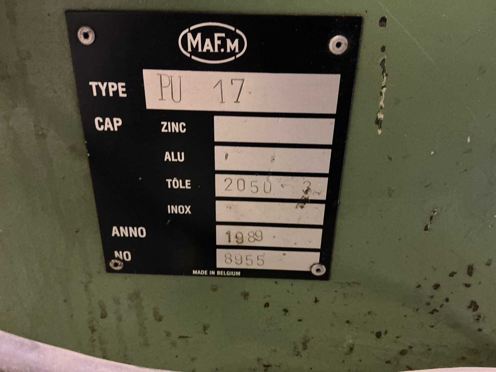 Nee Merk: Maf.m Type: PU17 Serienummer: 8955 Werklengte: 2050mm Max. plaatdikte: 3mm Afmeting l: 3500mm Afmeting b: 800mm Afmeting h: 1780mm
