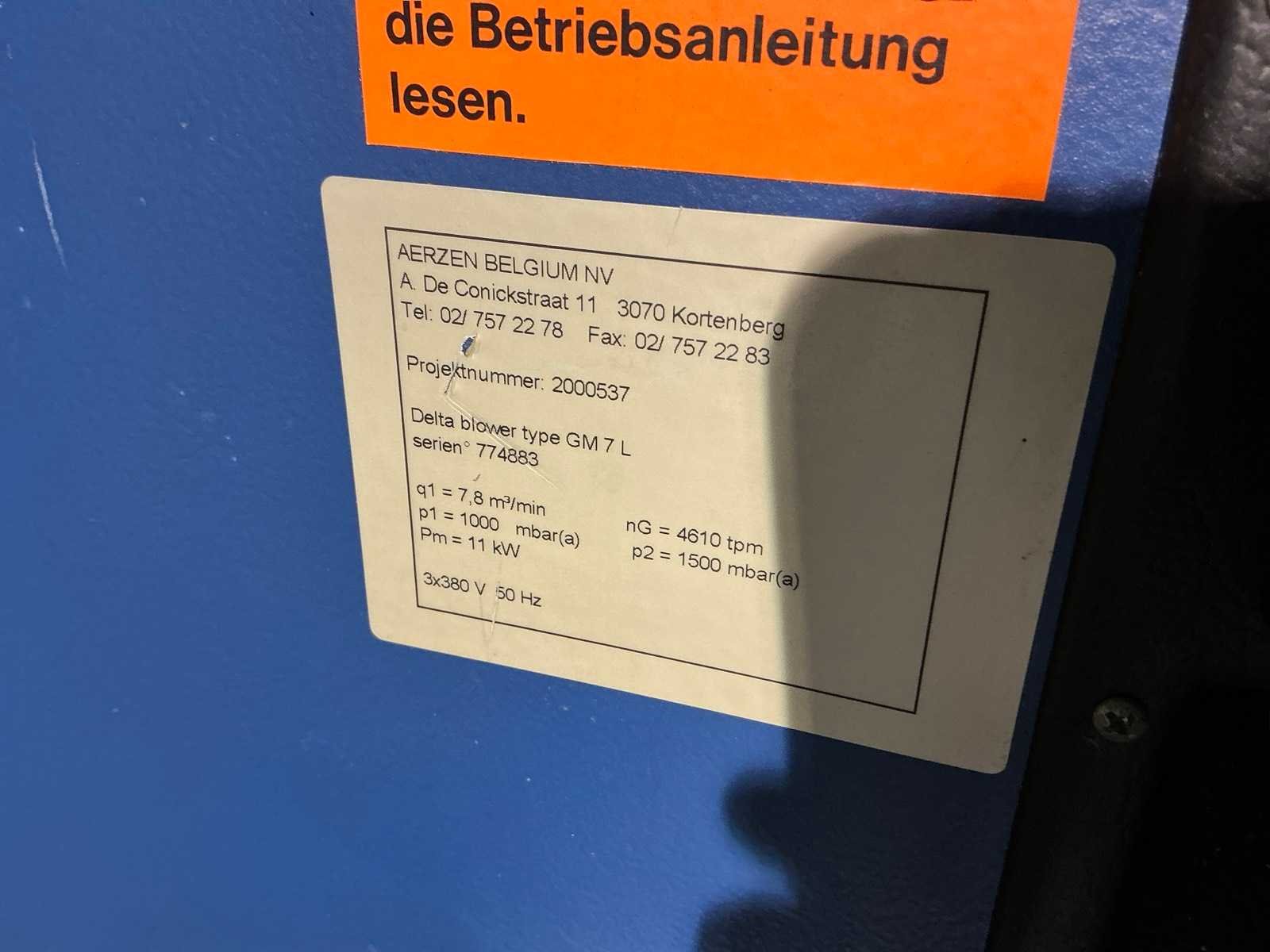 7,8 m3/min, in geluidsdempende omkasting Nee Merk: Aertzen Type: Delta GM7L Vermogen: 11kW Aansluiting: 400V Totale afmeting L: 1550mm Totale afmeting Breedte: 1050mm Totale afmeting Hoogte: 1340mm