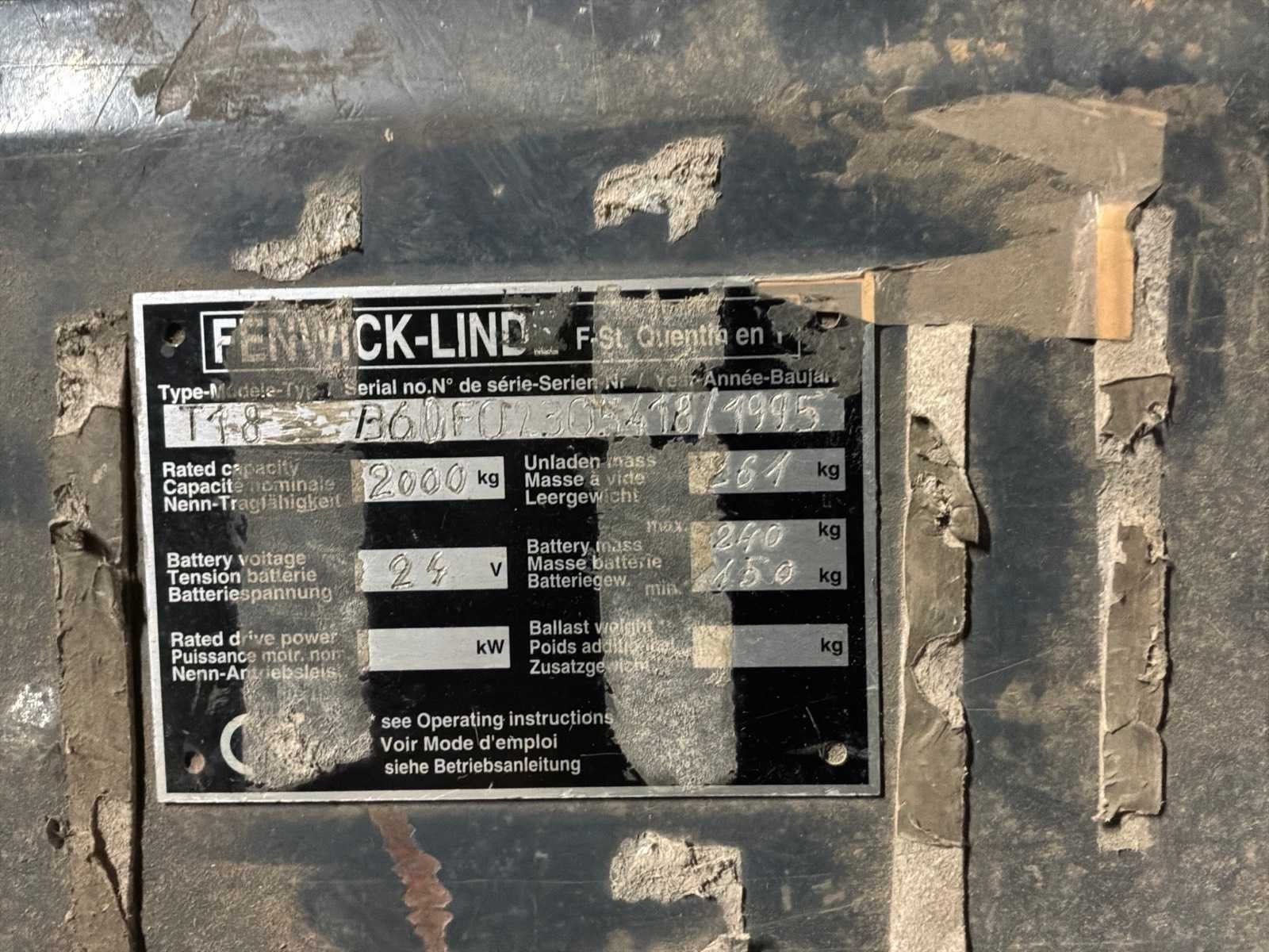 Urenstand niet gekend. Lader niet aanwezig. Nee Merk: Fenwick Linde Type: T18 Hefvermogen: 2000kg Lepellengte: 1140mm Totale afmeting L: 1700mm Totale afmeting Breedte: 700mm Totale afmeting Hoogte: 1200mm