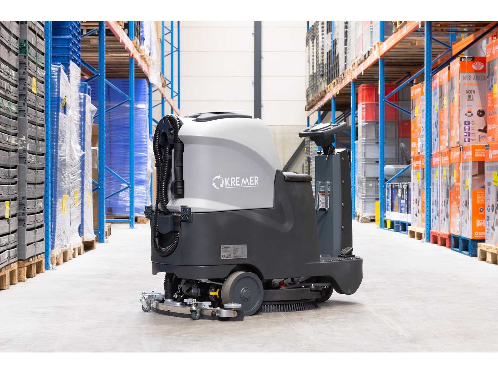 Batteries: 2 x 12 V, 100 Ah; Brush Speed: 170 rpm; Suction / Brush motor power: 500 W; Driving motor power: 300 W; Running Speed: 5.5km/h max; Recovery tank capacity: 50 L; Solution tank capacity: 50 L; Efficiency: 4500 m²/h; Brush diameter: 560 mm; Suction width: 800 mm; Cleaning width: 560 mm; 4866 Nee Merk: Kremer Type: KR-FR70 Bouwjaar: 2025 Werkbreedte: 560mm Elektrisch: true Afgelezen urenstand: 0hr Accu lader: true Eigen gewicht: 220kg Totale afmeting L: 1310mm Totale afmeting Breedte: 620mm Totale afmeting Hoogte: 1080mm