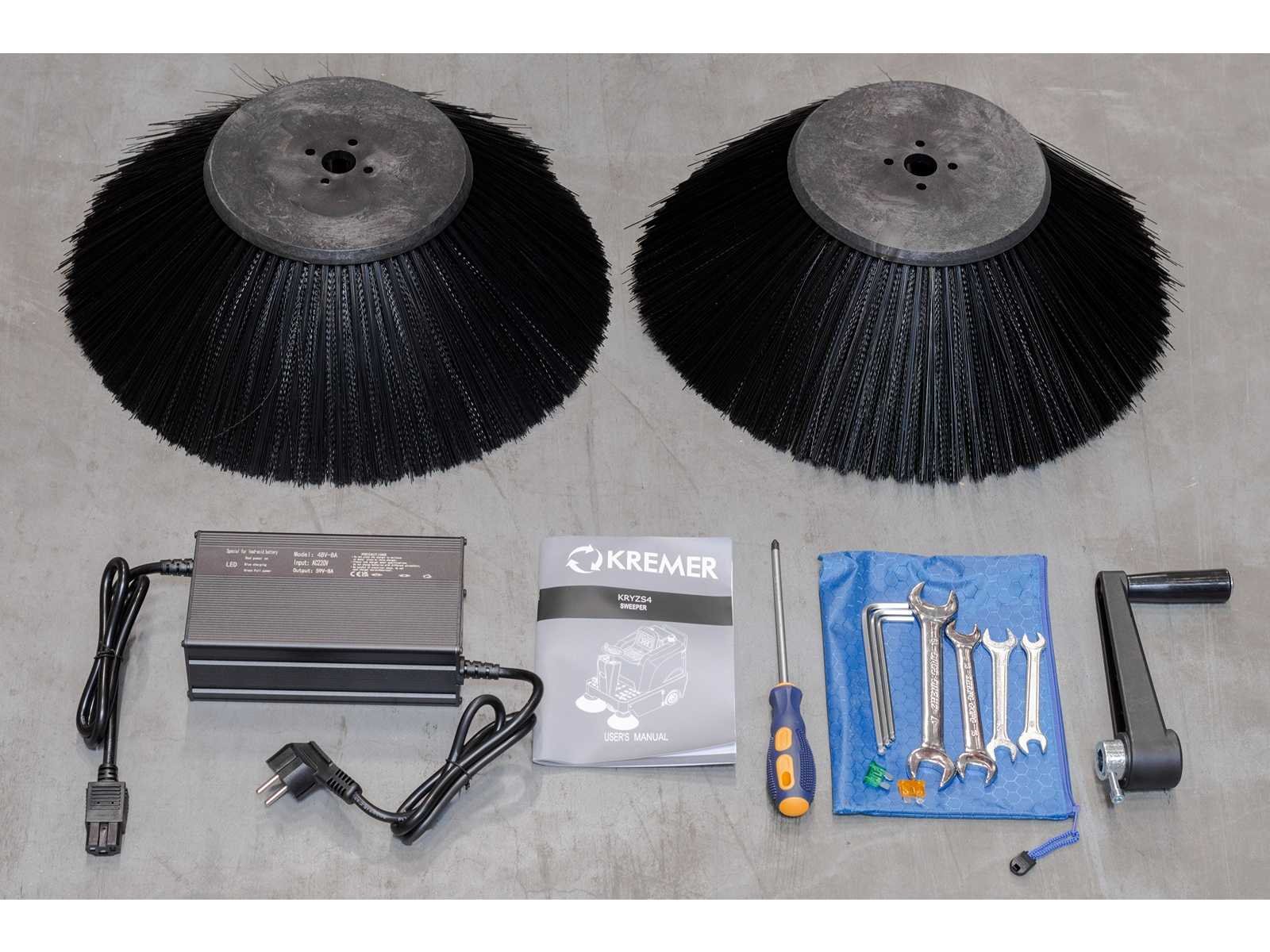 Sweeping width 1250 mm; Side brush width 2*400 mm; Walking motor 700 W; Battery capacity 48 v/ 65 ah * 4 pcs; Total weight 396 kgs; Width of main brush 500 mm; Work efficiency 6380 m2/h; Garbage capacity 80L; Roller brush motor 700W; Walking speed 0-10 Km/h; 80 liter vuilcontainer inhoud; 4782 Nee Merk: Kremer Type: KRYZS4 Bouwjaar: 2025 Elektrisch aangedreven: true Met oplader: true Eigen gewicht: 396kg Werkbreedte: 1250mm Totale afmeting L: 1600mm Totale afmeting Breedte: 1160mm Totale afmeting Hoogte: 1300mm