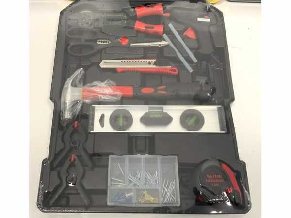 W.o. steek- ringsleutel met ratel; diverse tangen; doppenset met ratel; diverse schroevendraaiers; precisieschroevendraaiers; inbussleutel; diverse bits; klauwhamer; krimptang; schaar; rolmaat; waterpas; hetelijmpistool; kunststof klemmen; tapijtmes; 2161; Nee Type: 186 delig Kunststof: false Aluminium: true Canvas: false Met inhoud: true Afmeting l: 210mm Afmeting b: 370mm Afmeting h: 520mm