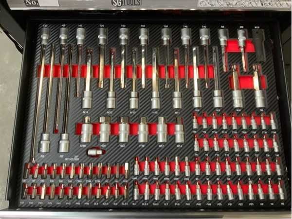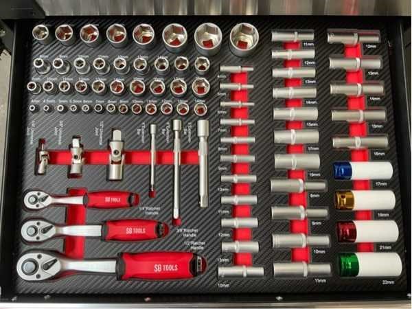 V.v. gereedschap 274-delig; 4 wielen waarvan 2 met rem; stuurgroep; werkblad; 7lades; 1 afsluitbare kast met legbord; 2 sleutel sets; ongebruikt in doos; 2419; Nee Merk: SG Tools Aantal laden: 7 Met inhoud: true Totale afmeting L: 1130mm Totale afmeting Breedte: 460mm Totale afmeting Hoogte: 990mm