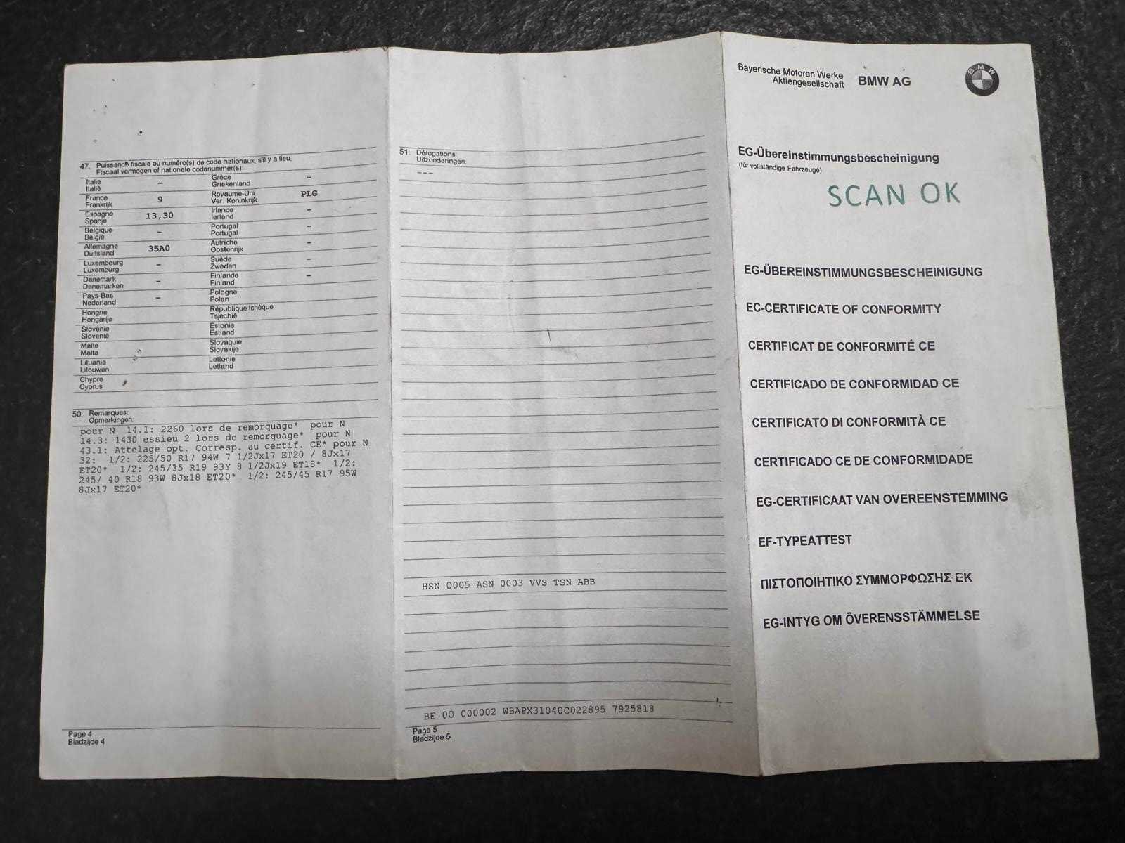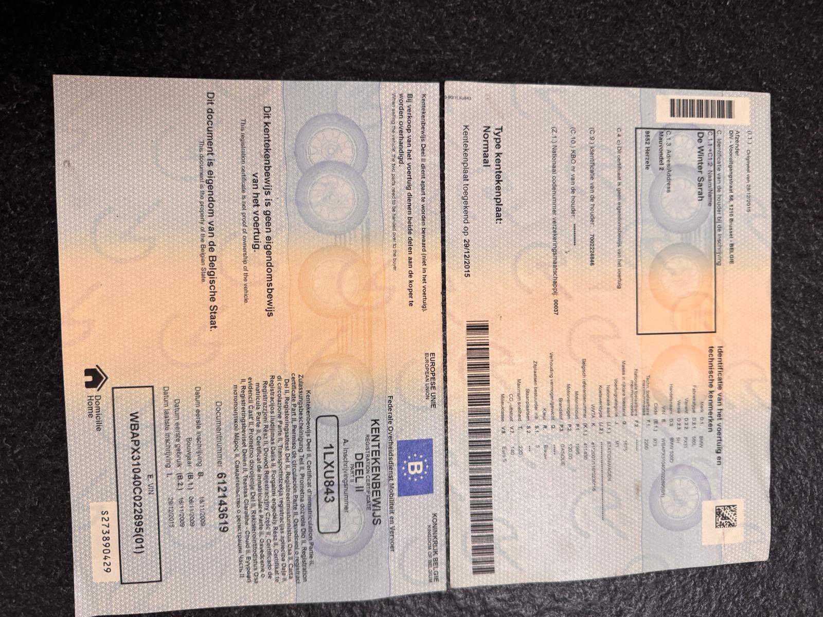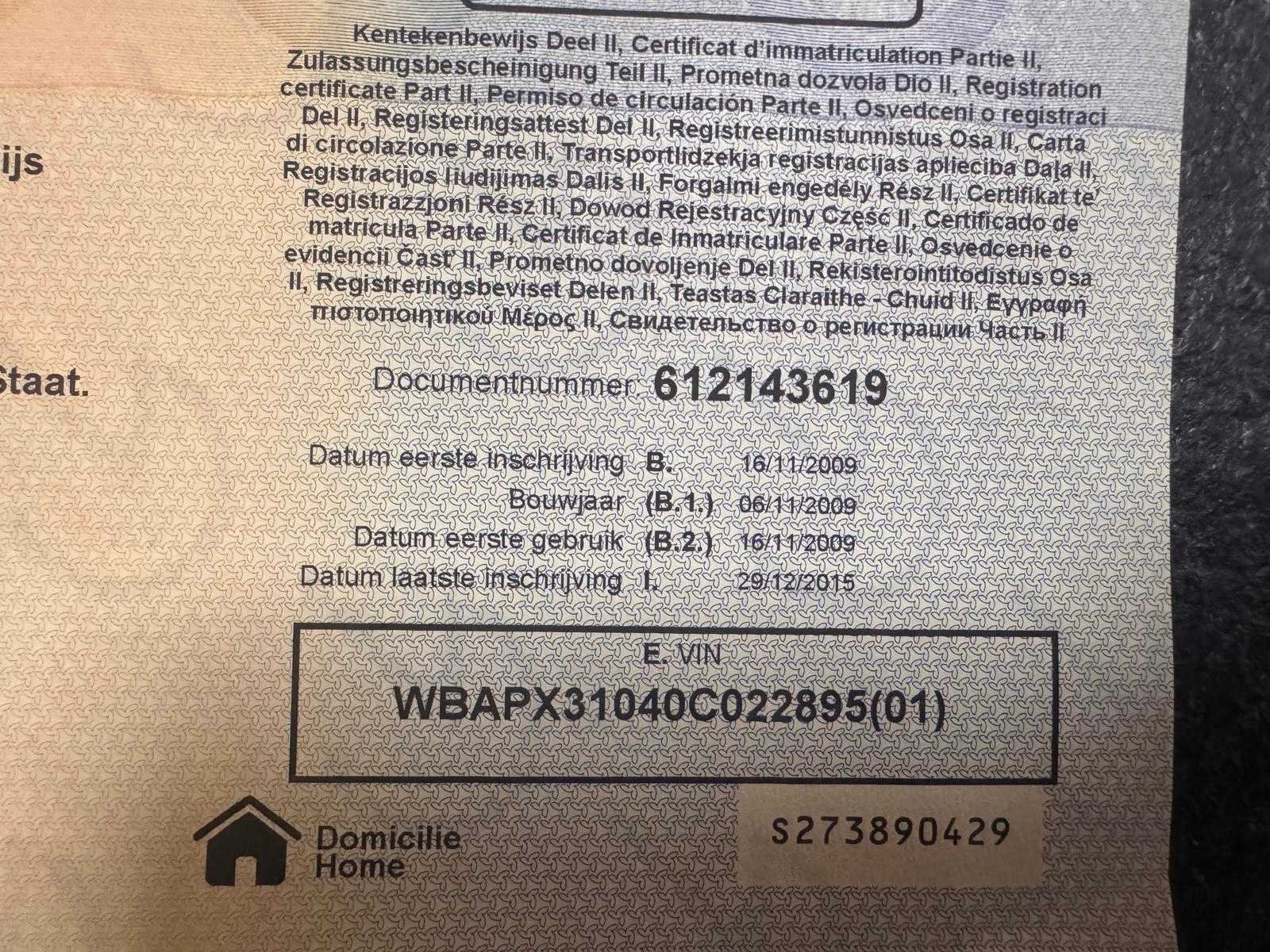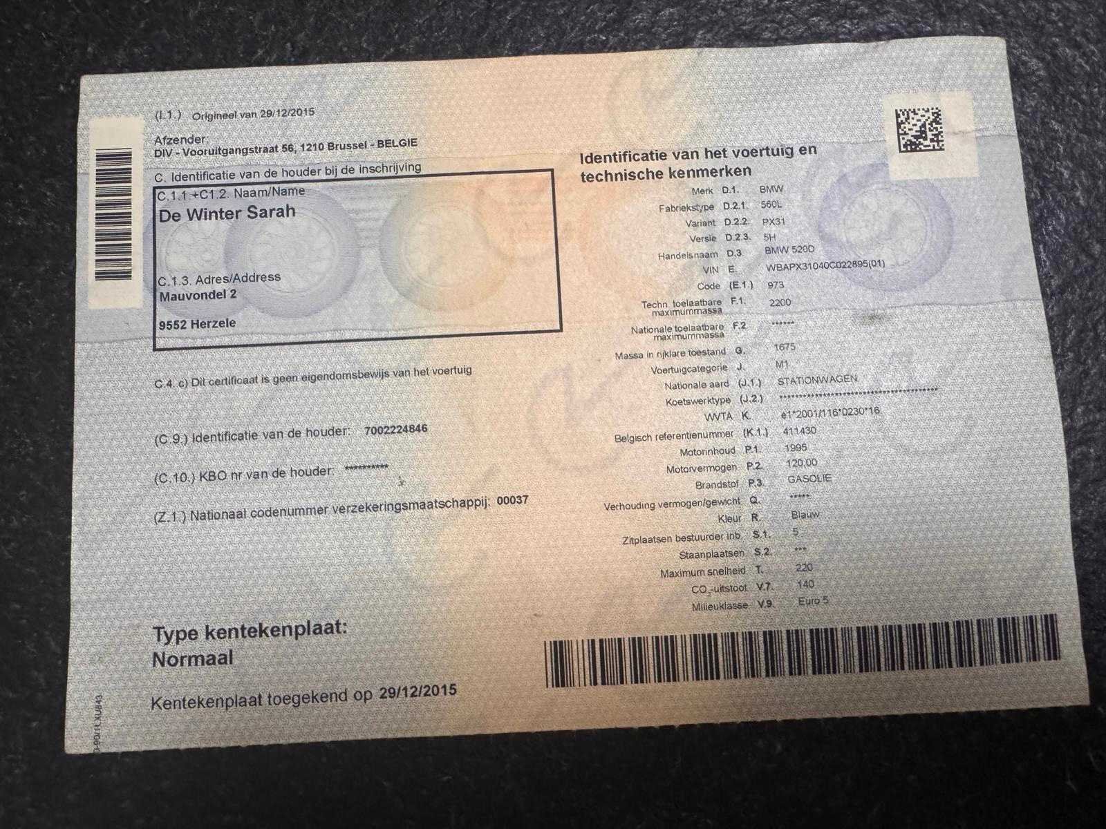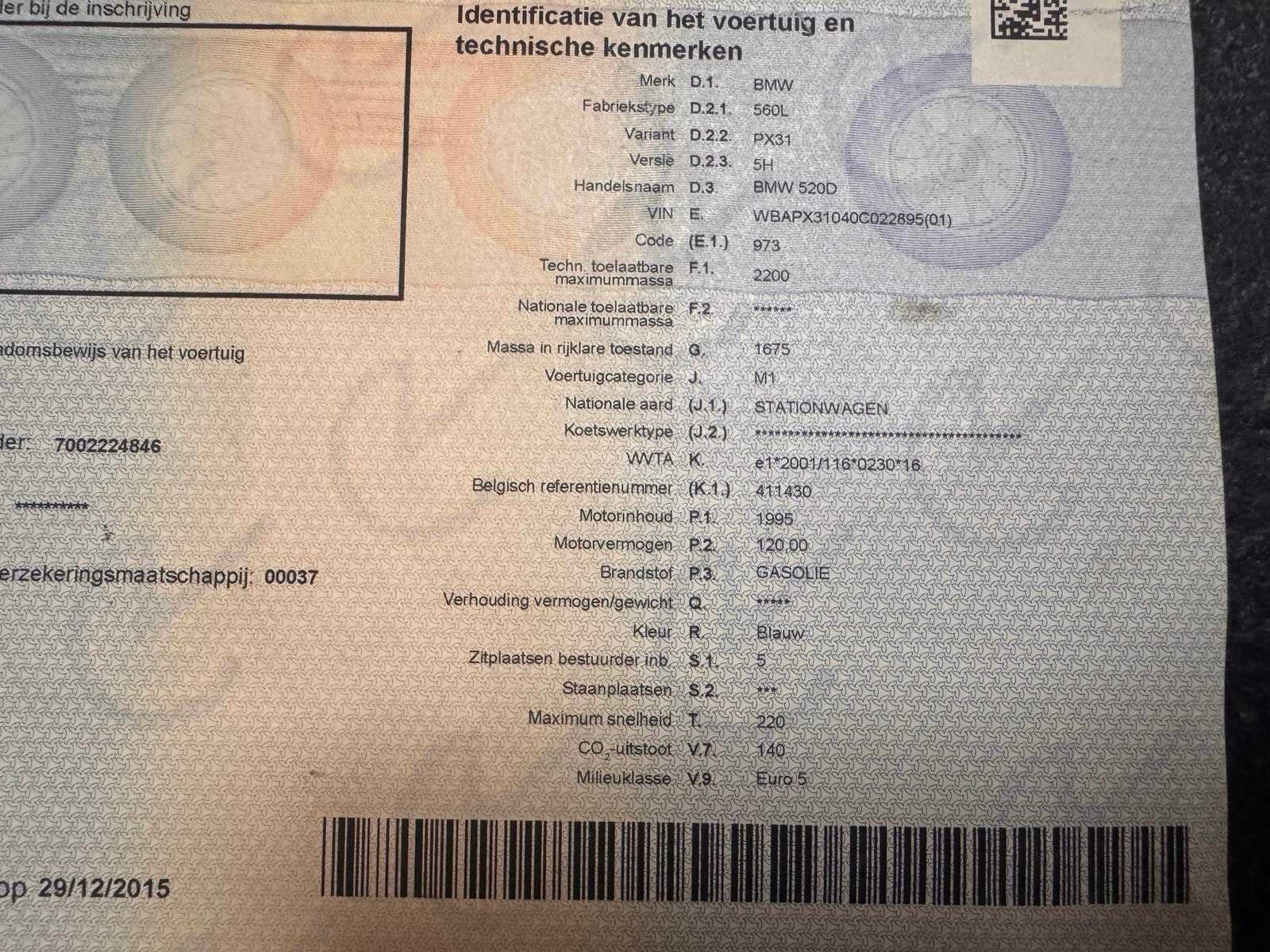 Wagen start en rijdt. Zie foto’s voor documenten en verdere details van de wagen. Nee Merk: BMW Model: 520D Bouwjaar: 2009 Afgelezen kilometerstand: 306043km Cilinderinhoud: 1995cc Vermogen (kW): 120kW Brandstof: diesel Chassisnummer: WBAPX31040C022895 Datum eerste toelating: 16/11/2009 Aantal zitplaatsen: 5 Kleur: Blauw Transmissie: Handgeschakeld Emissieklasse: Euro 5 Aantal sleutels: 2 Nationaliteit documenten: België Start en rijdt: Ja Vavato voert geen technische keuring uit.: true Inschrijvingsbewijs - deel 1 : Aanwezig Inschrijvingsbewijs - deel 2: Aanwezig