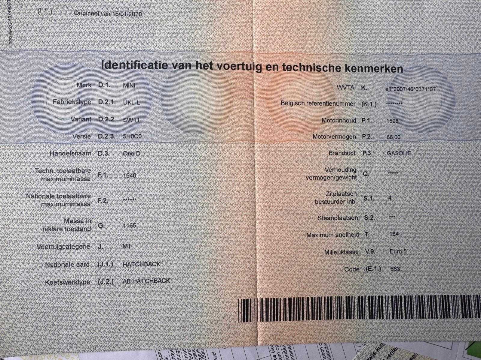 De wagen start en rijdt zonder problemen. Documenten aanwezig, zie foto’s voor verdere details. Nee Merk: Mini Model: One D Bouwjaar: 2012 Afgelezen kilometerstand: 162963km Cilinderinhoud: 1598cc Vermogen (kW): 66kW Brandstof: diesel Chassisnummer: WMWSW11070T461123 Datum eerste toelating: 27/09/2012 Aantal zitplaatsen: 4 Transmissie: Handgeschakeld Emissieklasse: Euro 5 Nationaliteit documenten: België Start en rijdt: Ja Vavato voert geen technische keuring uit.: true Airconditioning: true Navigatie: true Inschrijvingsbewijs - deel 1 : Aanwezig Inschrijvingsbewijs - deel 2: Aanwezig