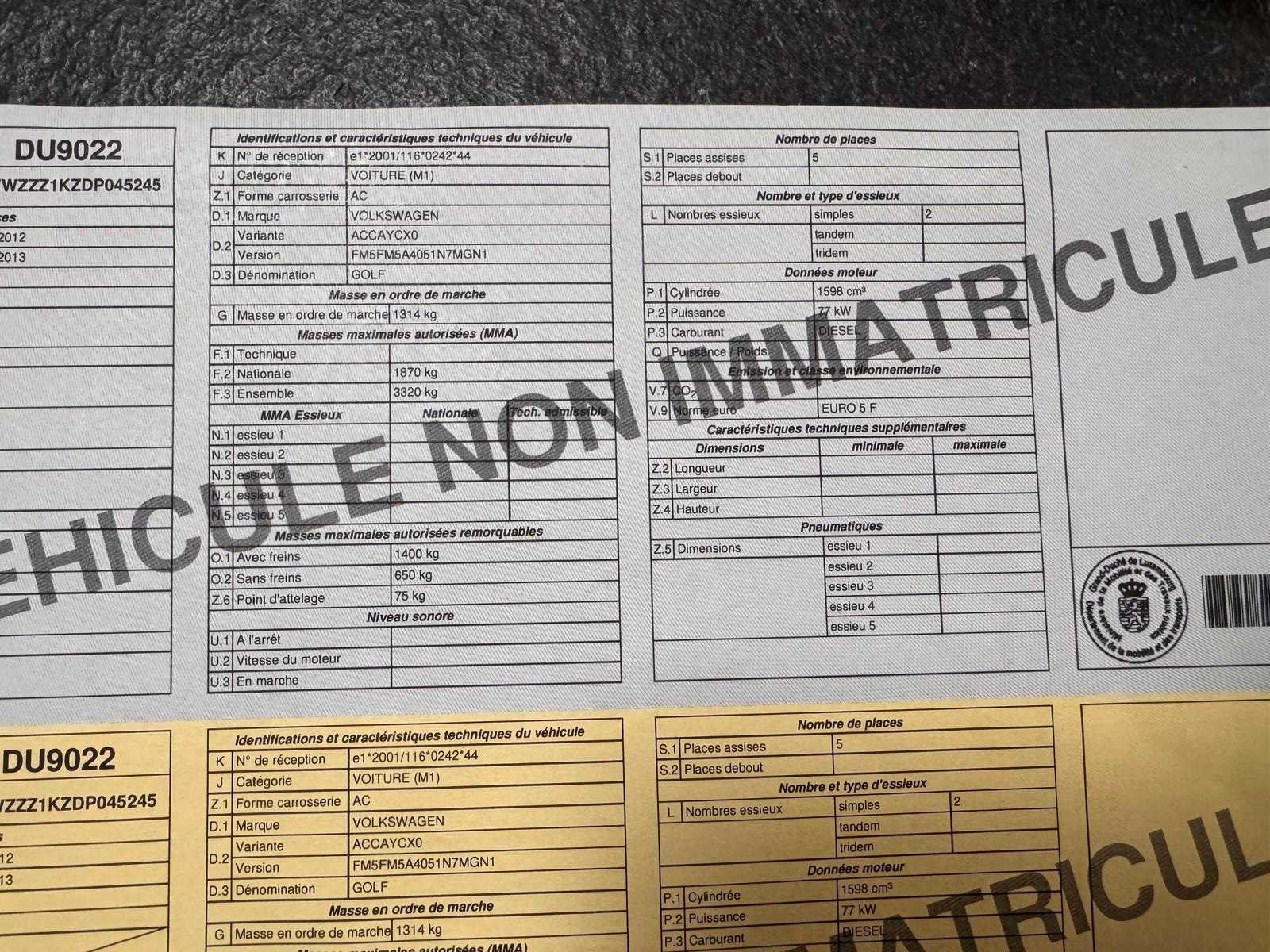 Nee Merk: Volkswagen Model: Golf Bouwjaar: 2012 Afgelezen kilometerstand: 159714km Cilinderinhoud: 1598cc Vermogen (kW): 77kW Brandstof: diesel Chassisnummer: WVWZZZ1KZDP045245 Datum eerste toelating: 19/10/2012 Aantal zitplaatsen: 5 Kleur: Wit Emissieklasse: Euro 5F Nationaliteit documenten: Luxemburg Start en rijdt: Ja Vavato voert geen technische keuring uit.: true
