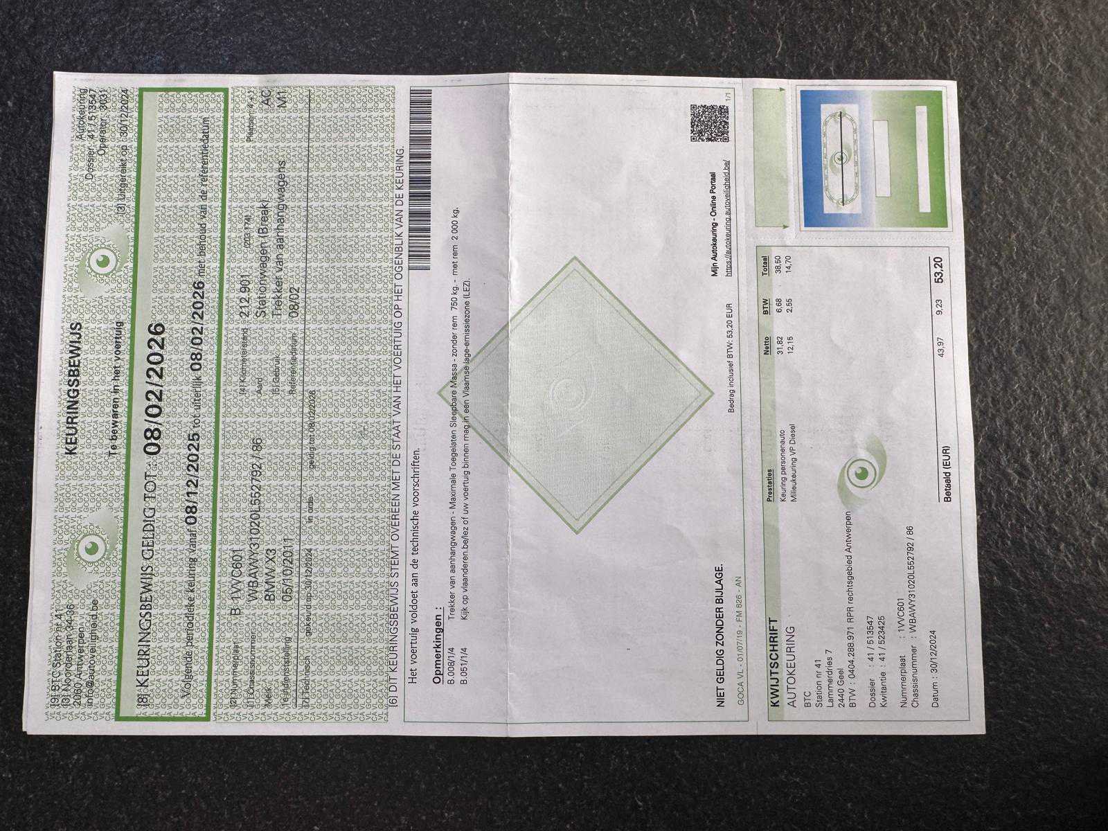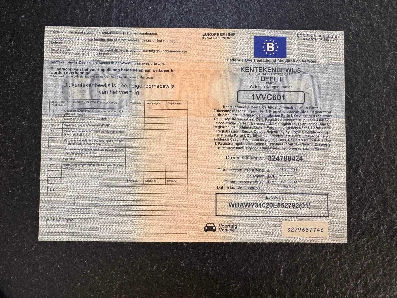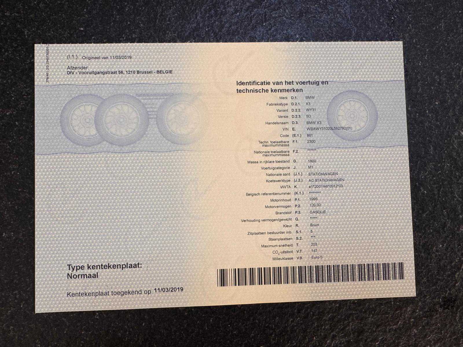 Deze wagen start en rijdt zonder problemen. Documenten aanwezig, zie foto’s voor verdere details. Nee Merk: BMW Model: X3 Bouwjaar: 2011 Afgelezen kilometerstand: 222689km Cilinderinhoud: 1995cc Vermogen (kW): 120kW Brandstof: diesel Chassisnummer: WBAWY31020L552792 Datum eerste toelating: 05/10/2011 Aantal zitplaatsen: 5 Transmissie: Automaat Emissieklasse: Euro 5 Aantal sleutels: 2 Nationaliteit documenten: België Start en rijdt: Ja Vavato voert geen technische keuring uit.: true Inschrijvingsbewijs - deel 1 : Aanwezig Inschrijvingsbewijs - deel 2: Aanwezig