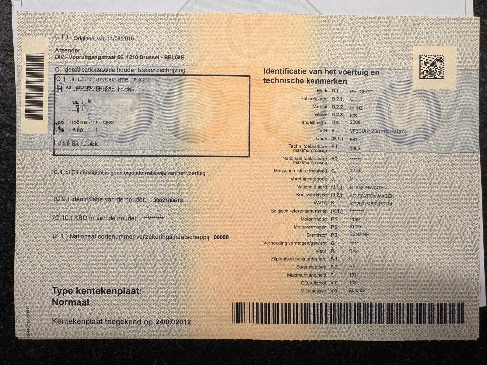 Deze wagen start en rijdt zonder problemen. Documenten aanwezig, zie foto’s voor verdere details. Nee Merk: Peugeot Model: 2008 Bouwjaar: 2016 Afgelezen kilometerstand: 85845km Cilinderinhoud: 1199cc Vermogen (kW): 81kW Brandstof: benzine Chassisnummer: VF3CUHNZ6GY115701 Datum eerste toelating: 11/08/2016 Aantal zitplaatsen: 5 Kleur: Bruin Emissieklasse: Euro 6b Nationaliteit documenten: België Start en rijdt: Ja Vavato voert geen technische keuring uit.: true Inschrijvingsbewijs - deel 1 : Aanwezig Inschrijvingsbewijs - deel 2: Aanwezig