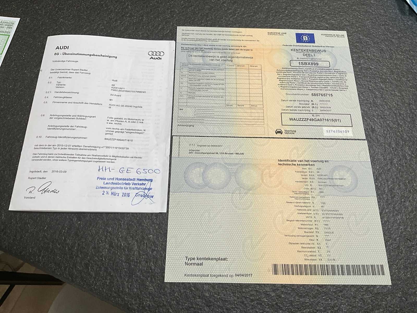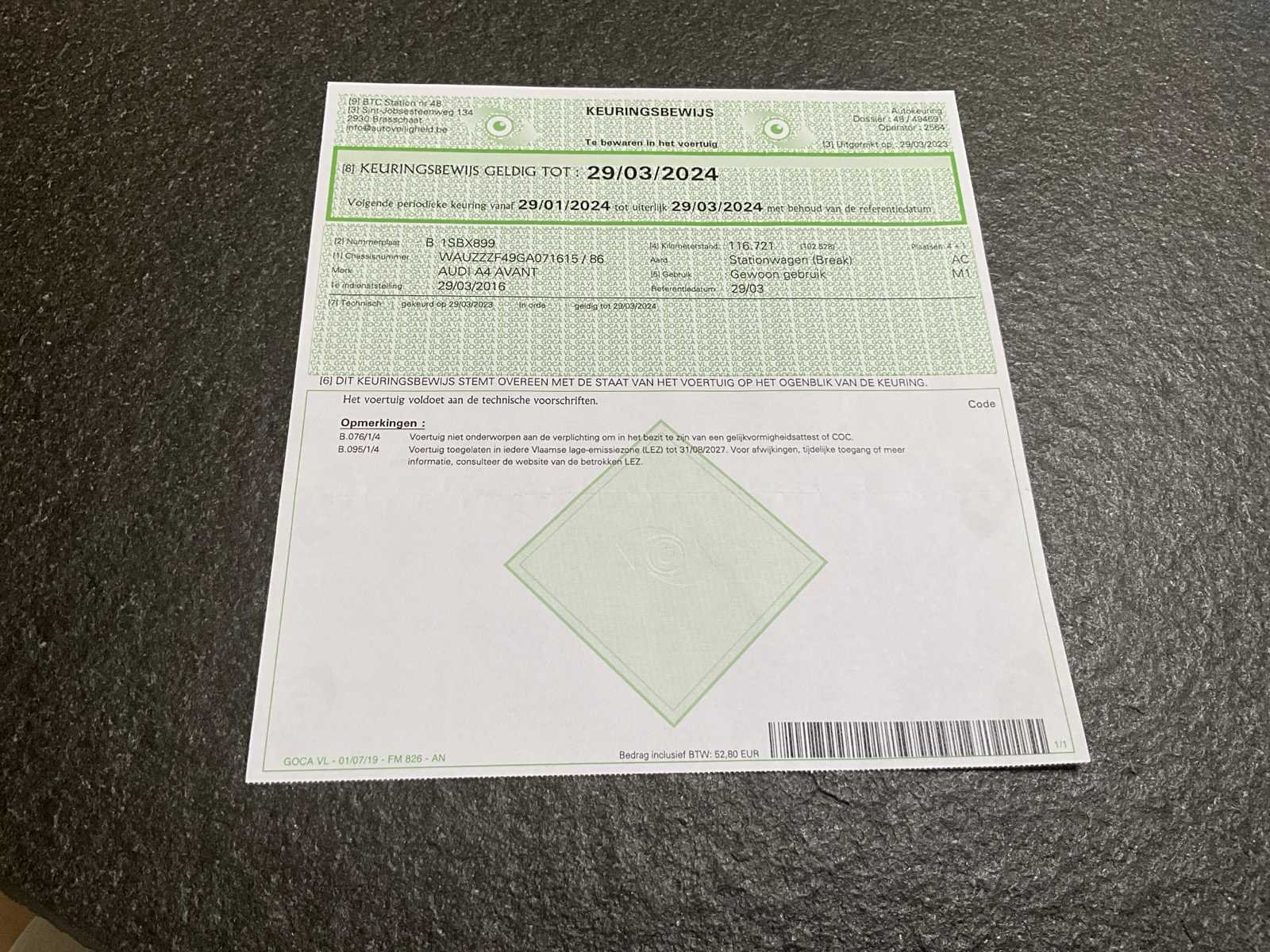 Audi A4 Avant van het bouwjaar 2016. De wagen start en rijdt. Documenten aanwezig. Nee Merk: Audi Model: A4 Avant Bouwjaar: 2016 Afgelezen kilometerstand: 121959km Cilinderinhoud: 1968cc Vermogen (kW): 110kW Brandstof: diesel Chassisnummer: WAUZZZF49GA071615 Datum eerste toelating: 29/03/2016 Aantal zitplaatsen: 5 Kleur: Zwart Transmissie: Automaat Emissieklasse: Euro 6b Aantal deuren: 5 Aantal sleutels: 1 Nationaliteit documenten: België Start en rijdt: Ja Vavato voert geen technische keuring uit.: true Airconditioning: true Navigatie: true Leder bekleed: true Inschrijvingsbewijs - deel 1 : Aanwezig Inschrijvingsbewijs - deel 2: Aanwezig