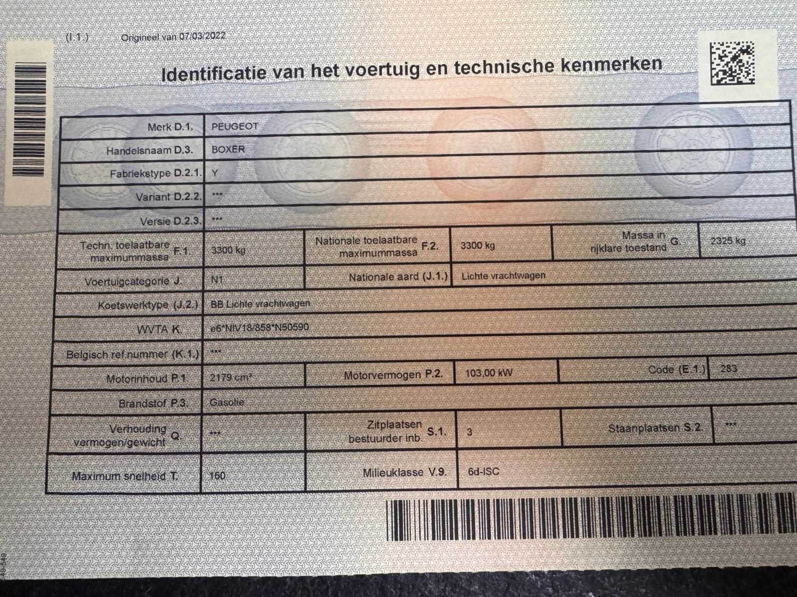 Start en rijdt Nee Merk: Peugeot Model: Boxer Chassisnummer: VF3YBBNFA12R49387 Aantal zitplaatsen: 3 Transmissie: Handgeschakeld Datum eerste toelating: 14/01/2021 Bouwjaar: 2021 Afgelezen kilometerstand: 92567km Vermogen (kW): 103kW Cilinderinhoud: 2179cc Emissieklasse: 6d-ISC Brandstof: Diesel Kleur: Grijs