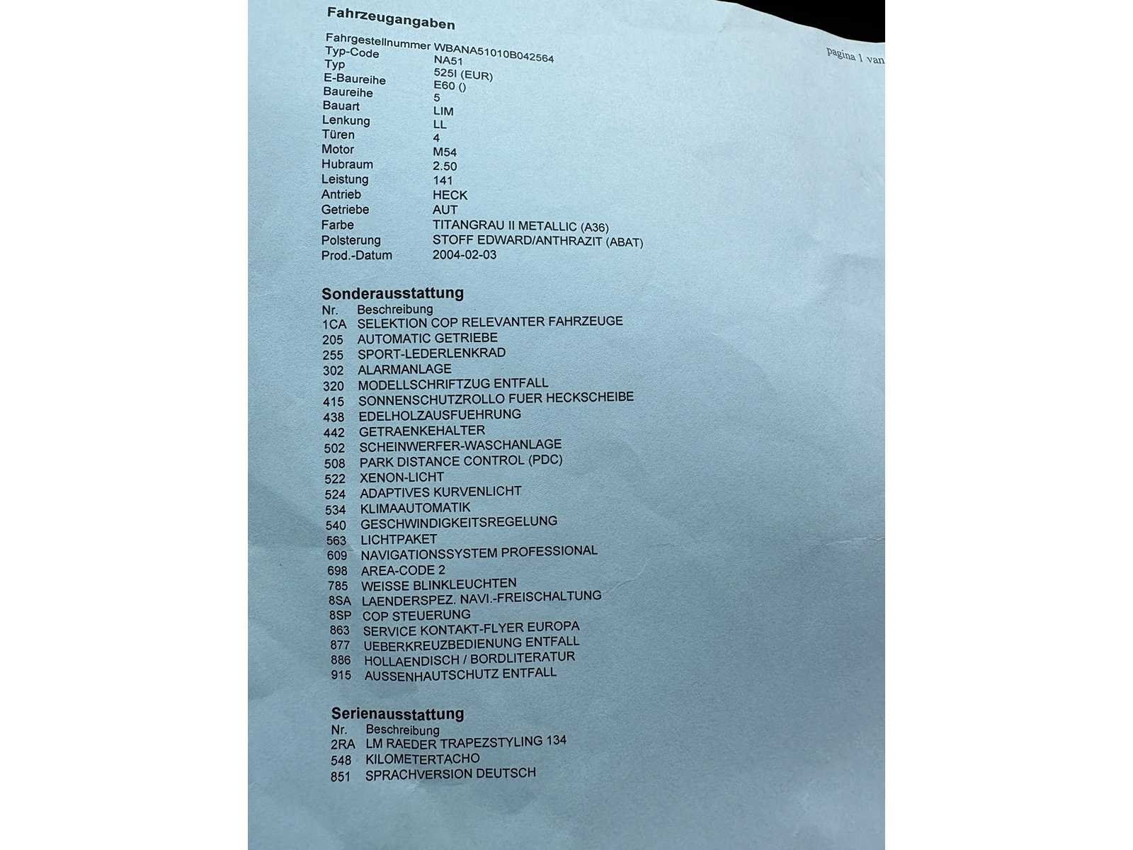 Nederlandse auto dient overgechreven te worden kosten koper export papieren kunnen ook door ons geregeld worden 100 euro of met verzekering 250 euro onderhouds facturen erbij No Kenteken: 41ntrf Merk: BMW Model: 5-serie Type: 525i Executive Bouwjaar: 2004 Cilinderinhoud: 2494cc Vermogen (kW): 141kW Brandstof: benzine Datum eerste toelating: 2004-03-06 Datum eerste toelating (NL): 2004-03-06 APK vervaldatum: 2026-02-24 Vermogen (pk): 189hp Aantal zitplaatsen: 5 Maximaal trekgewicht ongeremd: 2000kg Maximaal trekgewicht geremd: 750kg Kleur: paars Transmissie: Aut. Stuurwiel: sport Emissieklasse: 4 Aantal deuren: 4 Aantal sleutels: 1 Ledig gewicht: 1475kg Bruto BPM (NL): 16159€ Aantal cilinders: 6 Carrosserie: Sedan Onderhoudshistorie: ja Carfax Link: https://was.carfax.eu/v0/api/ccdid/5100016408/svc/201/vinreg/41NTRF/checksum/eyJhbGciOiJIUzI1NiIsInR5cCI6IkpXVCJ9.eyJleHAiOjE3NzYwMTQwODR9.XlcnwvAmvytSnp9CddpKp5RL62Vz5Pa7sRa4QoiDkqw Start en rijdt: ja startinformatie : ja Airconditioning: true Navigatie: true Xenon verlichting: true Leder bekleed: true