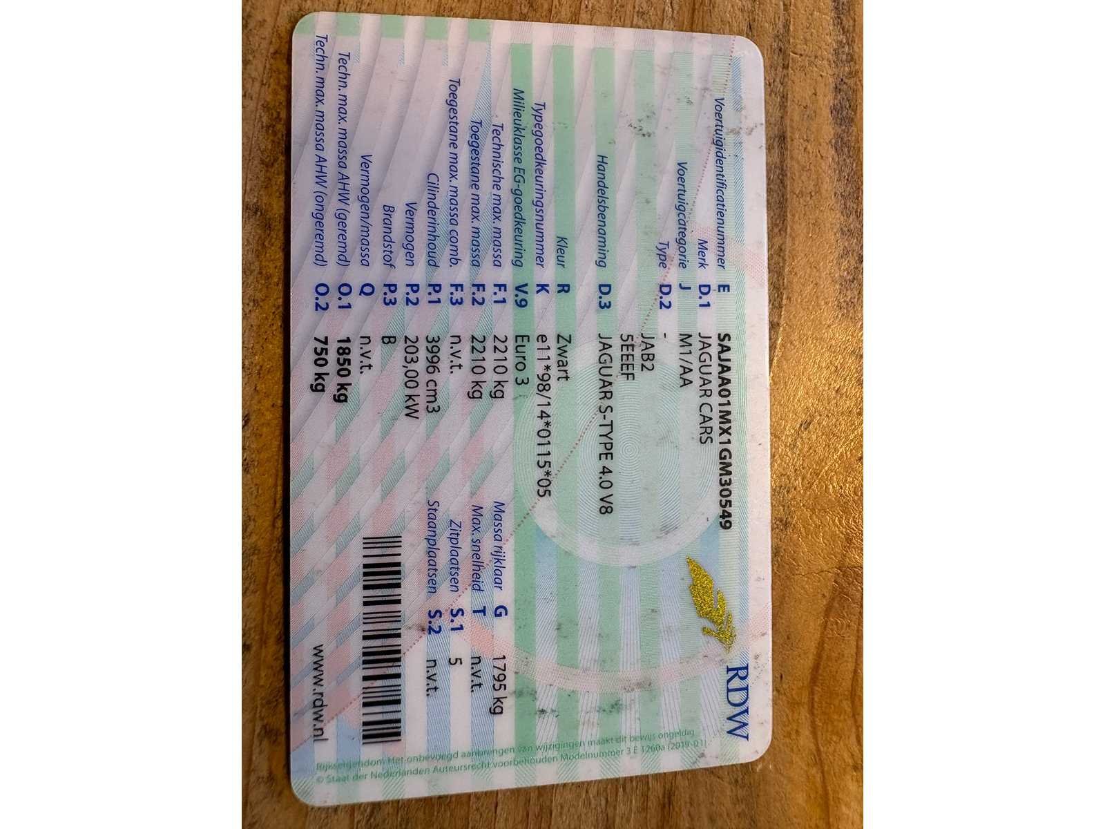 Auto heeft nederlands kenteken moet overgeschreven worden kosten koper Export papieren op naam 100 euro links achter rem zit vast No Kenteken: 33jgp8 Merk: Jaguar Model: S-type Type: 4.0 V8 Bouwjaar: 2001 Cilinderinhoud: 3996cc Vermogen (kW): 203kW Brandstof: Benzine Datum eerste toelating: 2001-07-31 APK vervaldatum: 2023-07-29 Vermogen (pk): 272hp Aantal zitplaatsen: 5 Maximaal trekgewicht ongeremd: 1850kg Maximaal trekgewicht geremd: 750kg Kleur: zwart Transmissie: Automatisch (null) Emissieklasse: 3 Aantal deuren: 4 Ledig gewicht: 1695kg Bruto BPM (NL): 18358€ Aantal cilinders: 8 Carrosserie: Sedan Nationaliteit documenten: nederland Carfax Link: https://was.carfax.eu/v0/api/ccdid/5100016408/svc/201/vinreg/33JGP8/checksum/eyJhbGciOiJIUzI1NiIsInR5cCI6IkpXVCJ9.eyJleHAiOjE3Nzc3Mzg2Mjh9.V5PPdhD2xGRYT0U01PThxxCCZMv57aS5eWgVmsjDl-Q startinformatie : ja Airconditioning: true
