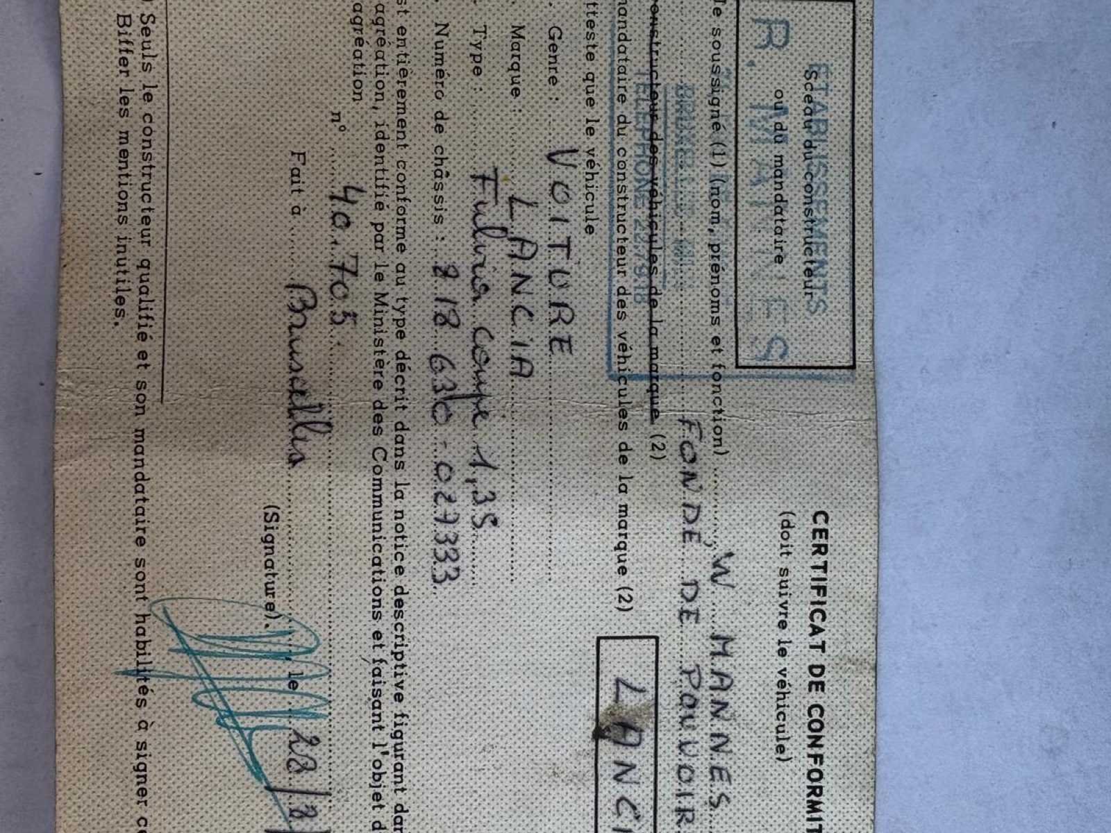 De motor draait rond maar slaat niet aan. (Heeft recent nog gedraaid). Wagen is compleet maar heeft restauratie nodig . Vloerplaten zijn ok, buitendorpels en binnendorpels te vervangen, alsook deurboorden . Trim compleet en onbeschadigd. Alle Belgische documenten aanwezig . No Merk: Lancia Type: Fulvia 13s Bouwjaar: 1972 Datum eerste inschrijving: 11/09/1972 Nationaliteit documenten: Belgisch
