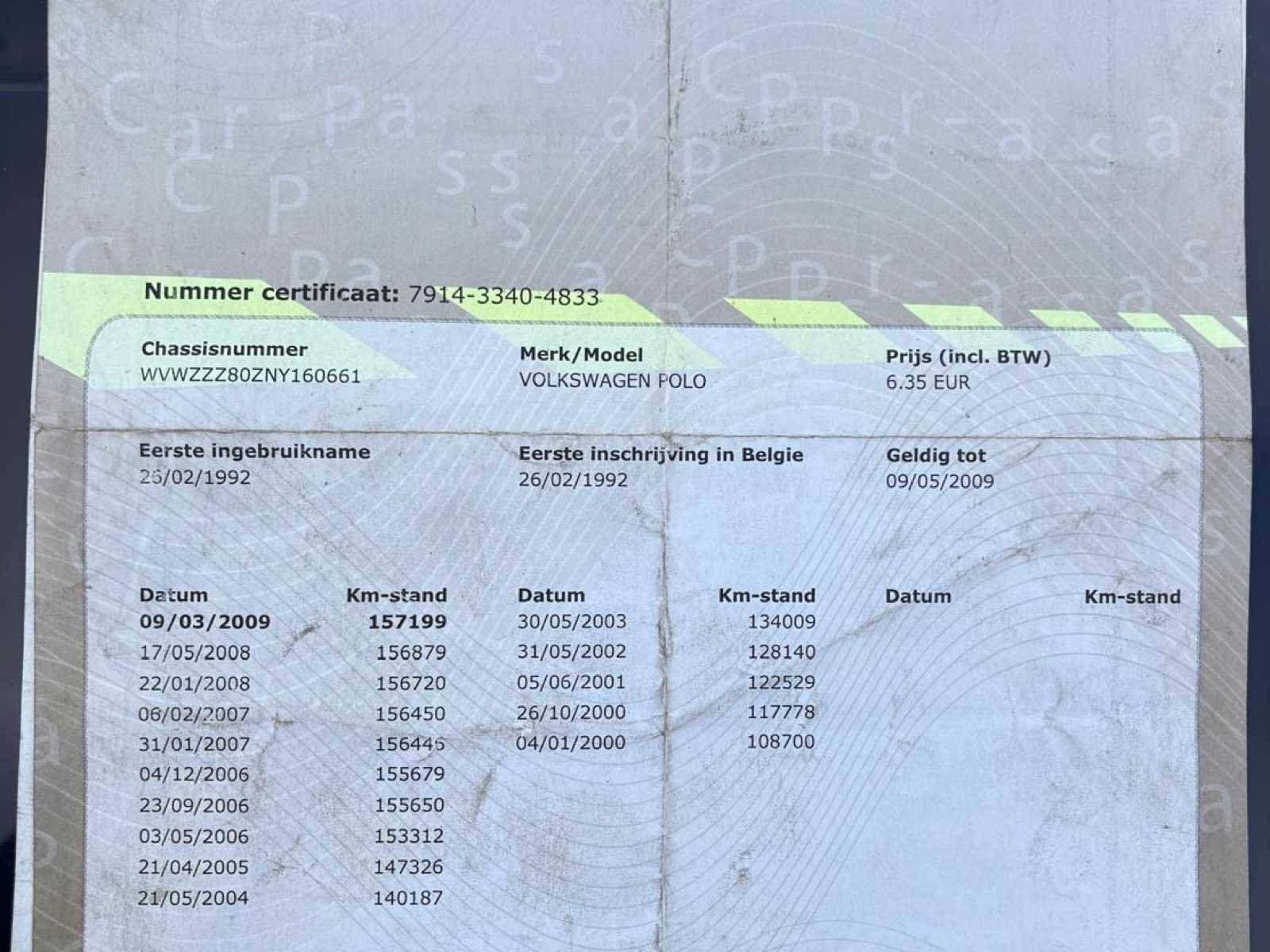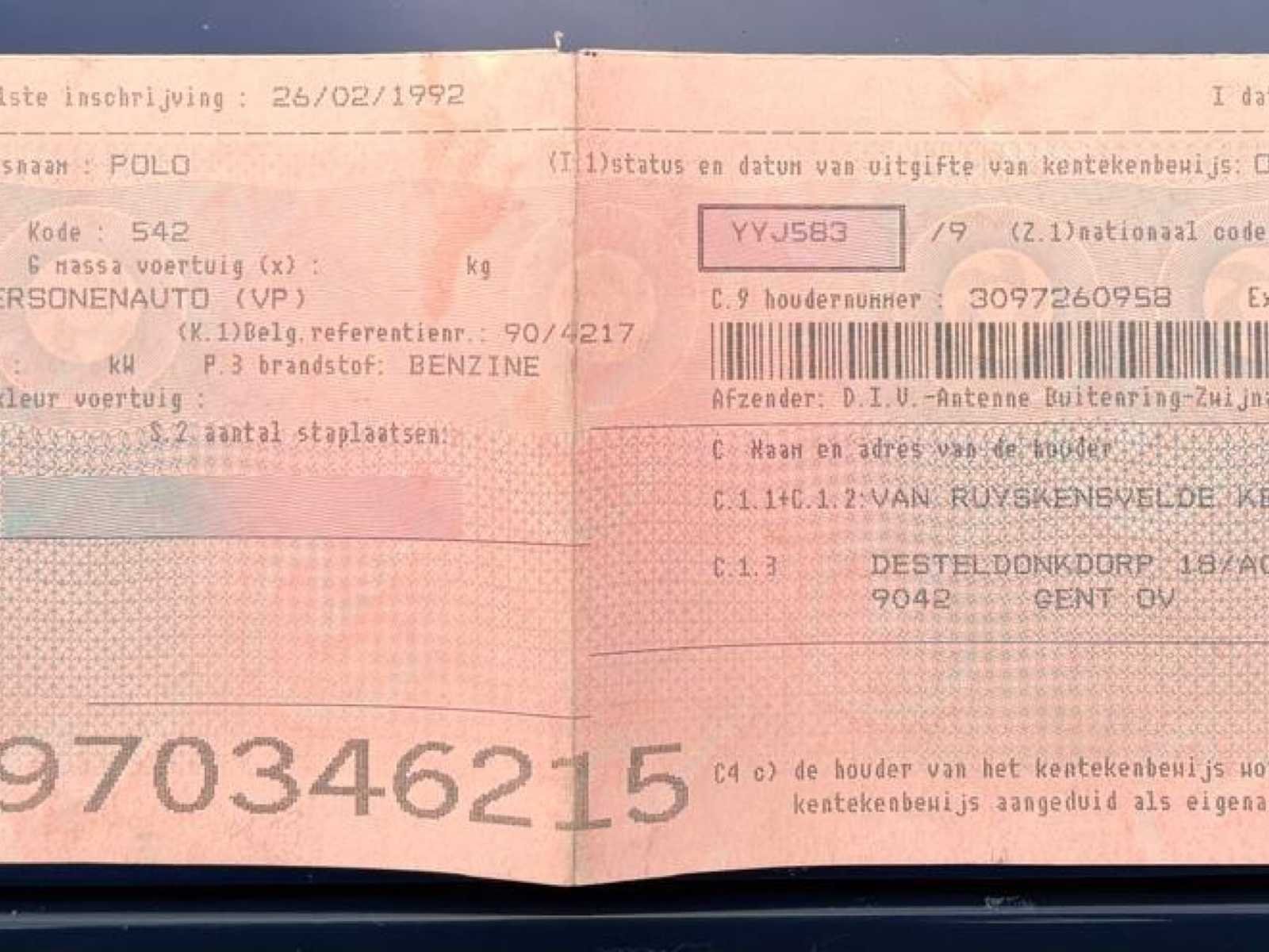 Alle Belgische documenten aanwezig. Kan als dagelijks gebruik of als oldtimer worden ingeschreven. Need some tlc. No Merk: Volkswagen Type: Polo Bouwjaar: 1992 Afgelezen kilometerstand: 131471 Brandstof: Benzine Datum eerste inschrijving: 26/02/1992 Nationaliteit documenten: Belgisch Startinformatie: Start en rijdt Cilinderinhoud: 1000 Inschrijvingsbewijs - deel 1 : Aanwezig Inschrijvingsbewijs - deel 2: Aanwezig