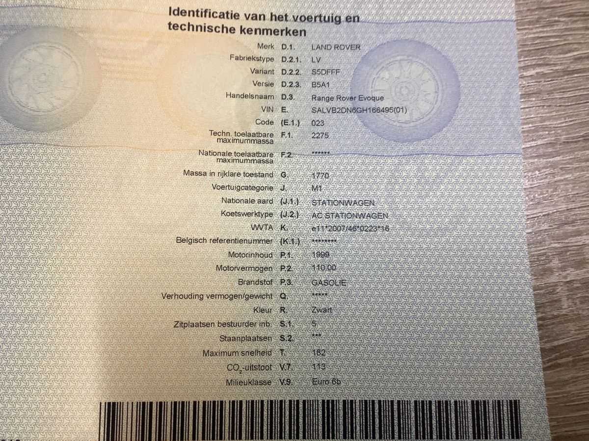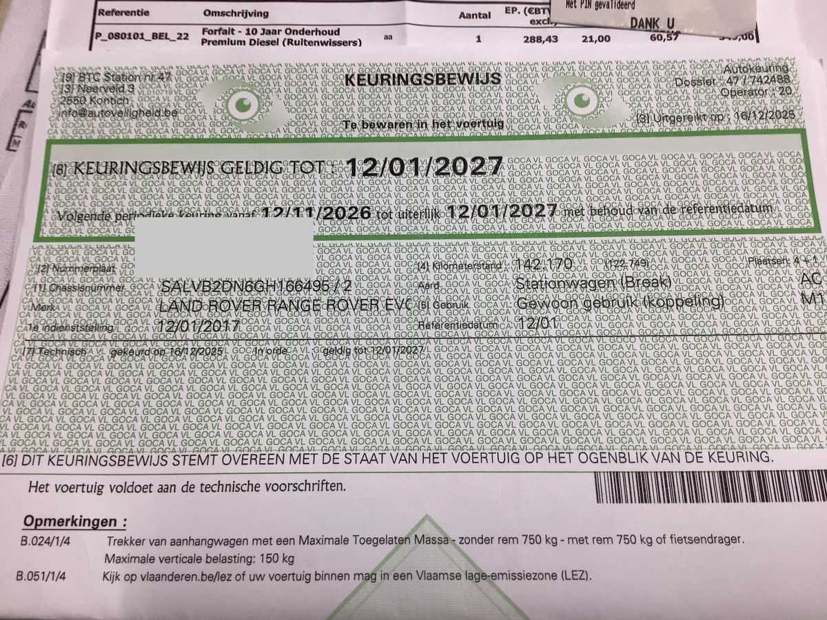 Zetelverwarming voor en achteraan. Panoramisch dak. Afneembare trekhaak. Origineel zwart kleur. Eerste eigenaar - ongevalvrije wagen. Gelijkvormigheidsattest coc aanwezig. De wagen werd op 16/12/2025 blanco gekeurd. Volledige onderhoudshistorie aanwezig zie foto’s. Laatst onderhouden op 136 966km - 05-08-2025. Nee Merk: Land Rover Model: Range rover evoque Type: 2.0 Td4 pure Bouwjaar: 2017 Afgelezen kilometerstand: 146530km Cilinderinhoud: 1999cc Vermogen (kW): 110kW Brandstof: diesel Chassisnummer: SALVB2DN6GH166495/2 Transmissie: Handgeschakeld Emissieklasse: EURO 6b Aantal sleutels: 2 Nationaliteit documenten: Belgisch Onderhoudshistorie: Aanwezig Start en rijdt: Ja Keuringsrapport geldig tot: 12/01/2027 startinformatie : Start en rijdt Inschrijvingsbewijs - deel 1 : Aanwezig Inschrijvingsbewijs - deel 2: Aanwezig
