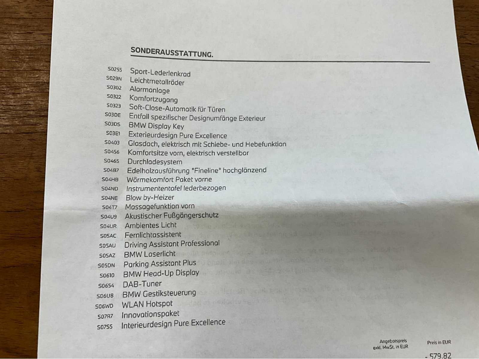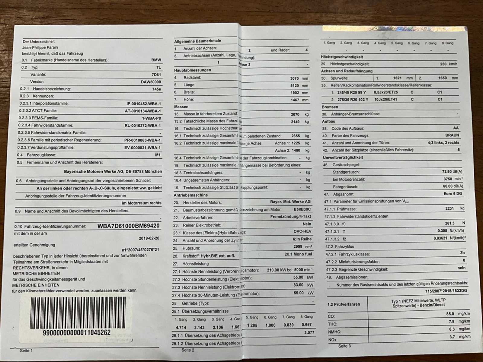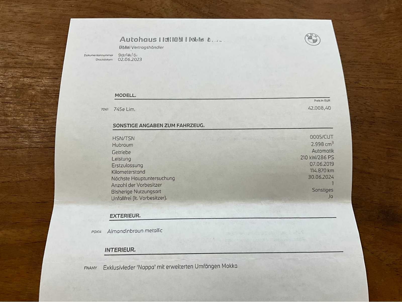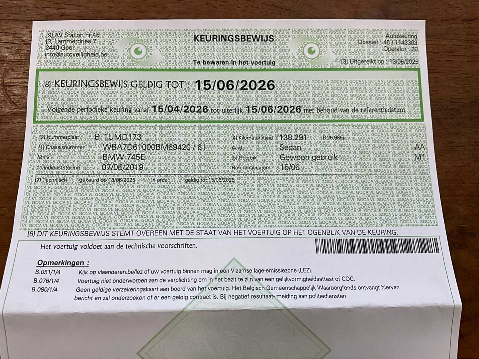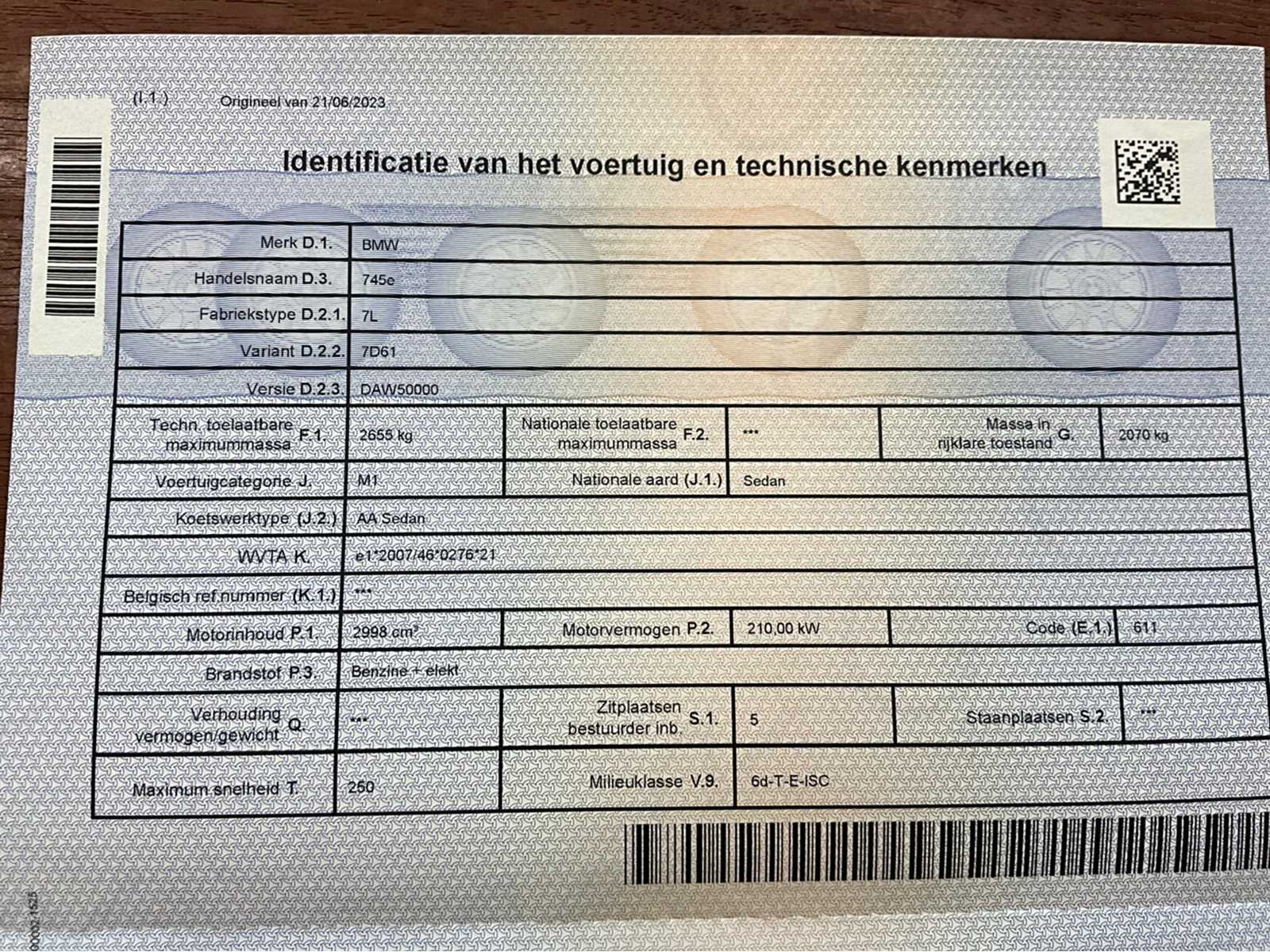 Een uitzonderlijk complete executive limousine met innovatieve plug-in hybrid technologie, hoog comfort, exclusieve inrichting en een zeer rijk optiepakket. Deze 7-Reeks biedt dat wat een hoogwaardige topklasse BMW zo begeerlijk maakt: imposante presence, verfijnde luxe en intelligente technologie — perfect als representatieve zakenwagen of comfortabele reisauto - EXTERIEUR: Kleur: Amandinbraun Metallic, Velgen: 19” BMW lichtmetalen velgen (sportief en elegant), BMW Laserlicht – ultra heldere en efficiënte koplampen, Soft-close deuren – deuren sluiten geruisloos en luxe, Pure Excellence designlijn, Ronde Pirelli / Bridgestone banden (goede profieldiepte) - INTERIEUR: Nappa leder “Mokka” met hoogwaardige afwerkingen, Volledig elektrisch verstelbare comfortstoelen voor, Massagefunctie voorstoelen, Lederbekleed dashboard, Ambient lighting (interieur sfeerverlichting), Doorlaadsysteem voor maximum bagageruimte, Hoofdsteunen met extra comfort, Elektrisch panoramadak (schuif- en kantelfunctie), Klimaatcomfort met meerdere zones, Ergonomische stoelen met memoryfunctie - TECHNOLOGIE: BMW Head-Up Display – rijinformatie in ooghoek, BMW Gesture Control – bediening met handgebaren, WLAN Hotspot + DAB-Tuner, Groot media- en navigatiescherm, BMW Display Key, Digital Instrument Cluster, Volledig digitaal infotainmentsysteem, Bluetooth / smartphone integratie, Voice control / spraakopdrachten - RIJHULP & VEILIGHEID (FULL ASSISTANCE): Driving Assistant Professional – activerende assistentiesystemen, Parking Assistant Plus met camera- en parkeersensoren, Rijstrookassistent, Grootlichtassistent, Adaptieve cruise / afstandsregelaar, Verkeersbordherkenning Alarminstallatie, Elektrische parkeerrem, Stabiliteits- en tractiecontrole, Airbagsystemen compleet - steeds onderhouden bij officiële BMW-dealer (historiek digitaal op te vragen), laatste onderhoud op 126951km, geen foutmeldingen op dashboard, ook niet bij het laden - LAADKABEL INBEGREPEN No Merk: BMW Model: 745E Type: sedan Bouwjaar: 2019 Afgelezen kilometerstand: 145000km Cilinderinhoud: 2998cc Vermogen (kW): 210kW Brandstof: hybride (elektrisch+benzine) Chassisnummer: WBA7D61000BM69420 Datum eerste toelating: 7/6/2019 Aantal zitplaatsen: 5 Kleur: Amandinbraun Metallic Transmissie: automaat Emissieklasse: Euro 6d Aantal deuren: 5 Aantal sleutels: 2 Ledig gewicht: 2070kg Nationaliteit documenten: B Onderhoudshistorie: ja Start en rijdt: ja Keuringsrapport geldig tot: 15/6/2026 Zichtbare schade: nee Vavato voert geen technische keuring uit.: true Airconditioning: true Navigatie: true Xenon verlichting: false Leder bekleed: true Inschrijvingsbewijs - deel 1 : Aanwezig Inschrijvingsbewijs - deel 2: Aanwezig