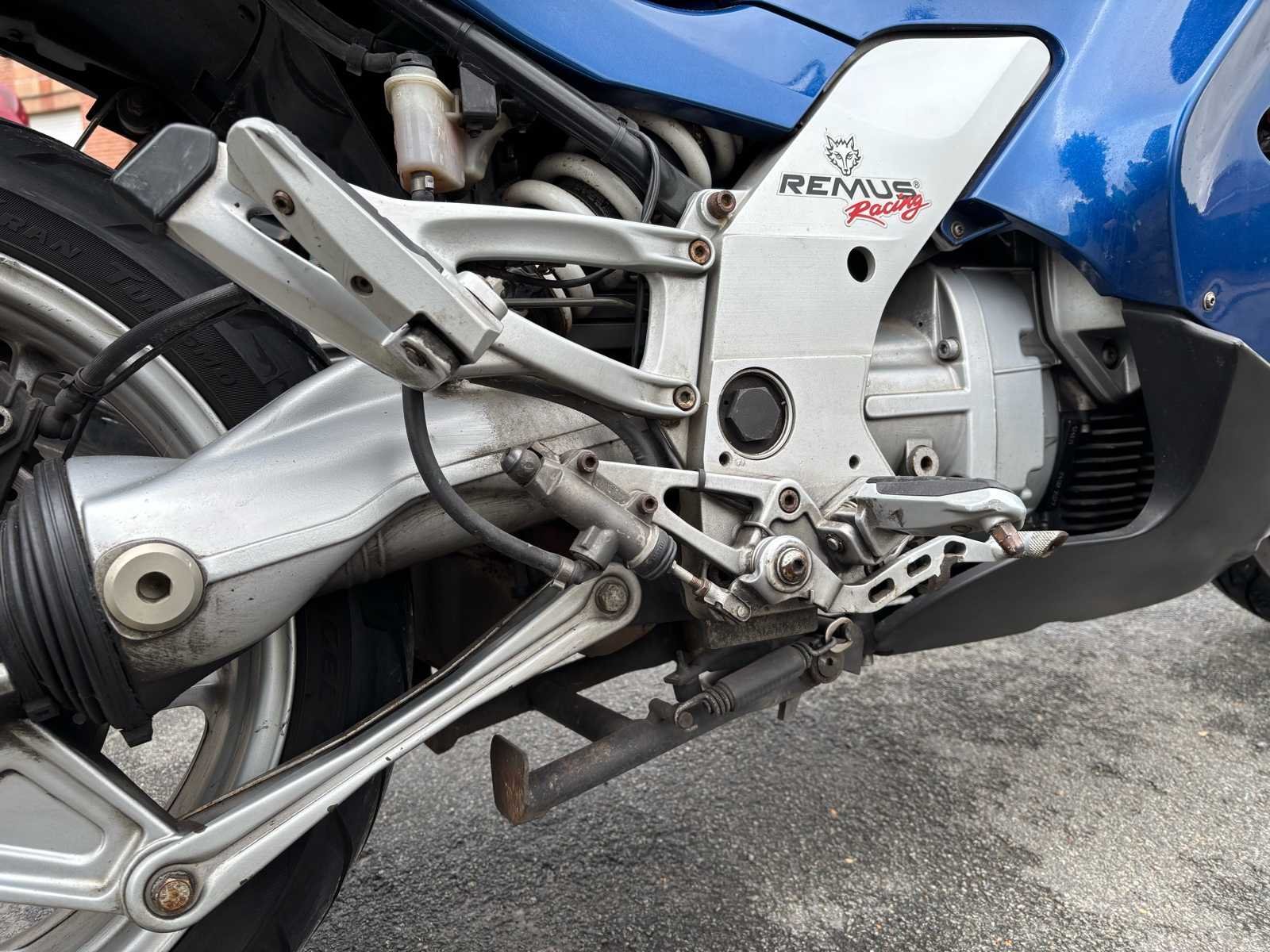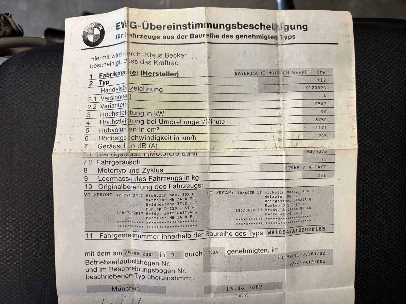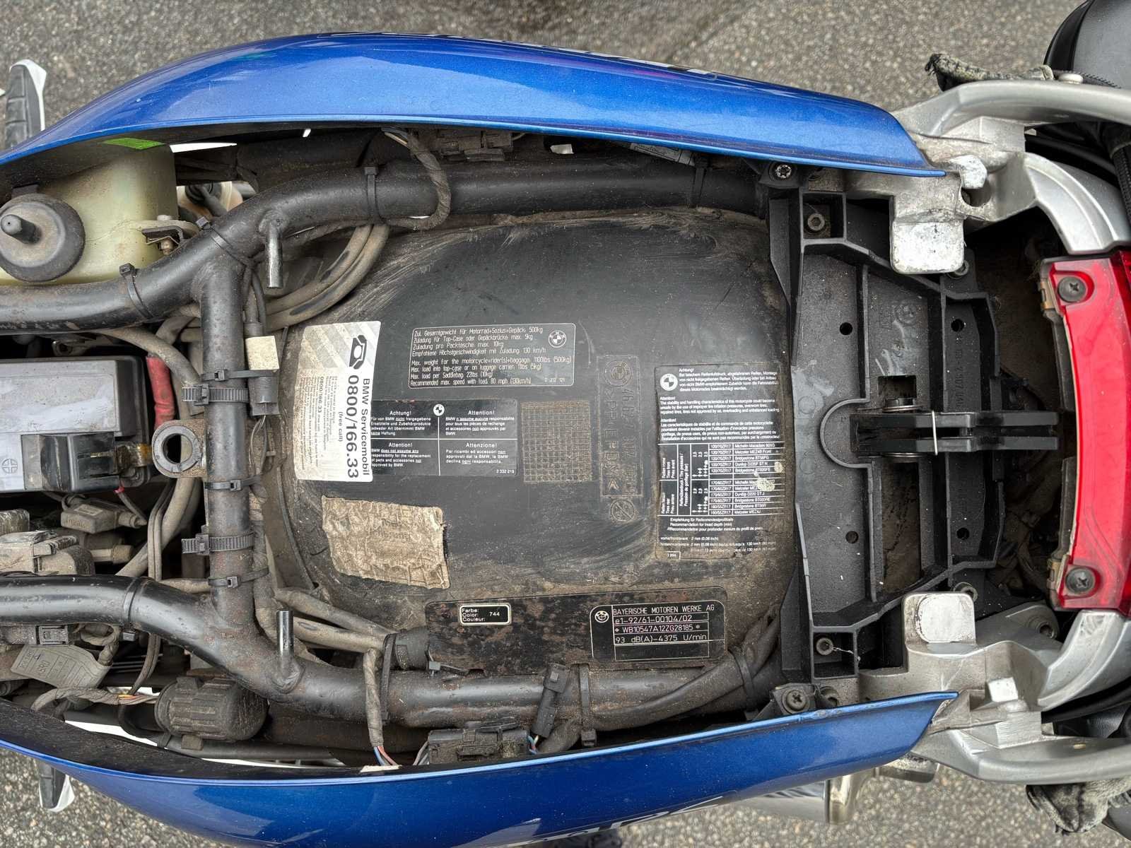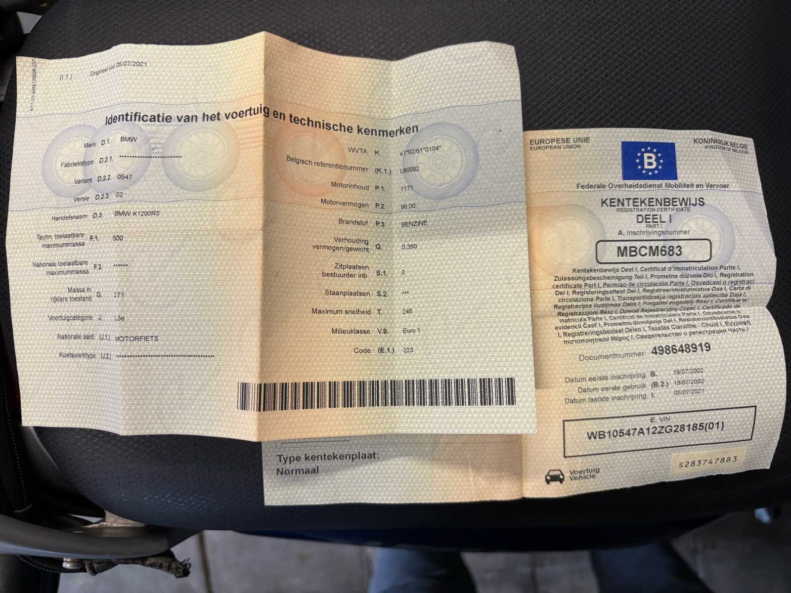 - Heeft vorig jaar zijn groot onderhoud gekregen en werd voorzien van 2 nieuwe banden! - Windscherm handmatig verstelbaar in hoogte. - Voorzien van werkende handvat verwarming. - Pinkend ABS lampje is standaard bij opstart, dit verdwijnt vanaf de motor in beweging komt. No Merk: BMW Model: K1200 RS Brandstof: Benzine Chassisnummer: WB10547A12ZG28185 Cilinderinhoud: 1171cc Datum eerste toelating: 19/07/2002 Gewicht: 271kg Vermogen (kW): 96kW Kleur: Blauw Afgelezen kilometerstand: 114768km Nationaliteit documenten: BE Aantal sleutels: 1 Boorddocumenten aanwezig?: true Startinformatie: Start, rijdt, remt & onderhoud gekregen in 2025 Bouwjaar: 2002