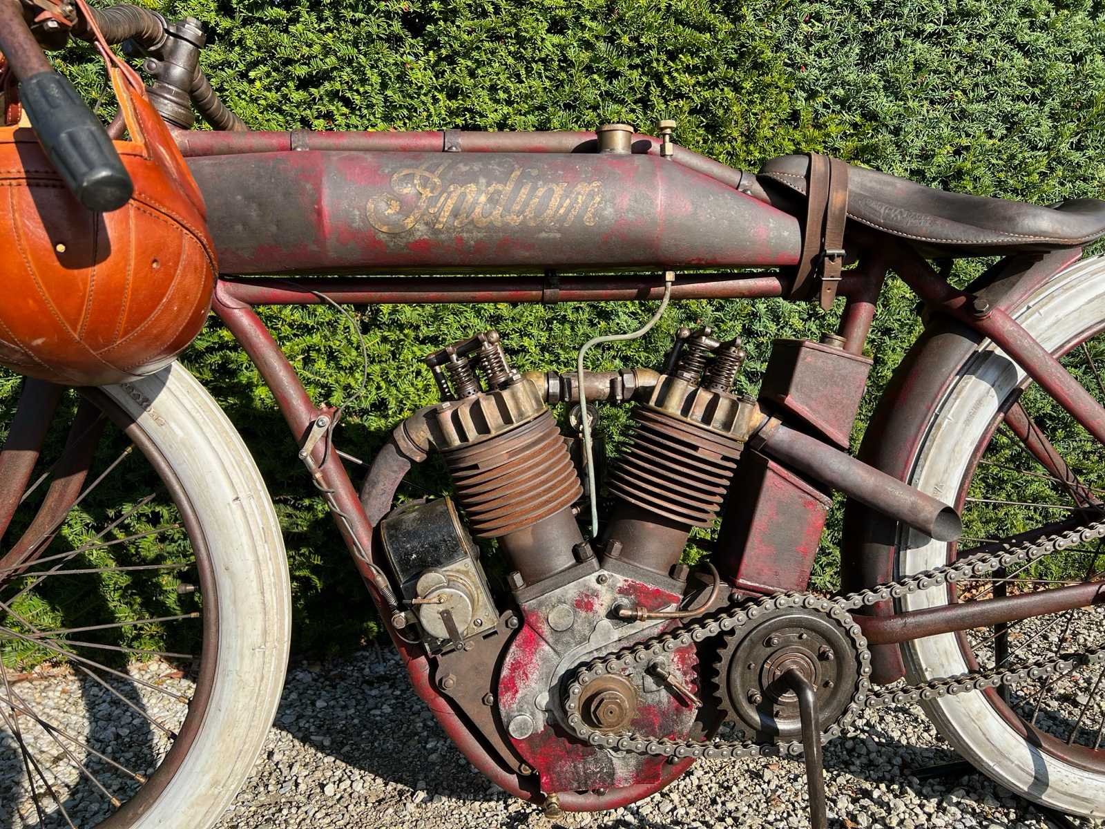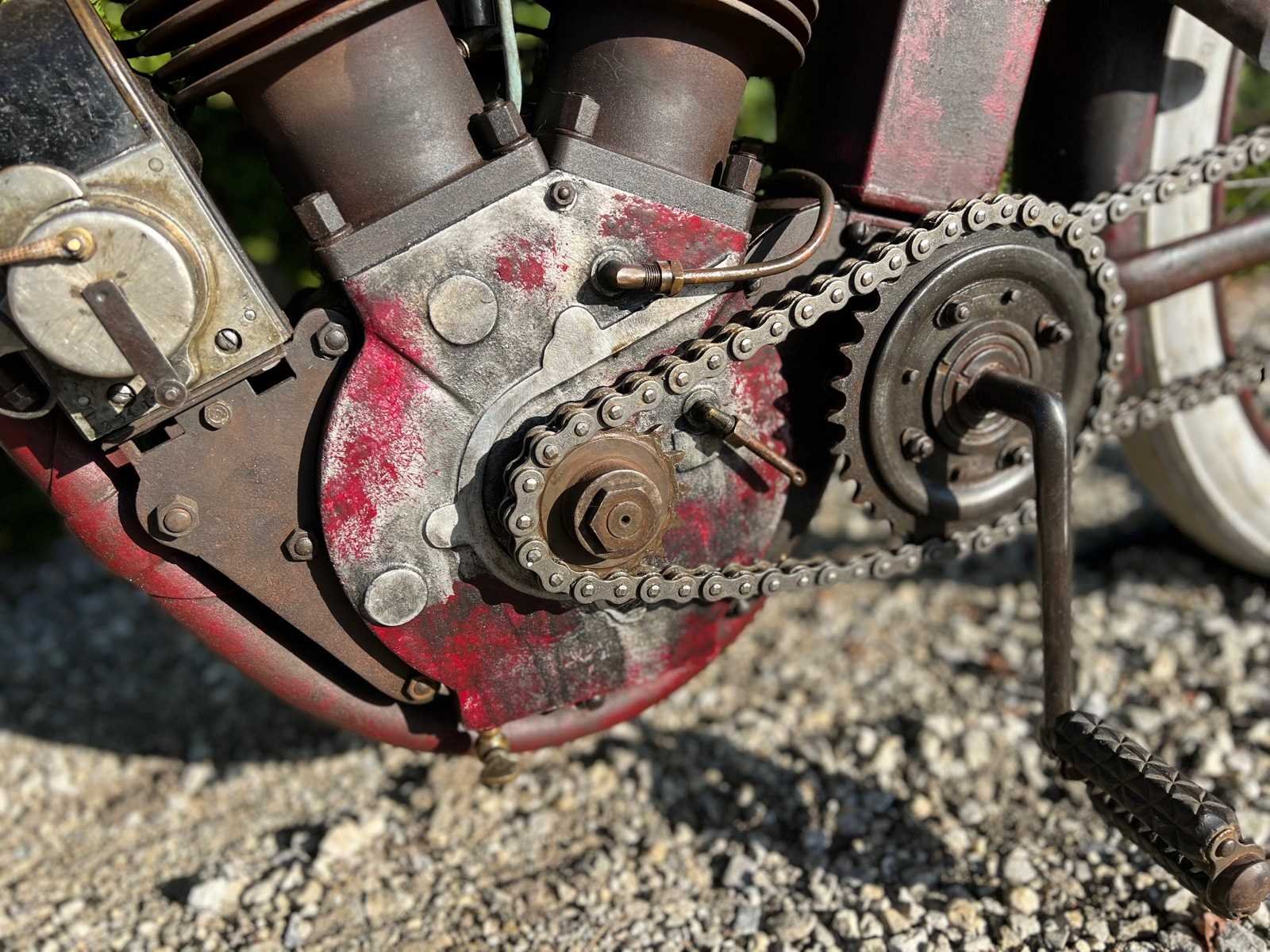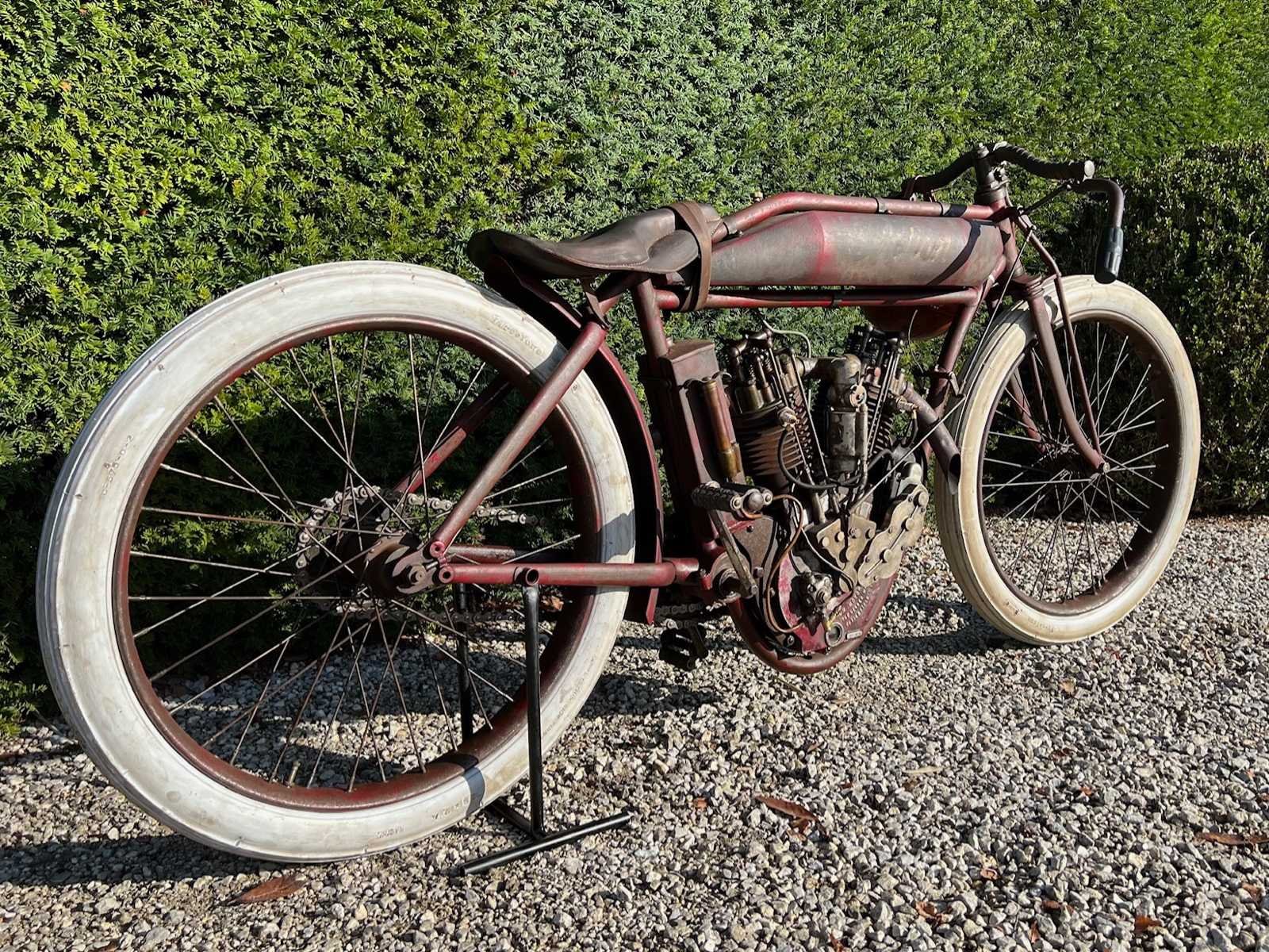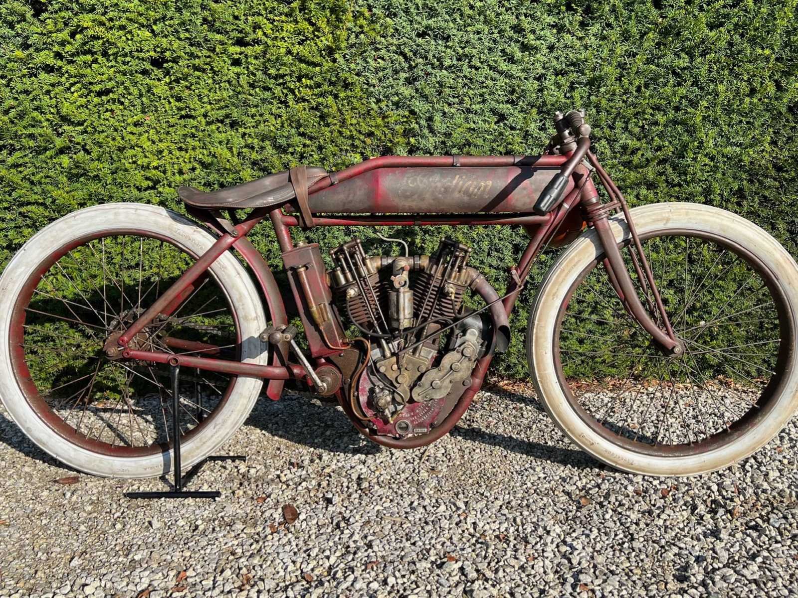 Indian 1000cc 8 klepper racer met een super patina en in rijdende staat... wie durft. Het normale model van indian was een kop-zijklepper. Voor racing maakte Indian een 4 (2 kleppen per cilinder) of 8 (4 kleppen per cilinder) racer. Deze zijn nooit verkocht ook al stonden ze in de cataloog maar werden enkel uitgeleend aan de fabrieksracers en aan de meest beloftevolle rijders. Zelden komen deze motorfietsen te koop. Dit zijn de motorfietsen die op de houten murderdromes snelheden behaalde van boven de 200km/h en dit in 1914! Deze motorfietsen werden op de kombanen in gang geduwd of door een andere motorfiets met behulp van een koord in gang getrokken. Daarna deden ze een toer achter de pacecar en hadden ze een vliegende start voor de race (hier een mooi filmpje hiervan : https://youtu.be/QPZY-MUx8qk ). Deze motorfietsen hadden geen remmen. Dit was te gevaarlijk om te rijden want men kon een achterliggende rijder hinderen door plots te remmen. Deze motorfietsen hadden ook geen gaskabel want ze werden meestal volgas gereden (bediend door een handel op de carburator) en snelheid werd geregeld met de voorontsteking en met de killswitch op het stuur. Nee Merk: 1914 Indian Model: 8 Valve Cilinderinhoud: 1000cc Startinformatie: Start en rijdt