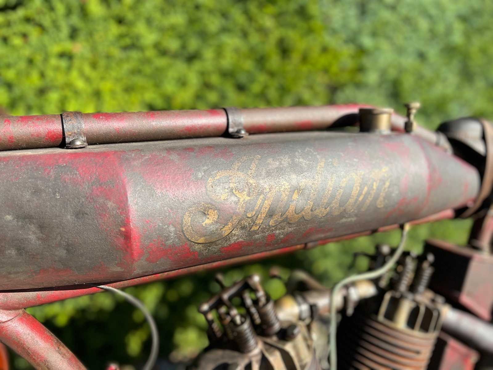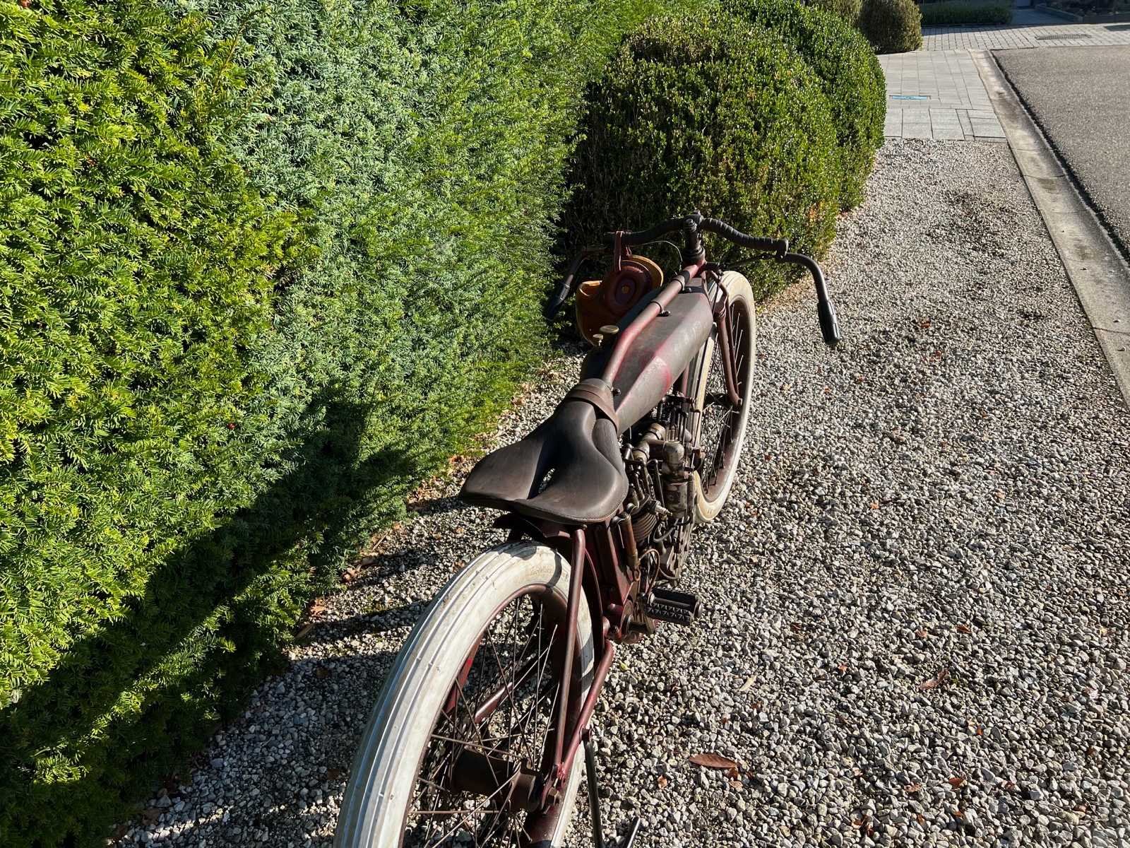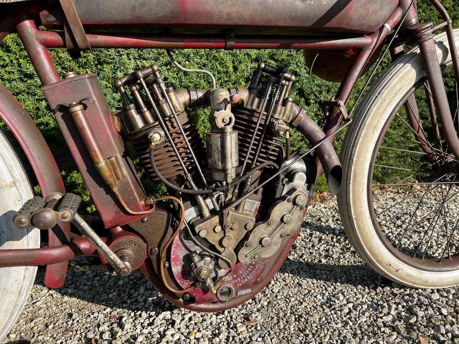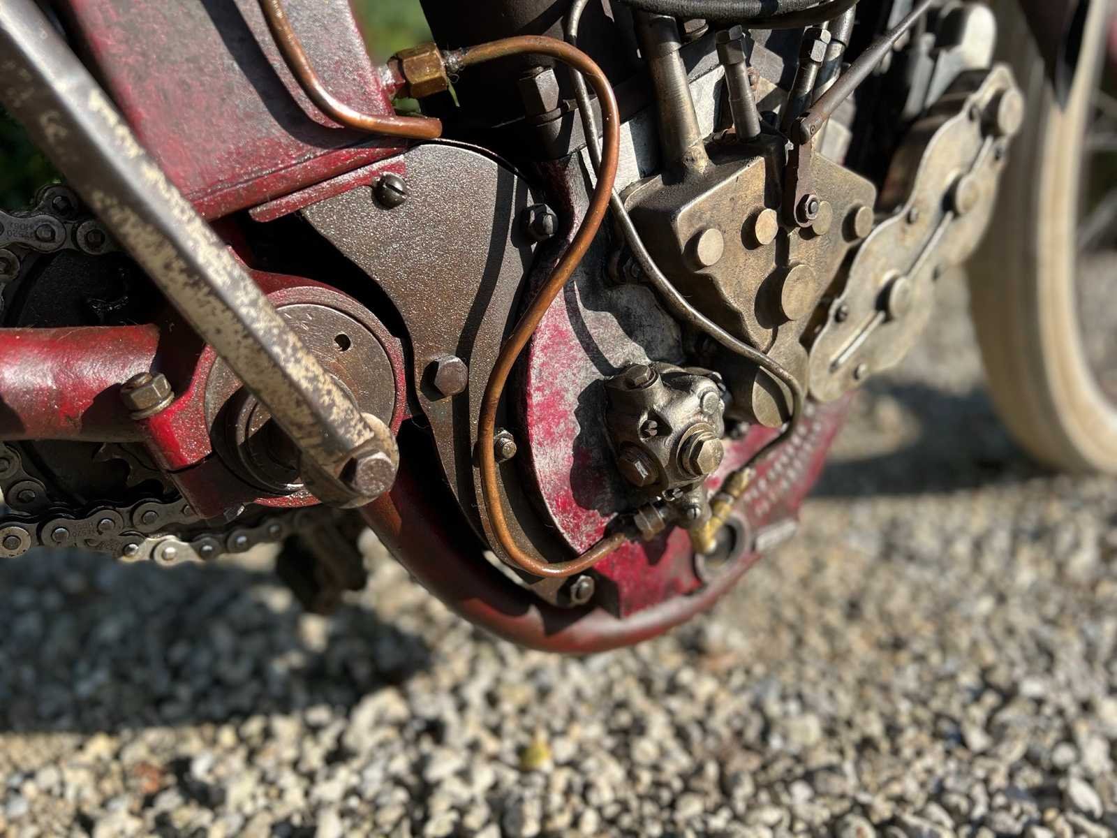 Indian 1000cc 8 klepper racer met een super patina en in rijdende staat... wie durft. Het normale model van indian was een kop-zijklepper. Voor racing maakte Indian een 4 (2 kleppen per cilinder) of 8 (4 kleppen per cilinder) racer. Deze zijn nooit verkocht ook al stonden ze in de cataloog maar werden enkel uitgeleend aan de fabrieksracers en aan de meest beloftevolle rijders. Zelden komen deze motorfietsen te koop. Dit zijn de motorfietsen die op de houten murderdromes snelheden behaalde van boven de 200km/h en dit in 1914! Deze motorfietsen werden op de kombanen in gang geduwd of door een andere motorfiets met behulp van een koord in gang getrokken. Daarna deden ze een toer achter de pacecar en hadden ze een vliegende start voor de race (hier een mooi filmpje hiervan : https://youtu.be/QPZY-MUx8qk ). Deze motorfietsen hadden geen remmen. Dit was te gevaarlijk om te rijden want men kon een achterliggende rijder hinderen door plots te remmen. Deze motorfietsen hadden ook geen gaskabel want ze werden meestal volgas gereden (bediend door een handel op de carburator) en snelheid werd geregeld met de voorontsteking en met de killswitch op het stuur. Nee Merk: 1914 Indian Model: 8 Valve Cilinderinhoud: 1000cc Startinformatie: Start en rijdt
