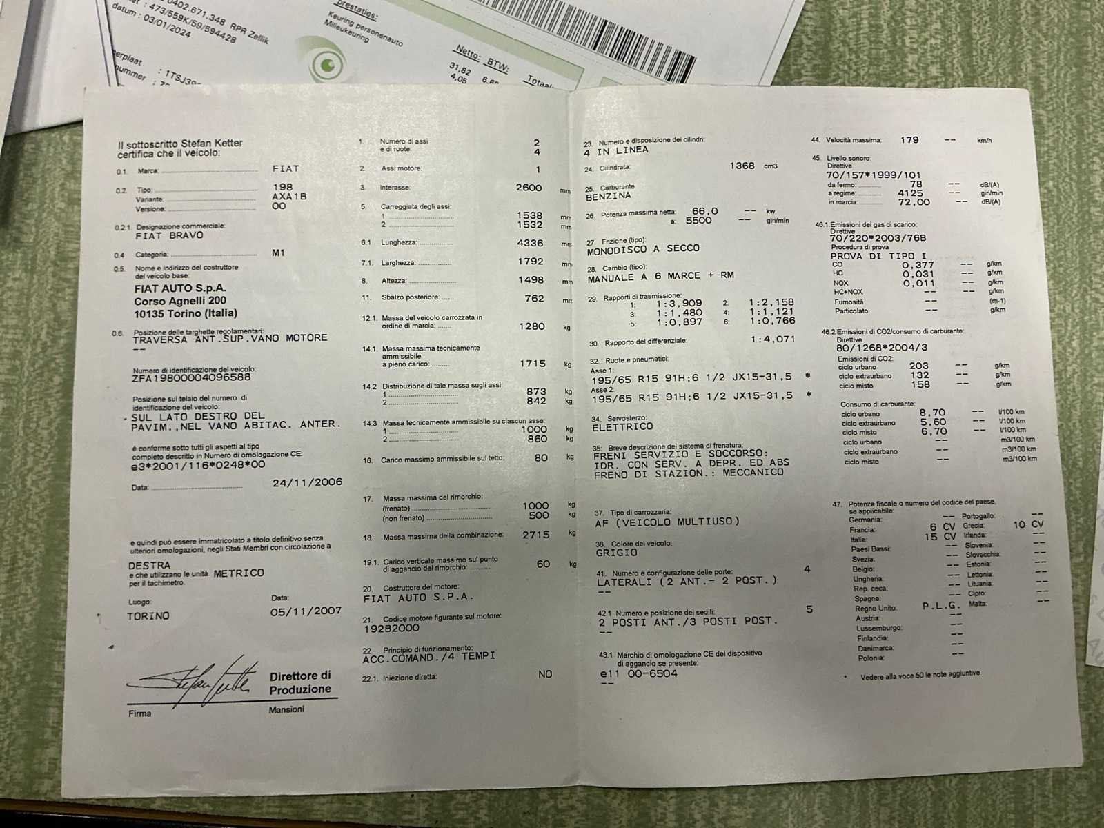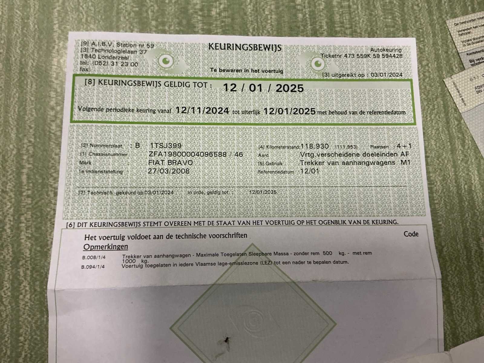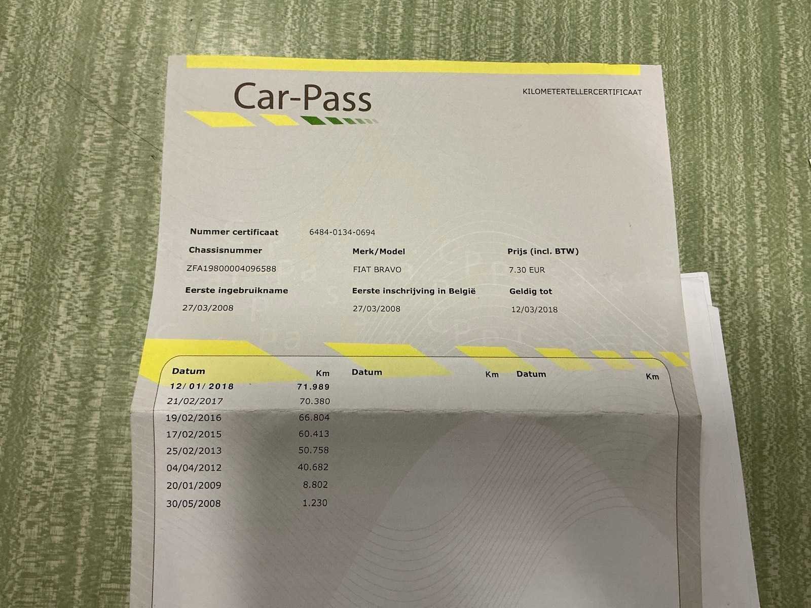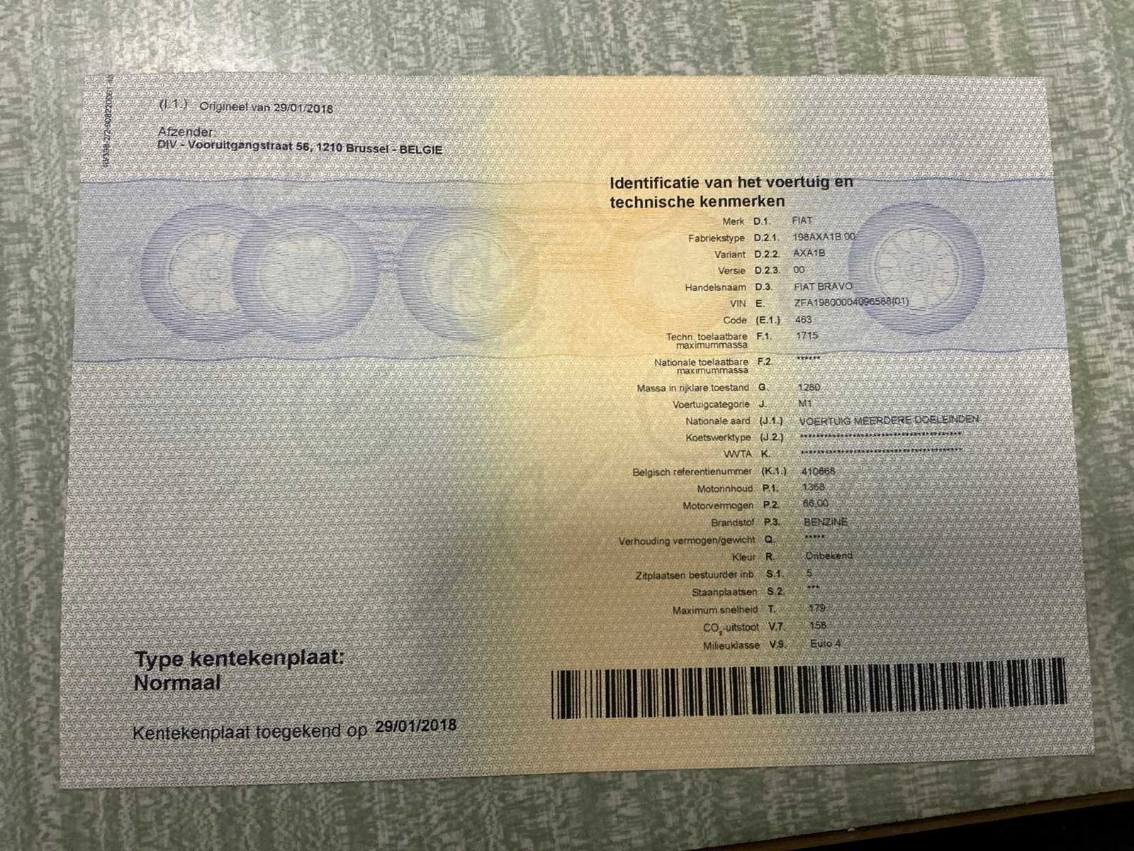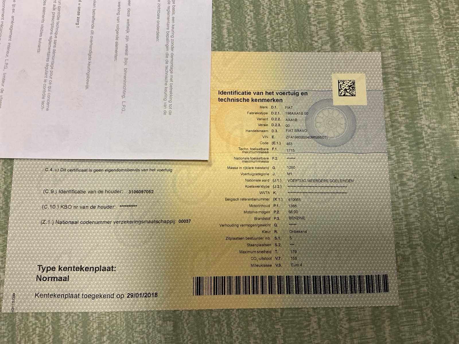 Fiat Bravo uit 2008 met 128428 kilometers op de teller. Oppervlakkige lakschade. In werkende staat. Nee Merk: Fiat Model: Bravo Bouwjaar: 2008 Afgelezen kilometerstand: 128428km Cilinderinhoud: 1368cc Vermogen (kW): 66kW Brandstof: benzine Chassisnummer: ZFA198000040965588 Datum eerste toelating: 27/03/2008 Aantal zitplaatsen: 5 Transmissie: Handgeschakeld Emissieklasse: Euro 4 Nationaliteit documenten: België Gelijkvormigheidsattest aanwezig: true Start en rijdt: Ja Vavato voert geen technische keuring uit.: true Inschrijvingsbewijs - deel 1 : Aanwezig Inschrijvingsbewijs - deel 2: Aanwezig