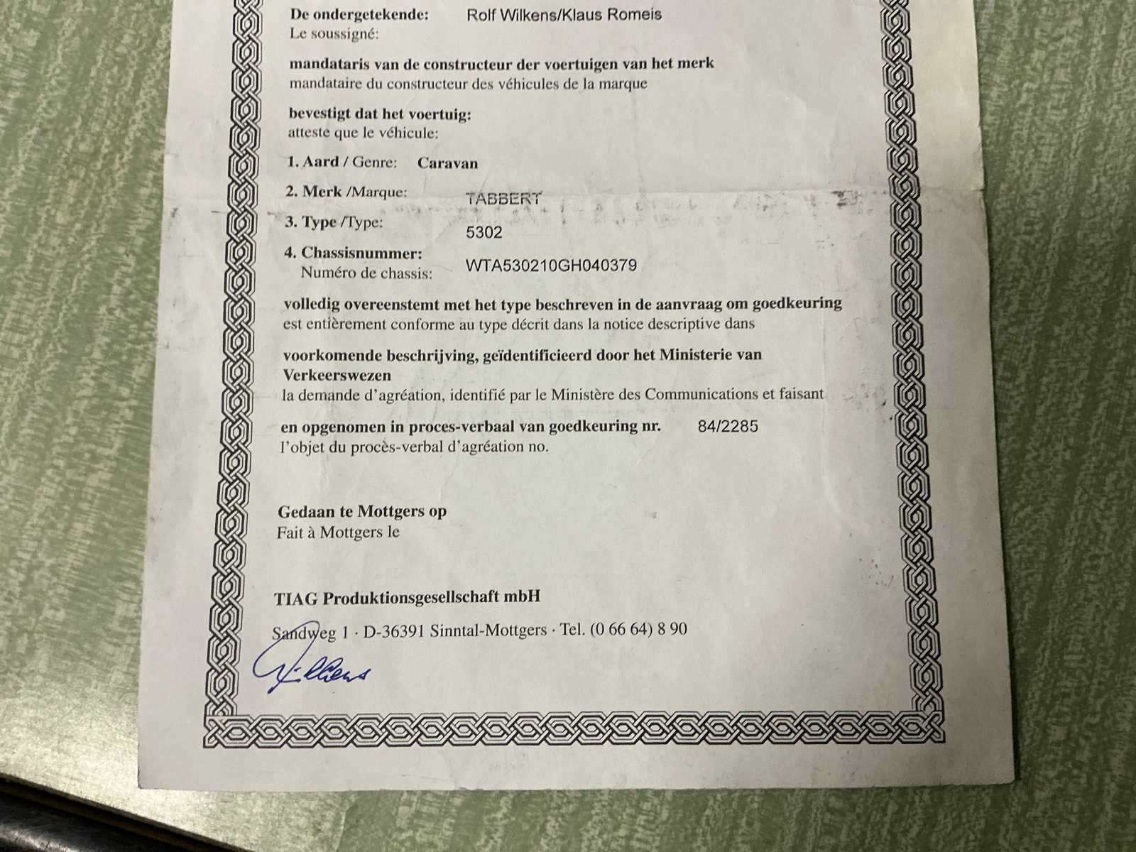 In gebruikte staat. Nee Merk: Tabbert Model: 5302 Chassisnummer: WTA530210GH040379