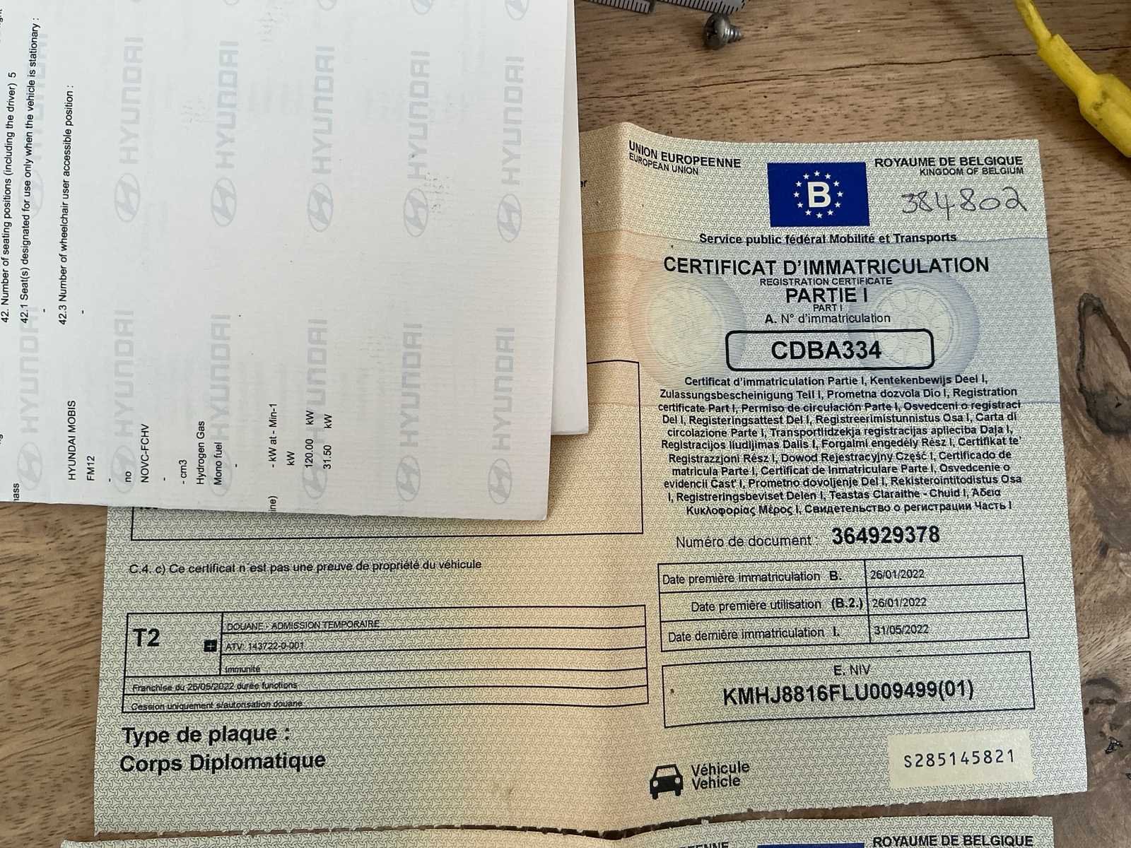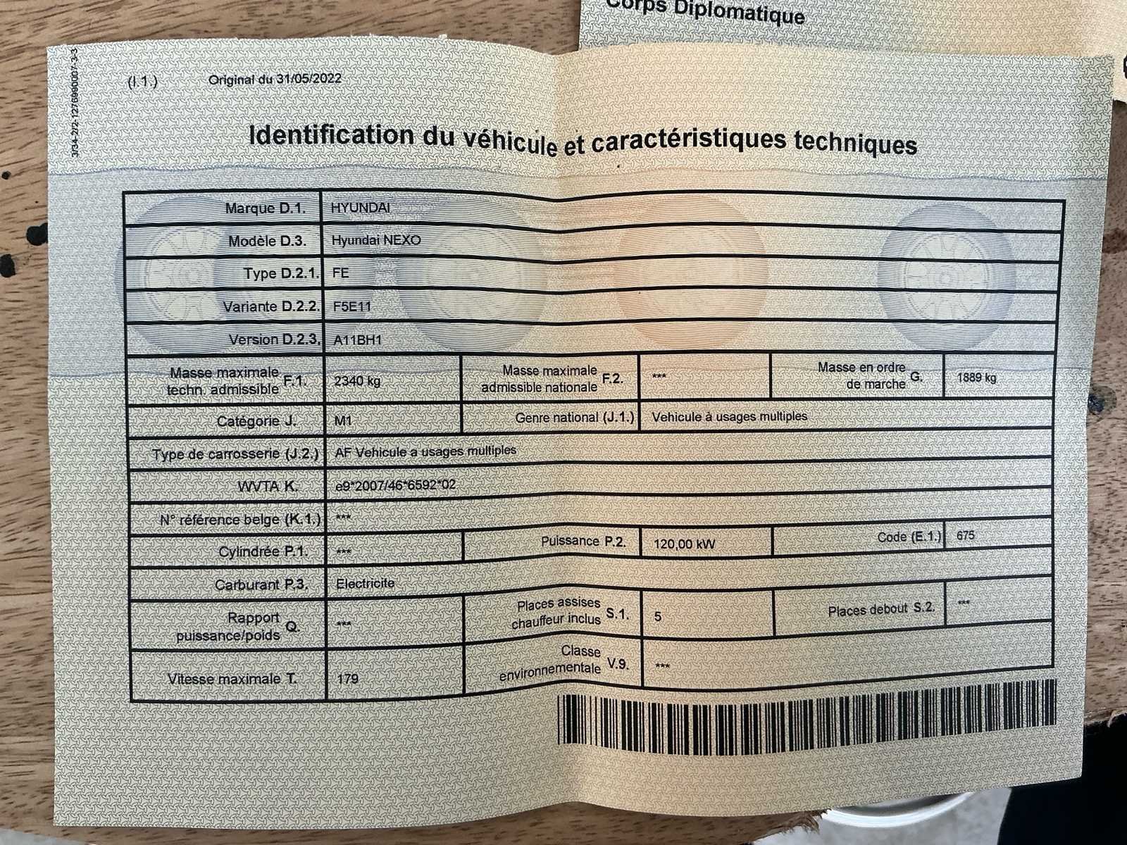No Kenteken: CDBA334 Merk: Hyundai Model: Nexo Type: FE Bouwjaar: 2022 Afgelezen kilometerstand: 46346km Vermogen (kW): 120kW Brandstof: Waterstof Electrisch via een brandstofcel Chassisnummer: KMHJ8816FLU009499 Datum eerste toelating: 26/01/2022 Aantal zitplaatsen: 5 Transmissie: Automaat Aantal sleutels: 2 Gelijkvormigheidsattest aanwezig: true Start en rijdt: Ja Vavato voert geen technische keuring uit.: true Inschrijvingsbewijs - deel 1 : Aanwezig Inschrijvingsbewijs - deel 2: Aanwezig