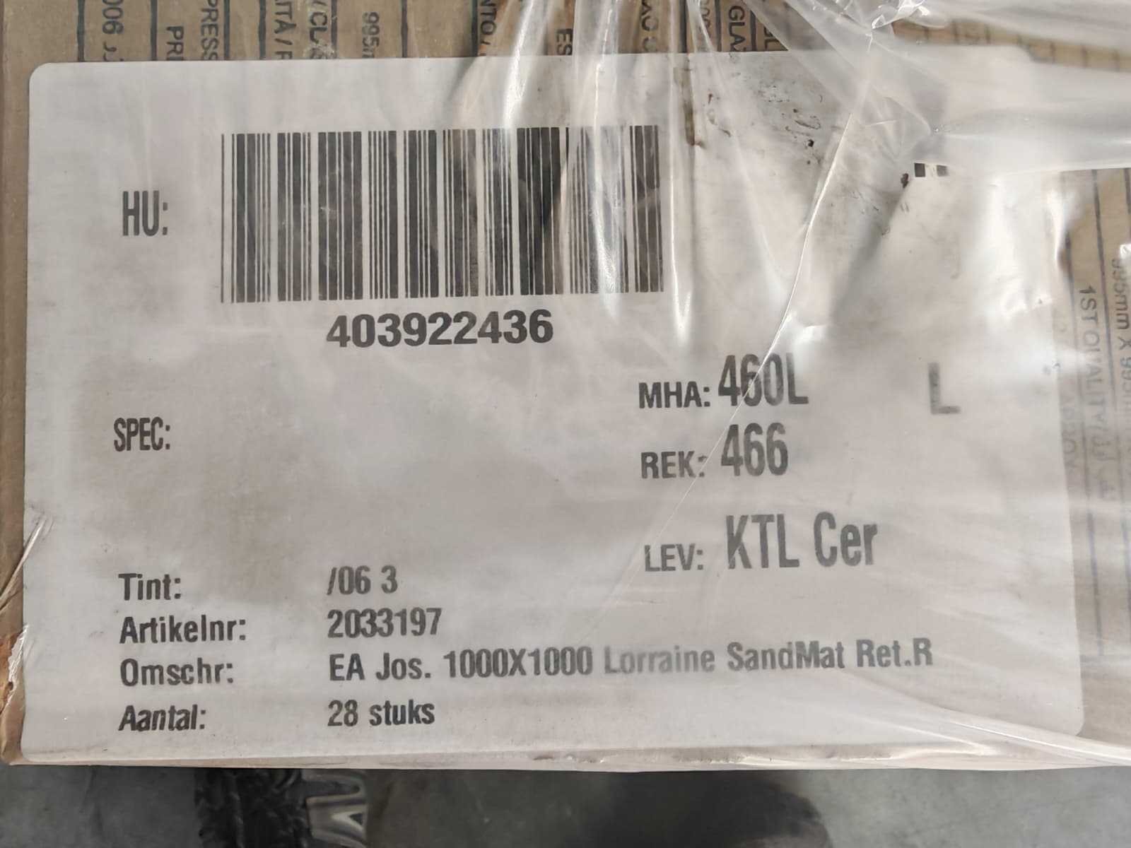 No Merk: Jos Kleur: Sand Afwerking: Mat R9 Lengte: 1000mm Breedte: 1000mm Dikte: 9mm Materiaal: Keramiek Type: Vloertegel Model: Lorraine Aantal m² per verpakking: 2m² Aantal pakken: 14 Totaal oppervlakte: 28m² Totaal gewicht: 560kg