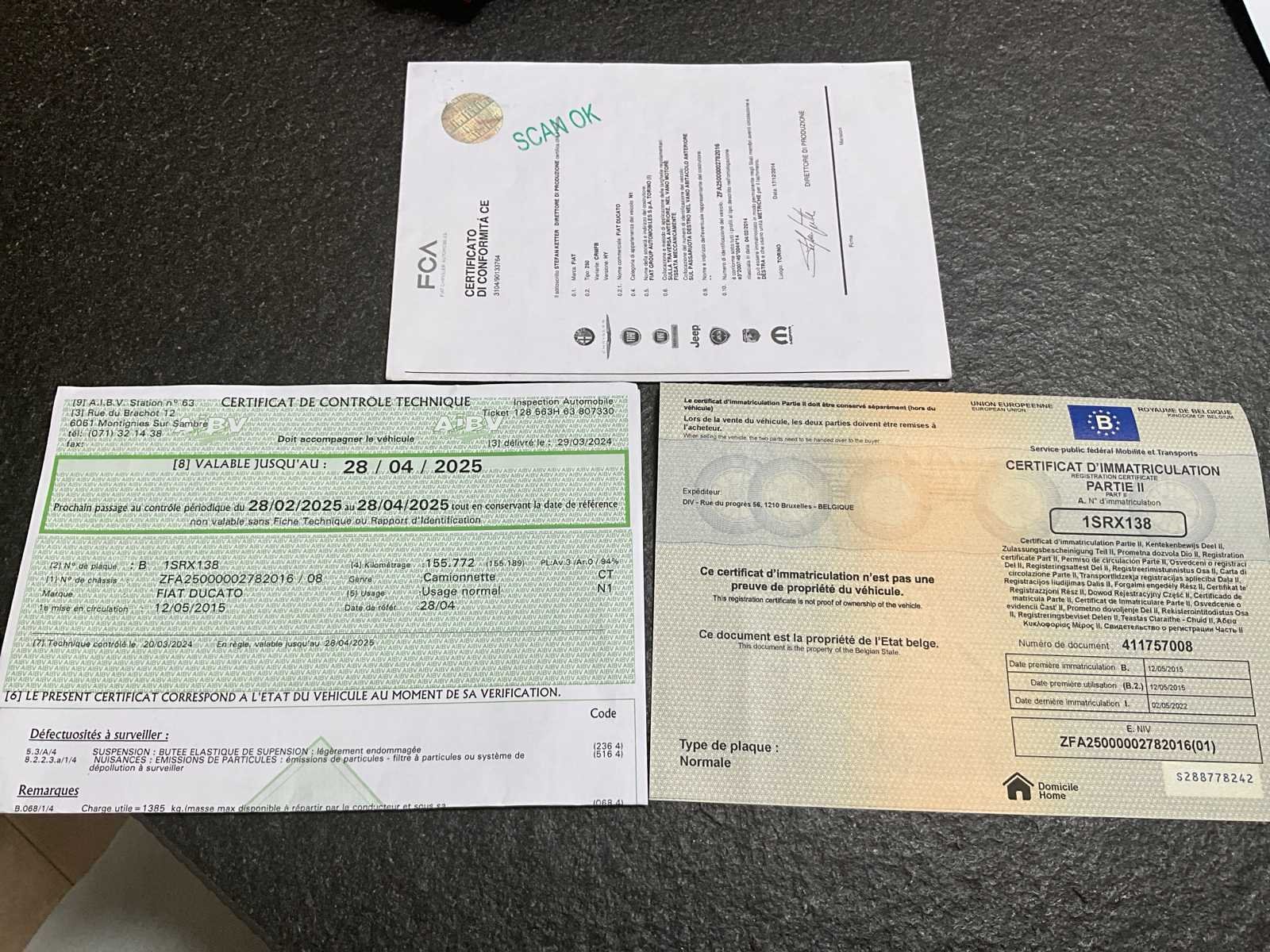 Fiat Ducato van het bouwjaar 2015. De wagen start en rijdt. Documenten aanwezig. Nee Merk: Fiat Model: Ducato Bouwjaar: 2015 Afgelezen kilometerstand: 159744km Cilinderinhoud: 1956cc Vermogen (kW): 85kW Brandstof: diesel Chassisnummer: ZFA25000002782016 Datum eerste toelating: 12/05/2015 Aantal zitplaatsen: 3 Kleur: Wit Transmissie: Handgeschakeld Emissieklasse: Euro 5b Aantal sleutels: 1 Nationaliteit documenten: België Start en rijdt: Ja Vavato voert geen technische keuring uit.: true Inschrijvingsbewijs - deel 1 : Aanwezig Inschrijvingsbewijs - deel 2: Aanwezig