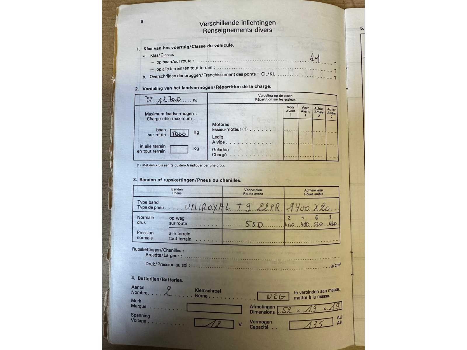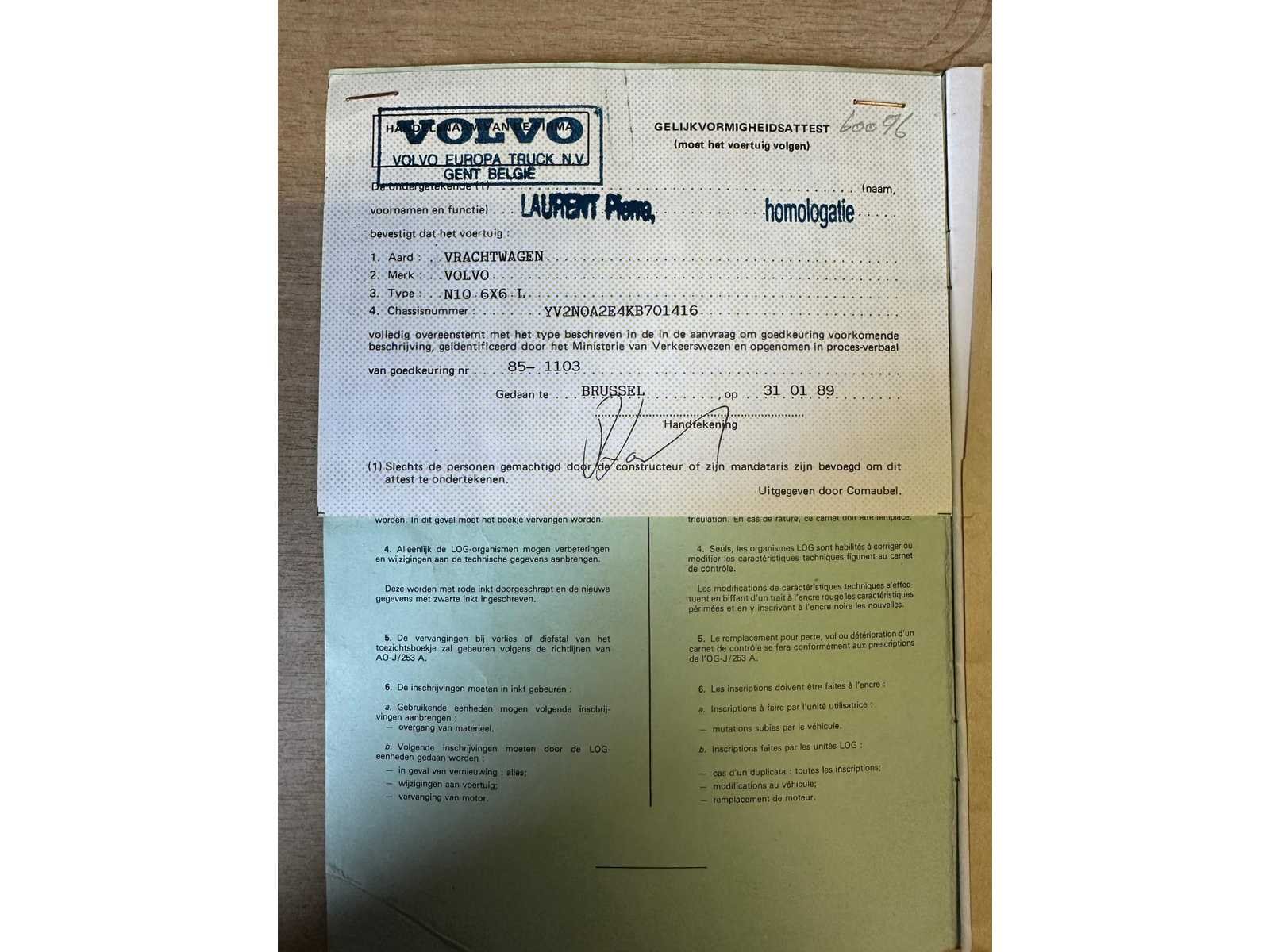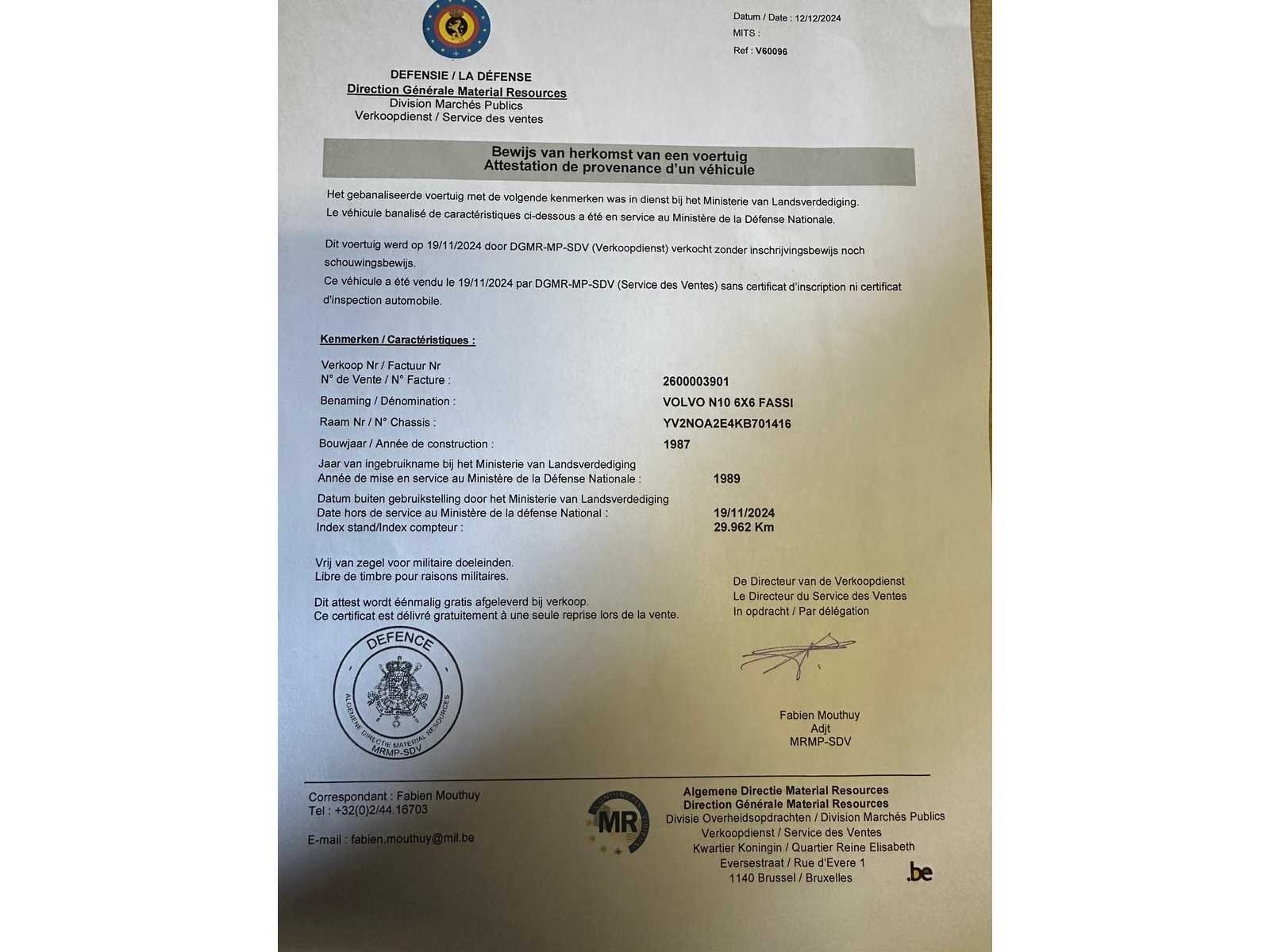 “Het voertuig wordt afgeleverd met een gelijkvormigheidsattest en een bewijs van herkomst. Het wordt verkocht zonder inschrijvingsbewijs en zonder keuringsbewijs.” Nee Merk: Volvo Type: N10 Turbo 6X6 L Bouwjaar: 1989 Chassisnummer VIN: YV2N0A2E4KB701416 Kilometerstand bij opname: 29970km Fuel Type: Diesel