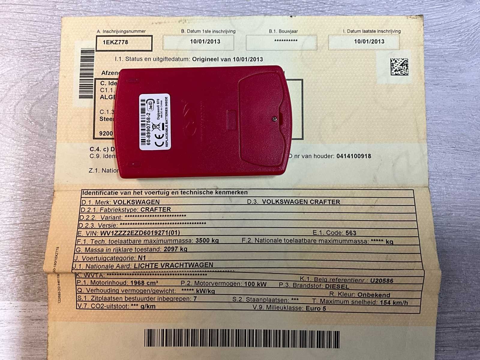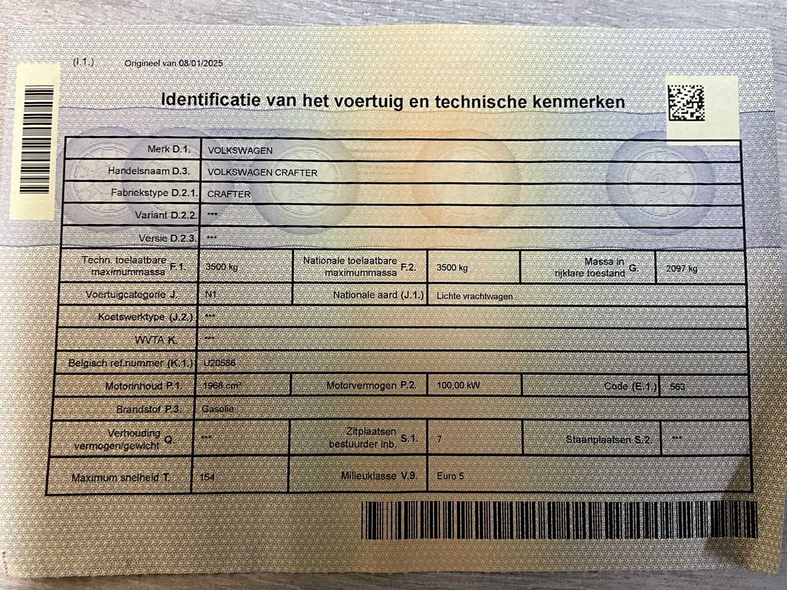 Wordt geleverd met attest van verlies deel 2 kentekenbewijs - 7 personen - 6 versnellingen - gebruikssporen carrosserie - bestuurderszetel + spiegels beschadigd - start, rijdt, remt No Merk: VW Model: Crafter Type: lichte vracht - 7 personen Bouwjaar: 2013 Afgelezen kilometerstand: 286147km Cilinderinhoud: 1968cc Vermogen (kW): 100kW Brandstof: diesel Chassisnummer: WV1ZZZ2EZD6019271 Laadvermogen: 1325kg Datum eerste toelating: 10/1/2013 Emissieklasse: Euro 5 Ledig gewicht: 2100kg Nationaliteit documenten: B Gelijkvormigheidsattest aanwezig: true Start en rijdt: ja Keuringsrapport geldig tot: 30/12/2025 Zichtbare schade: ja Vavato voert geen technische keuring uit.: true