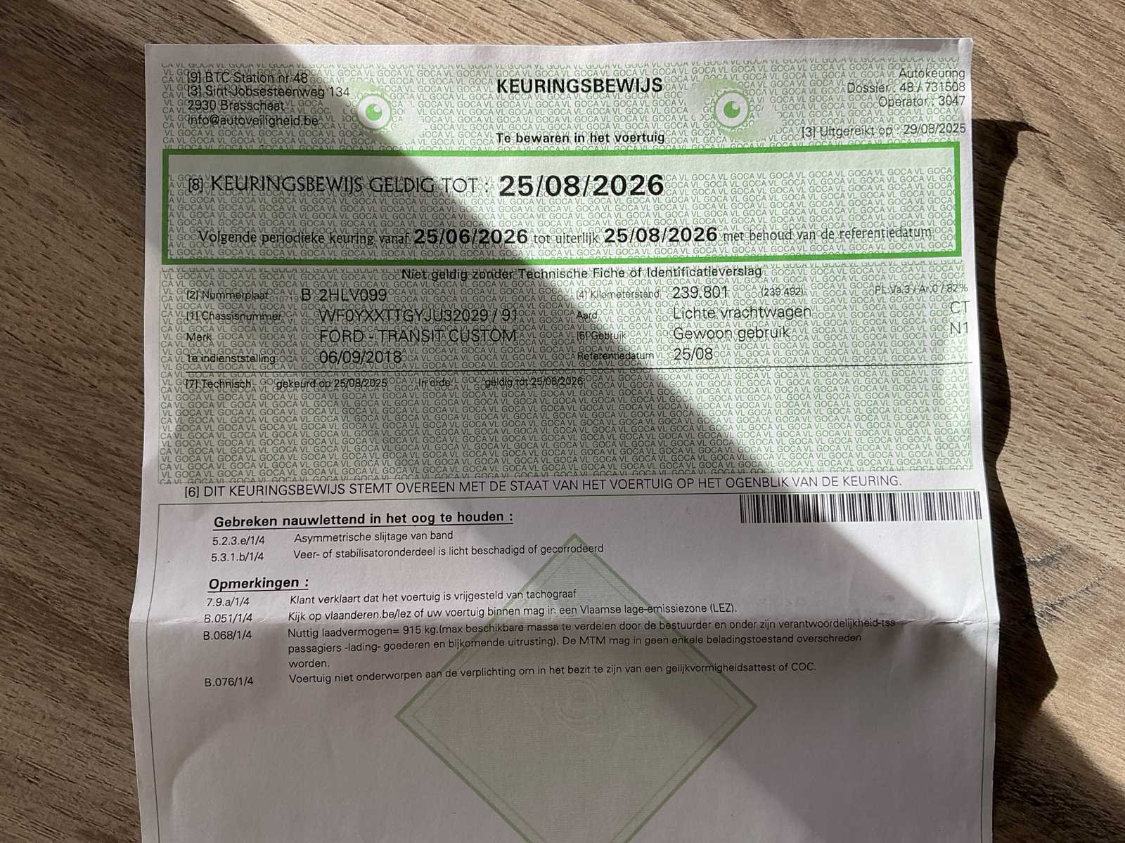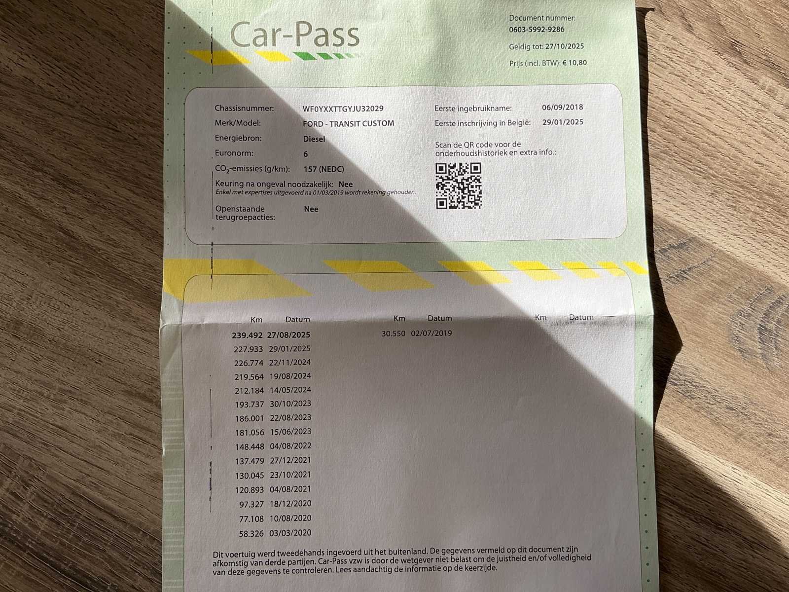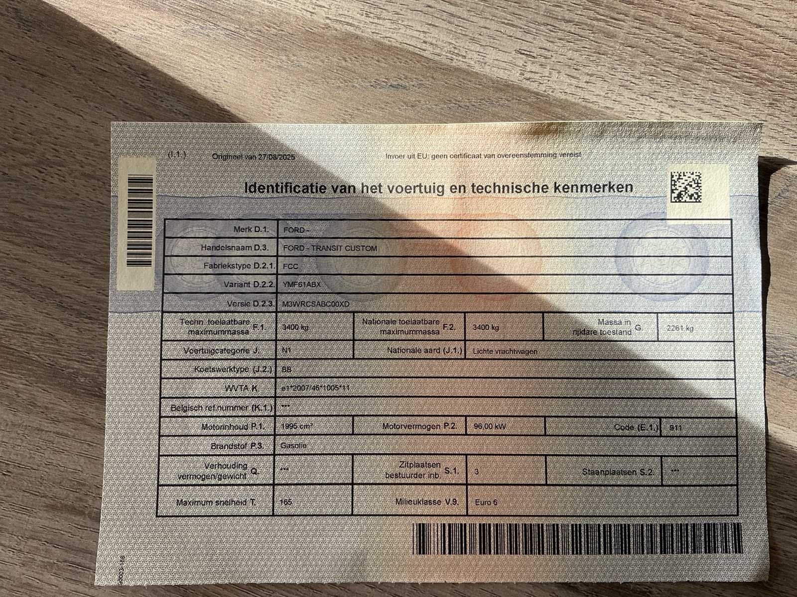 Ford Transit Costum Ongeval vrije wagen Onderhoudhistorie aanwezig Exterieur / interieur perfecte conditie. No Merk: Ford Model: Transit Costum Bouwjaar: 2018 Afgelezen kilometerstand: 249544km Cilinderinhoud: 1995cc Vermogen (kW): 96kW Brandstof: Diesel Chassisnummer: WF0YXXTTGYJU32029 Laadvermogen: 3400kg Datum eerste toelating: 06/09/2018 Aantal zitplaatsen: 3 Kleur: Wit Transmissie: Handgeschakeld Aantal deuren: 4 Aantal sleutels: 2 Nationaliteit documenten: Belgisch Onderhoudshistorie: Ja Gelijkvormigheidsattest aanwezig: true Carpass: true Start en rijdt: Ja Keuringsrapport geldig tot: 25/08/2026 Vavato voert geen technische keuring uit.: true Airconditioning: true Navigatie: true Inschrijvingsbewijs - deel 1 : Ja Inschrijvingsbewijs - deel 2: Ja